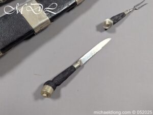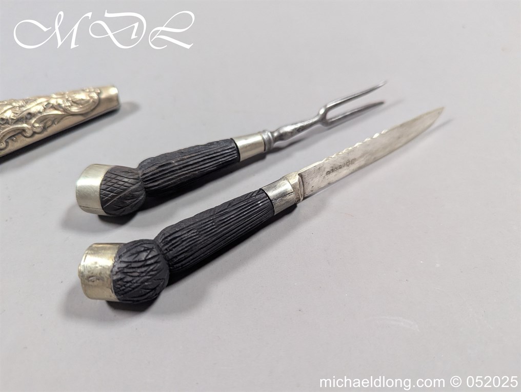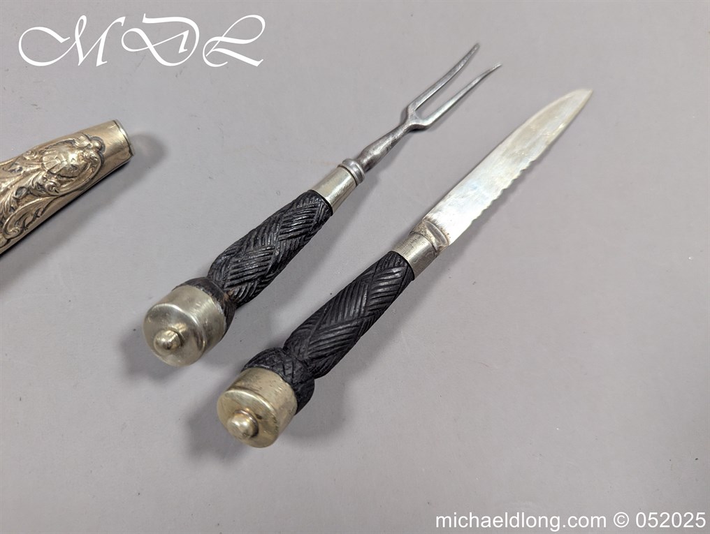 Scottish Edwardian Dirk by R G Lawrie Glasgow, carved hilt with floral decoration and claw mount securing pommel stone. The 11-inch blade with two fullers and notched spine. The black leather scabbard with matching mounts the top one maker marked. Complete with knife and fork ensuite overall length 16.5 inches