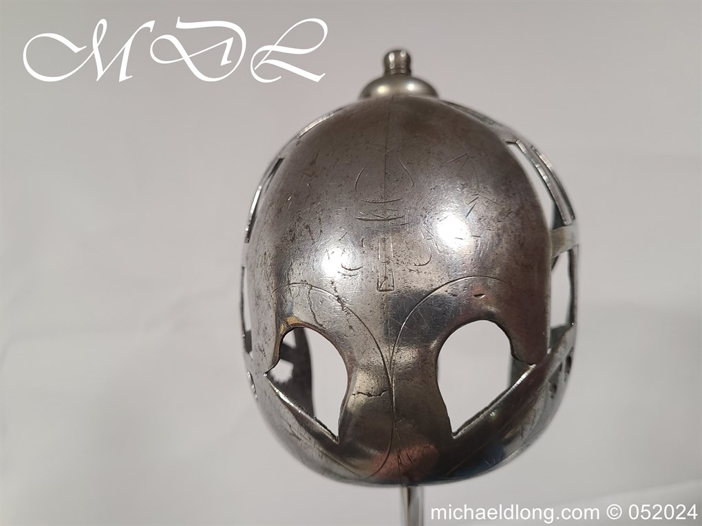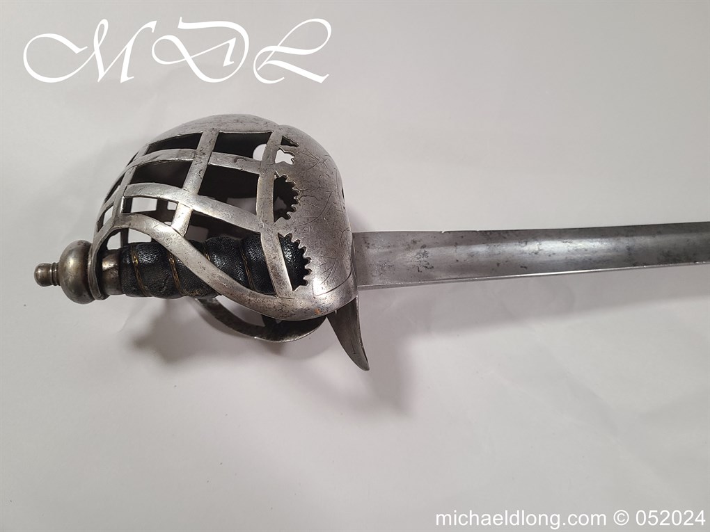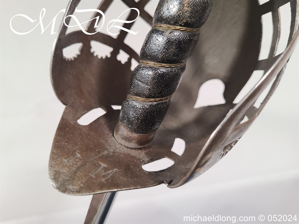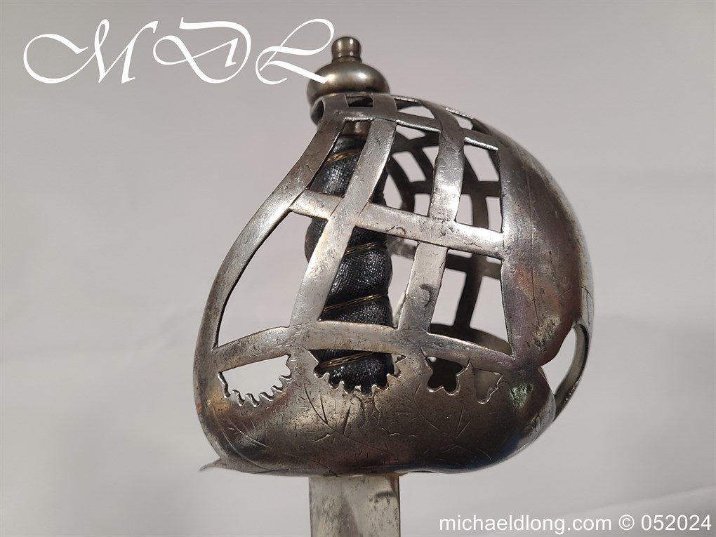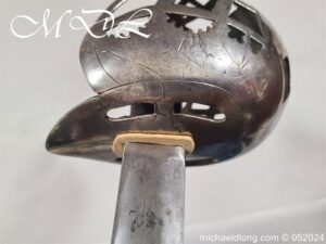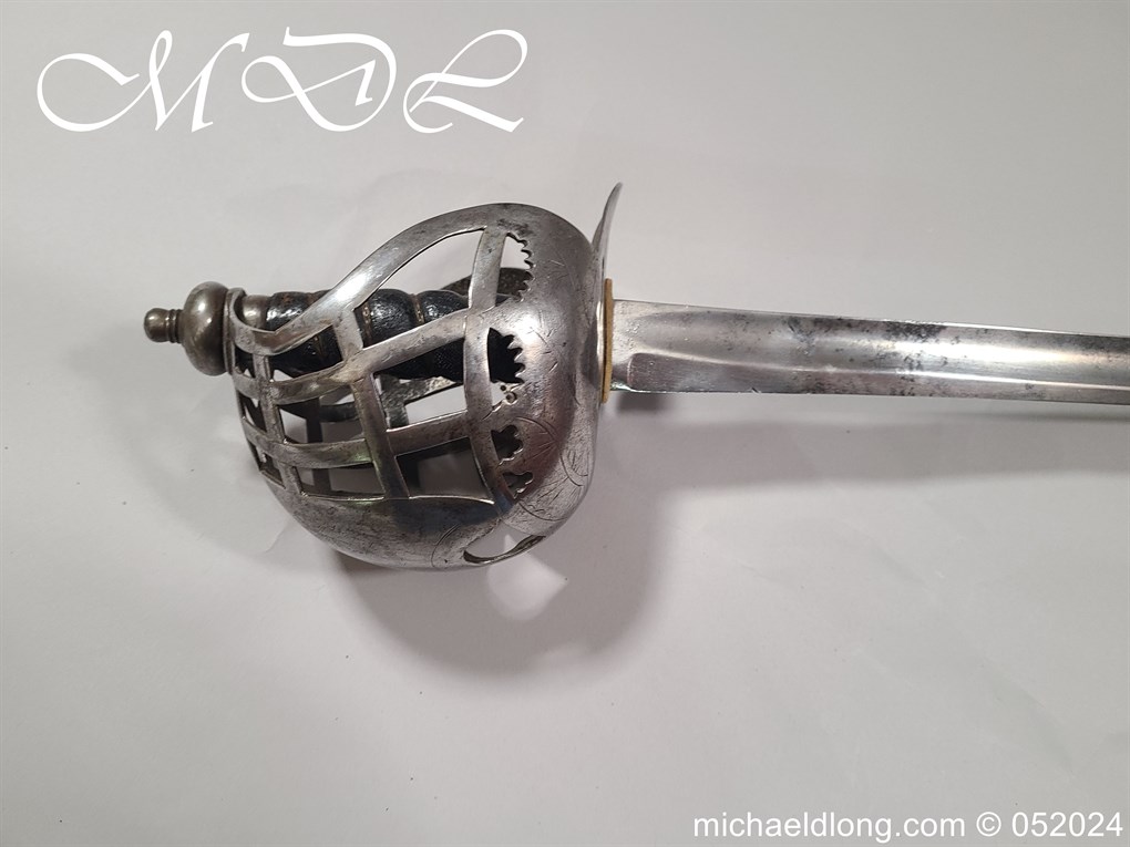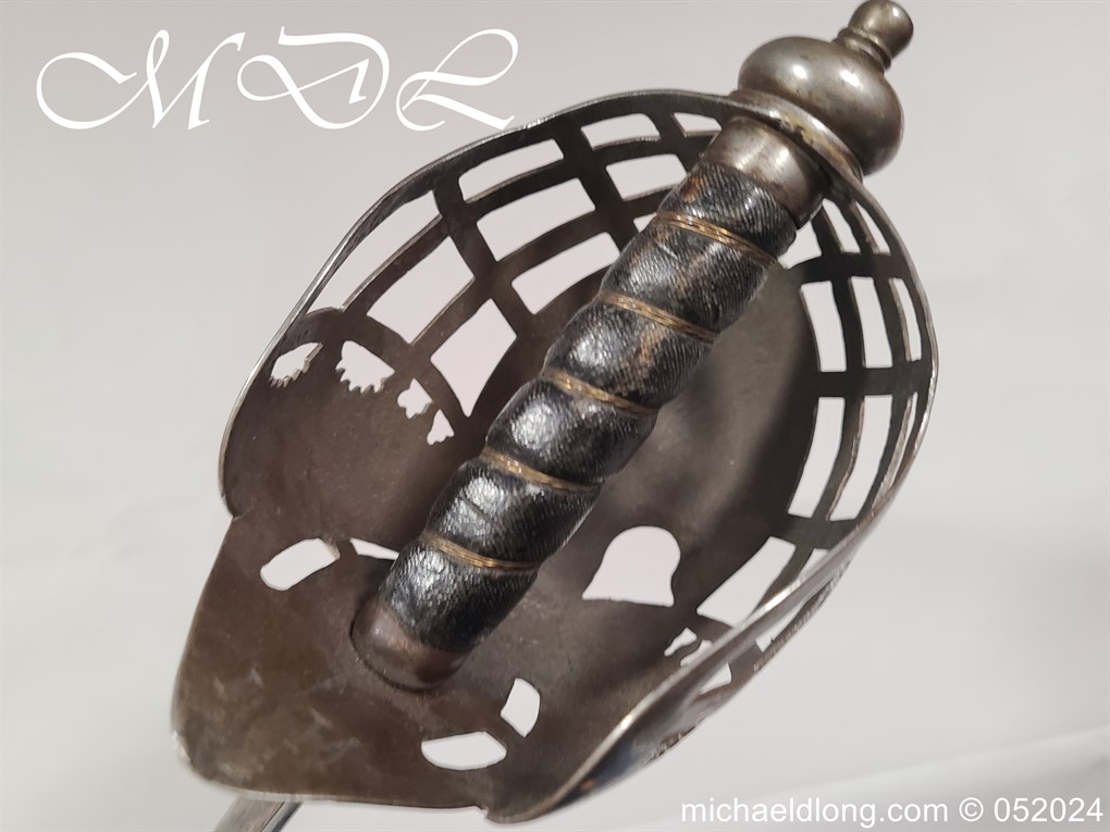 A rare basket-hilted sword for an officer of the Fencibles, 1794 circa. Single edged blade with wide fuller the spine maker marked Woolley and Co. Basket-shaped hilt with flattened bars and consisting of two halves with engraved decoration, the central part featuring the large Georgian crown, round pommel with extended tang button, and fish-skin grip secured by twisted brass wire. Information: The Fencibles from the word defencible were British regiments raised in the United Kingdom, Isle of Man and in the colonies for defence against the threat of invasion during the Seven Years’ War Blade Length: 77cm Overall Length: 92cm