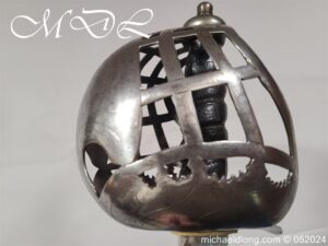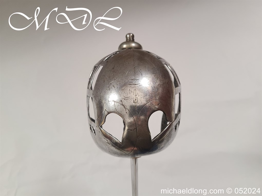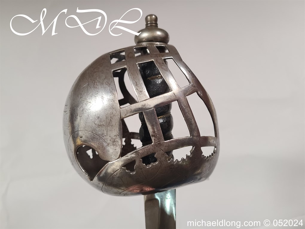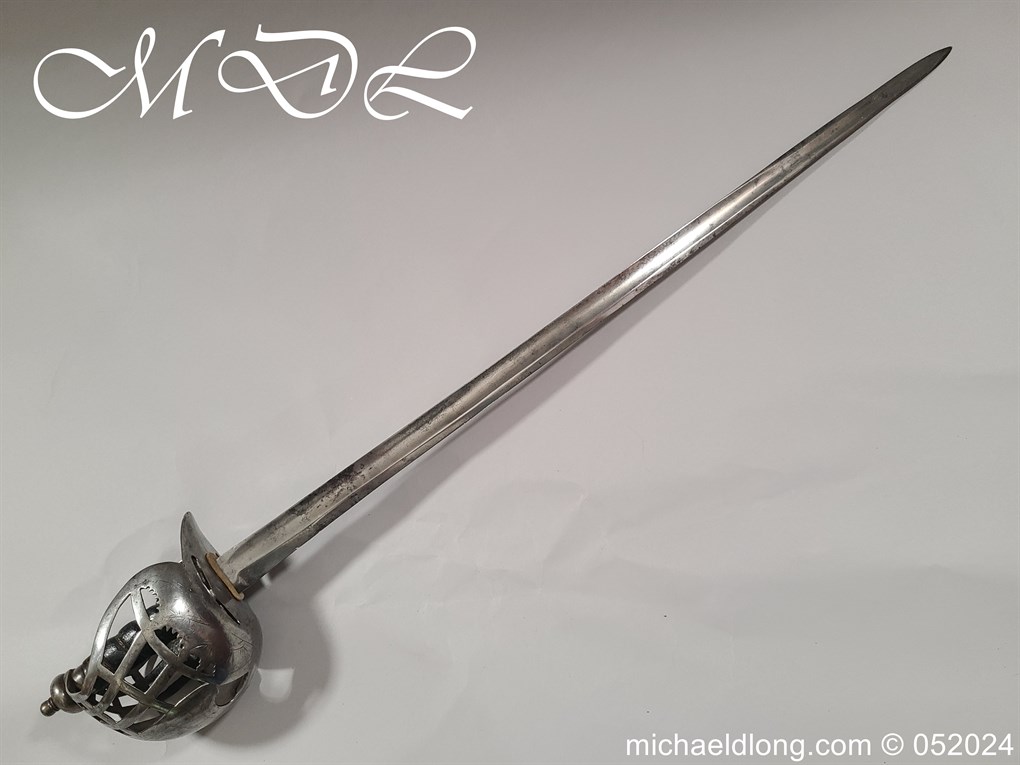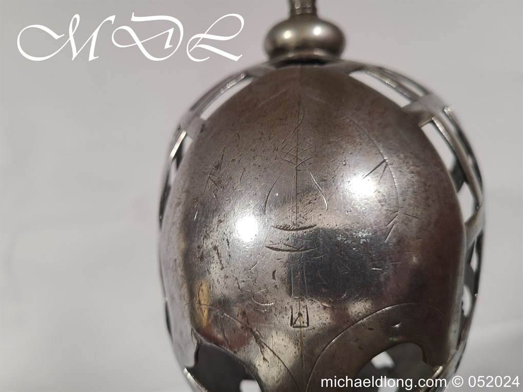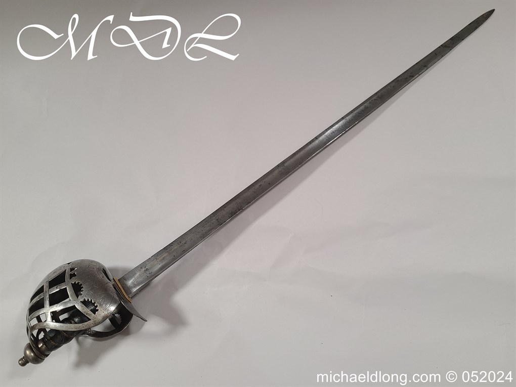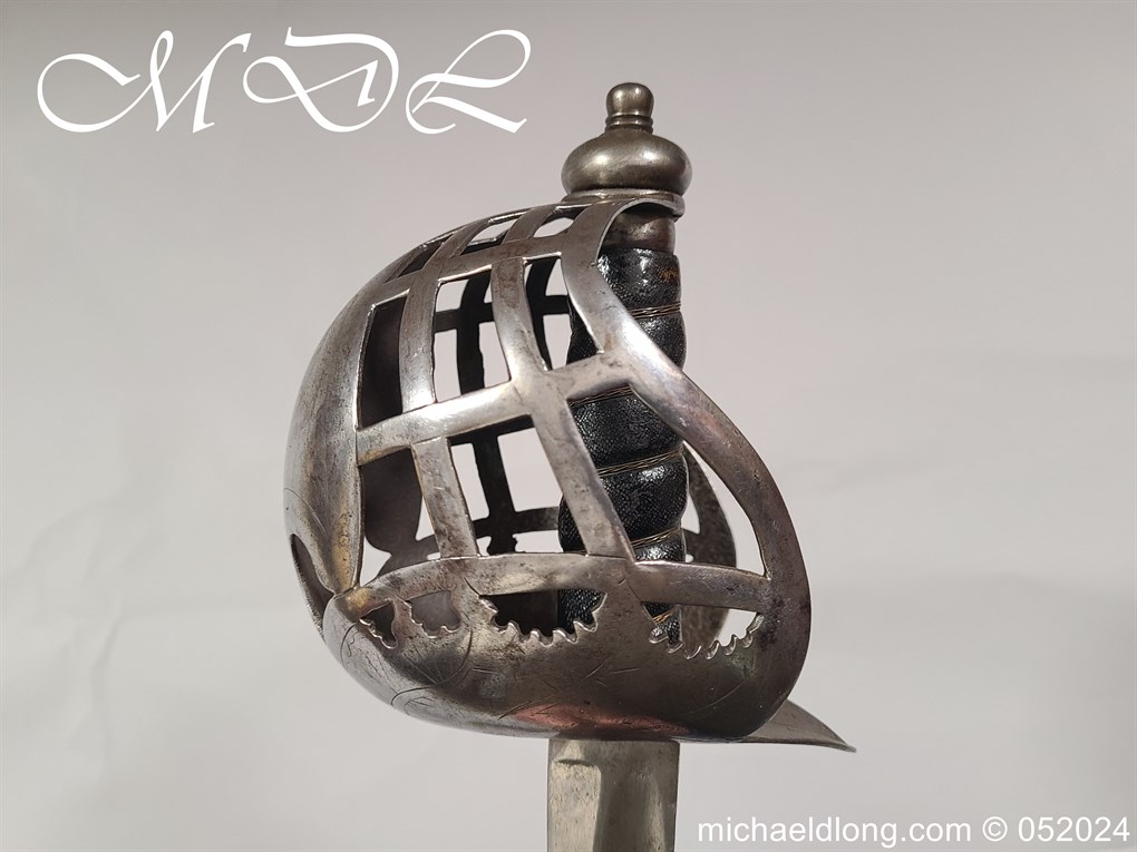 A rare basket-hilted sword for an officer of the Fencibles, 1794 circa. Single edged blade with wide fuller the spine maker marked Woolley and Co. Basket-shaped hilt with flattened bars and consisting of two halves with engraved decoration, the central part featuring the large Georgian crown, round pommel with extended tang button, and fish-skin grip secured by twisted brass wire. Information: The Fencibles from the word defencible were British regiments raised in the United Kingdom, Isle of Man and in the colonies for defence against the threat of invasion during the Seven Years’ War Blade Length: 77cm Overall Length: 92cm