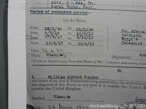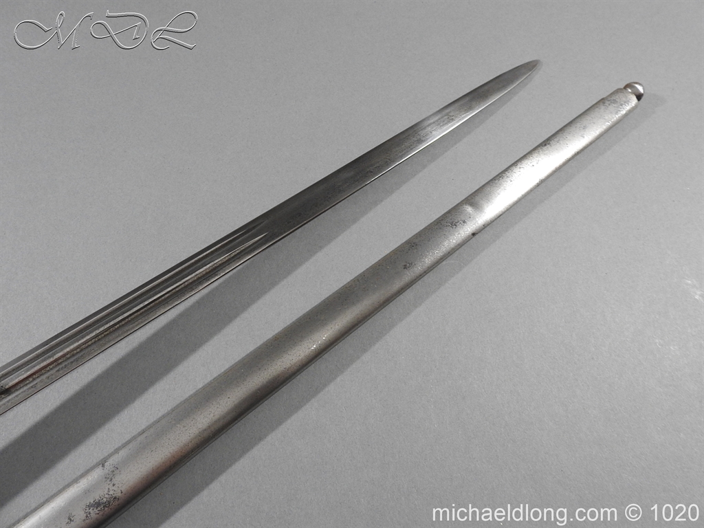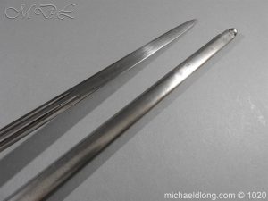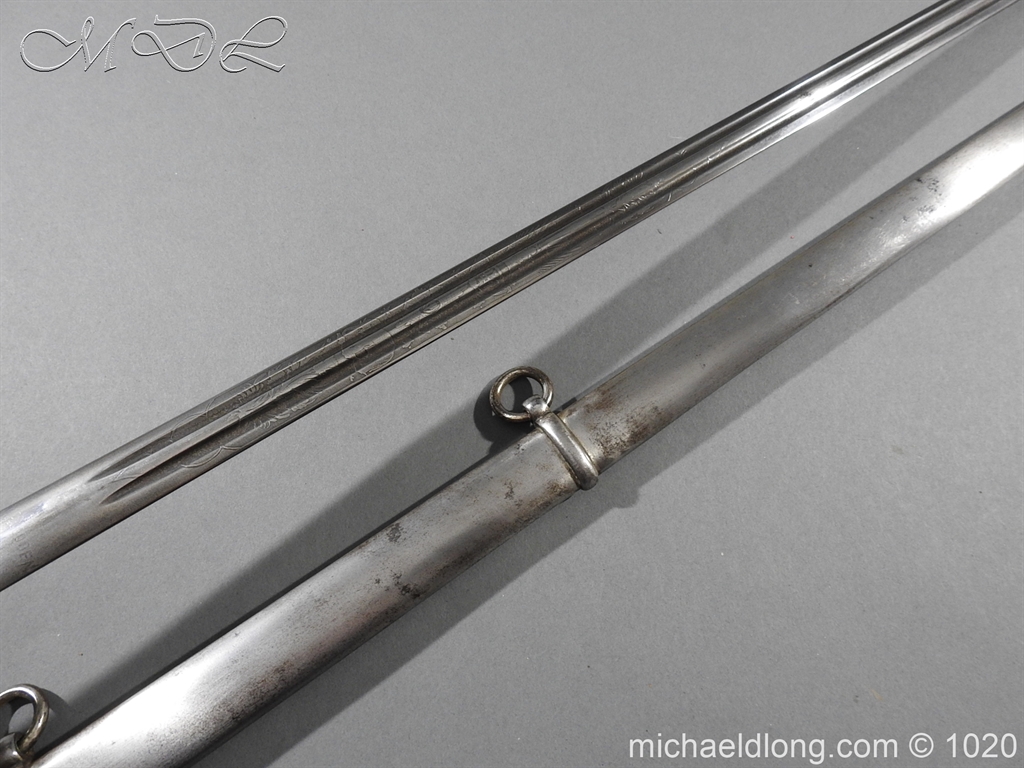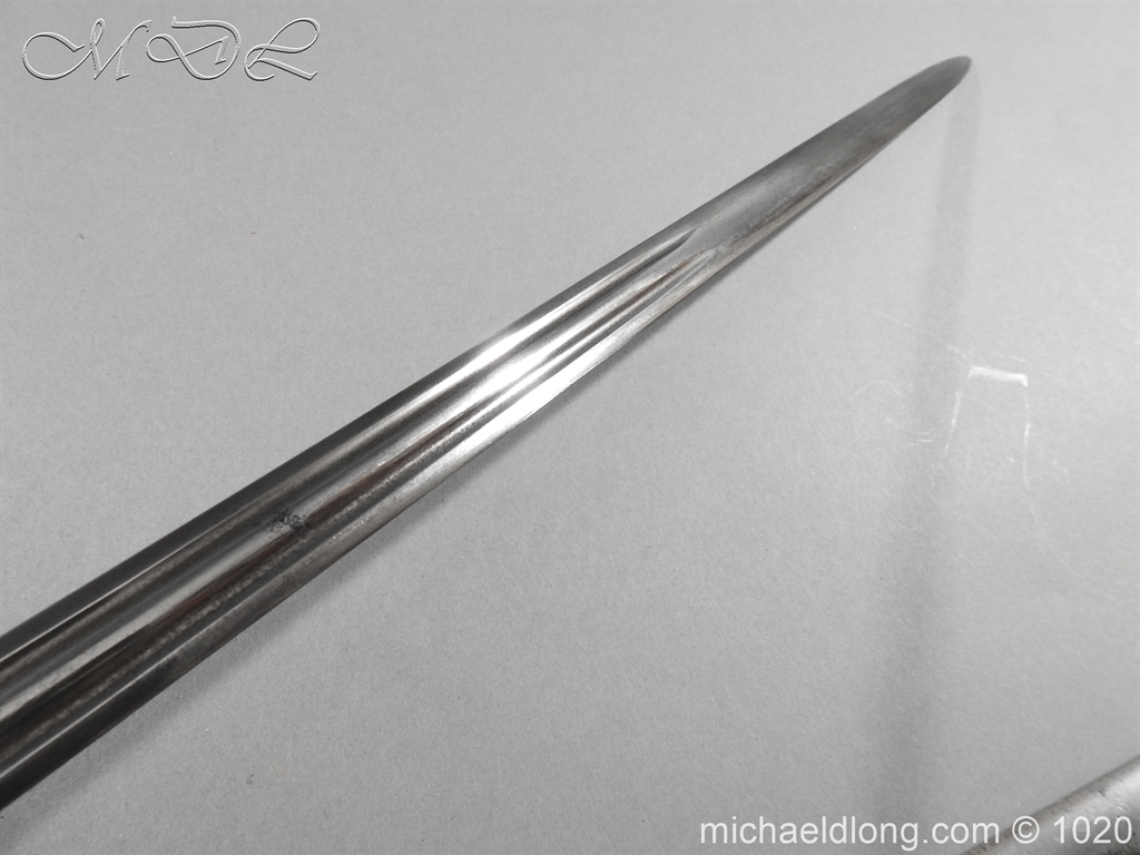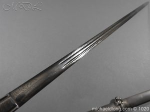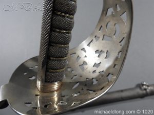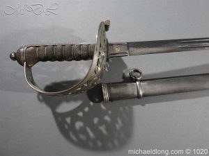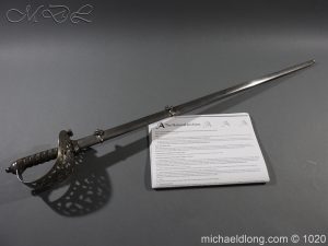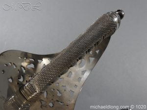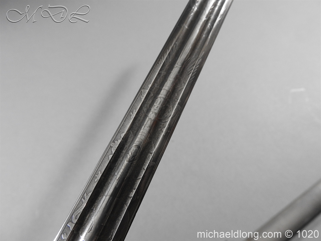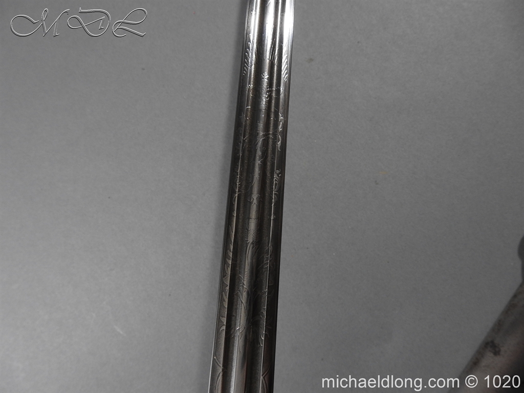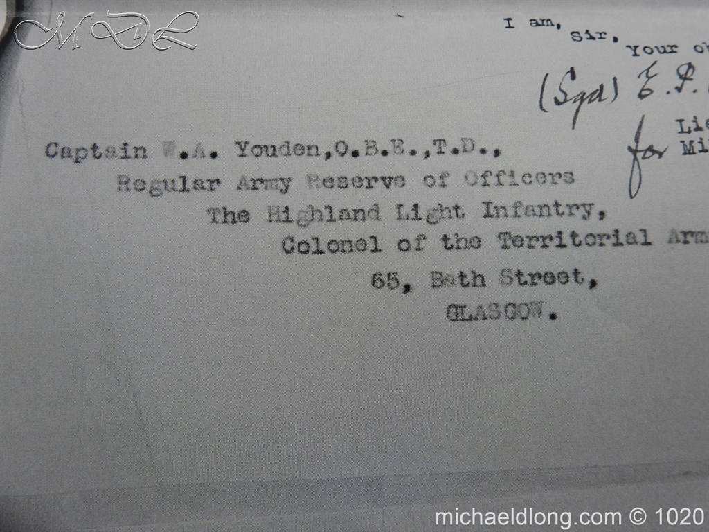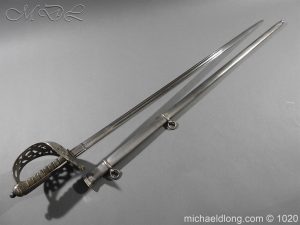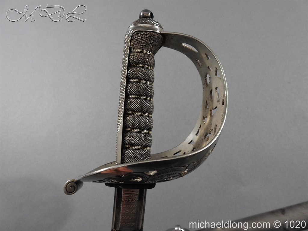 Victorian named Scottish Field Officer’s Sword Highland Light Infantry 82cm double fullered broadsword blade by Leckie Graham & Co, Union Street Glasgow, etched with thistles, crowned VR cypher, regimental badge, a thistle star and an elephant, and owner’s name W A Youden plated steel honeysuckle hilt with wire bound fish skin grip, in its steel scabbard with two suspension rings complete with research – Lieutenant 26/08/1896, 3rd Volunteer Btn H.L.I. Captain 07/03/1903 and later the 7th (T.F) H.L.I. Retires as an honorary major and placed on the Reserve of Officer’s