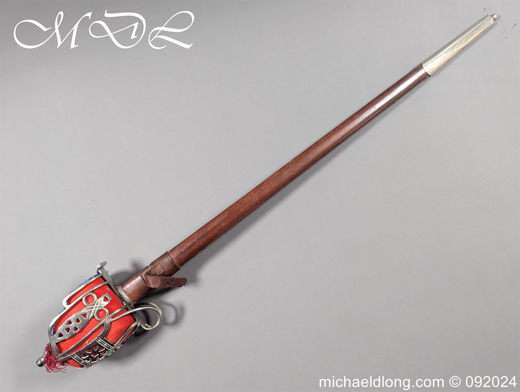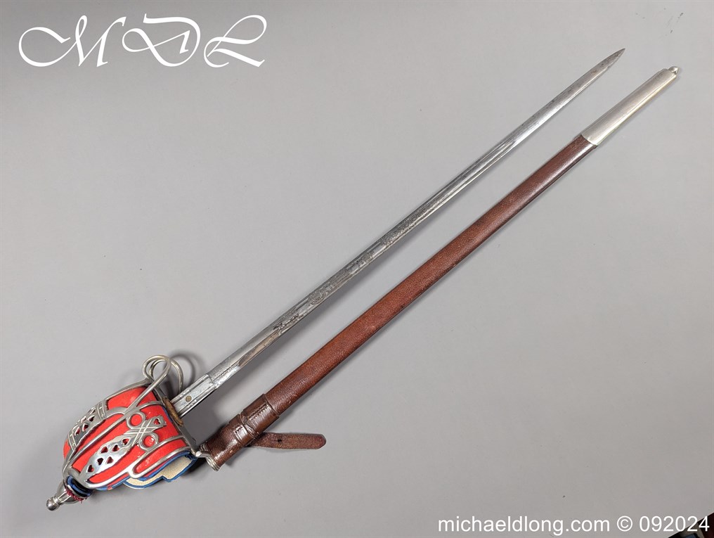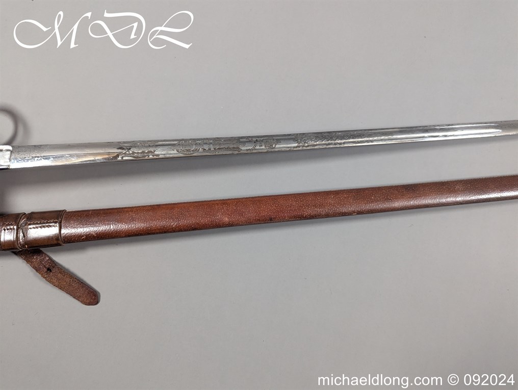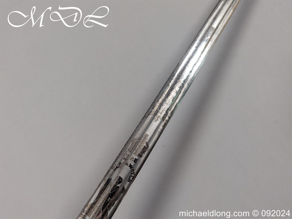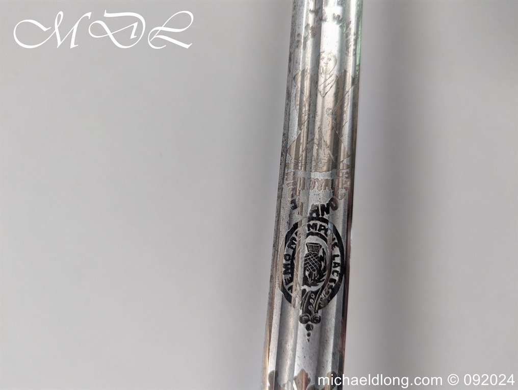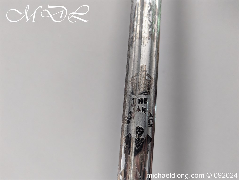 Scottish WW2 or WW1 Blackwatch Officer’s Sword. The sword with regulation hilt and complete with liner and fringe all in good condition. The broad sword blade with good etching including G R V Crown to one side the reverse with crown and regimental devises plus Blackwatch Royal Highlanders and brass proof plug. The scabbard field service in again nice condition with steel polish drag, for reference please see Swords of the British Army Revised Edition Page 160 Blade Length: 81.5cm Overall Length: 100cm