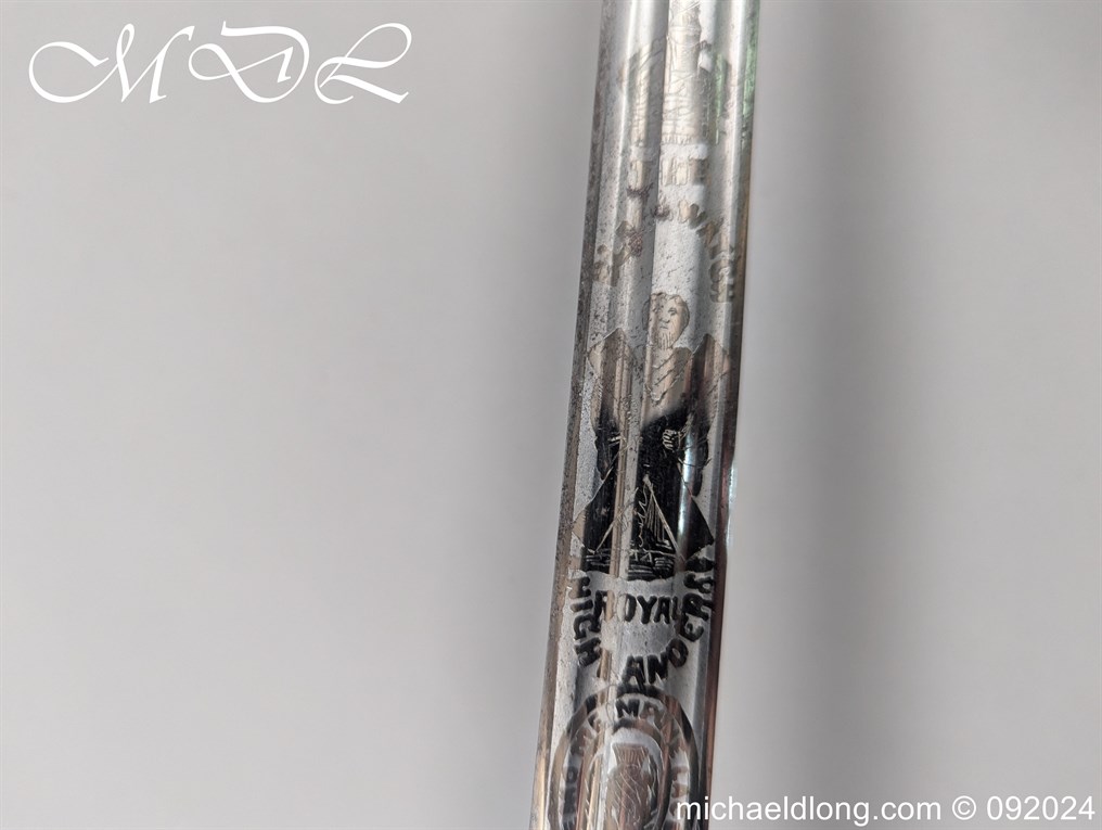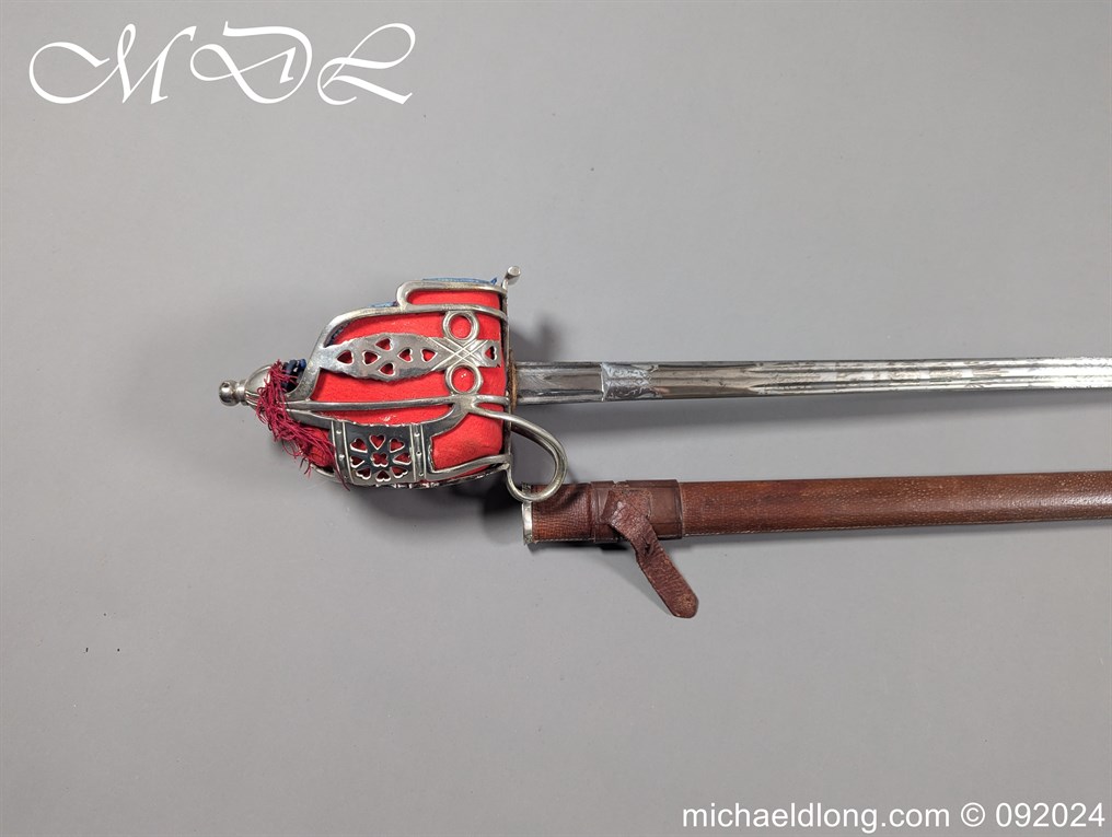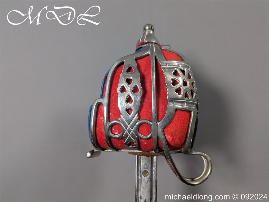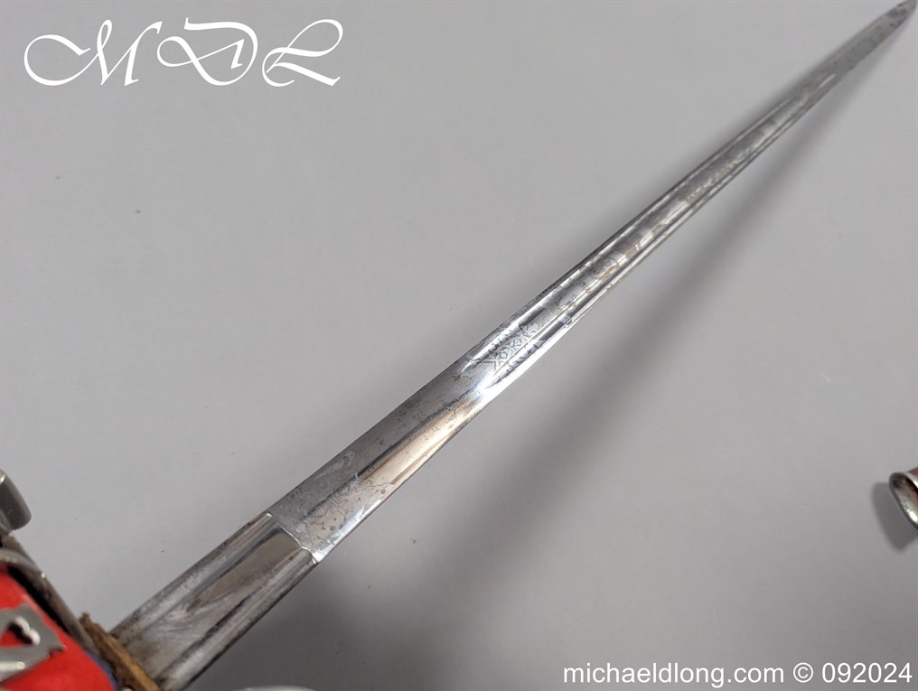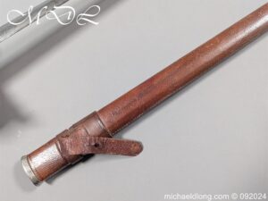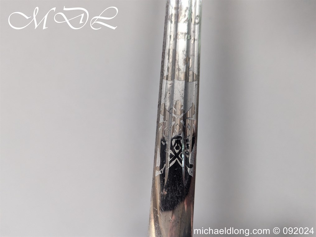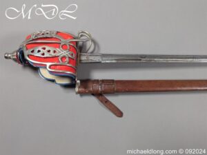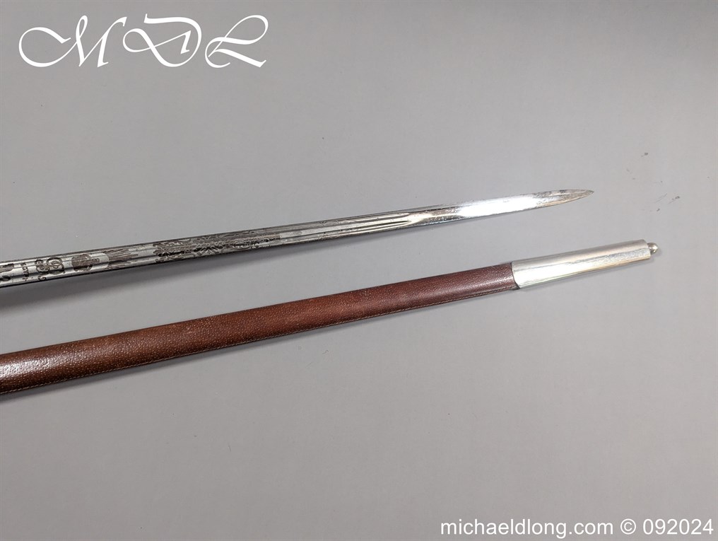 Scottish WW2 or WW1 Blackwatch Officer’s Sword. The sword with regulation hilt and complete with liner and fringe all in good condition. The broad sword blade with good etching including G R V Crown to one side the reverse with crown and regimental devises plus Blackwatch Royal Highlanders and brass proof plug. The scabbard field service in again nice condition with steel polish drag, for reference please see Swords of the British Army Revised Edition Page 160 Blade Length: 81.5cm Overall Length: 100cm