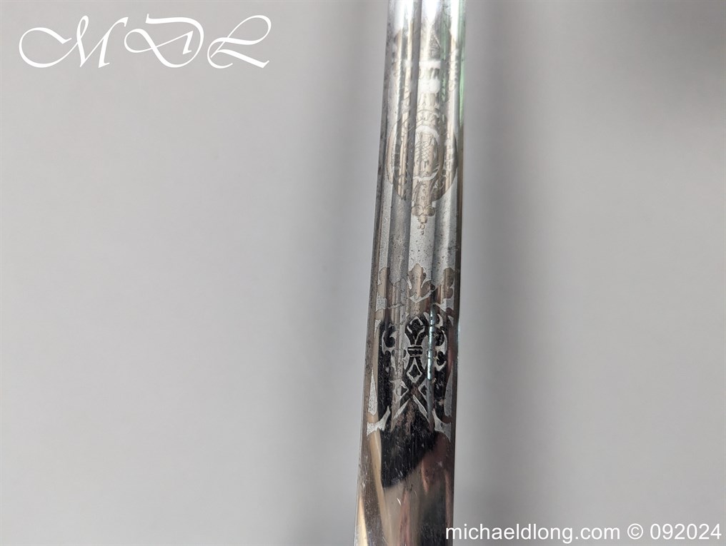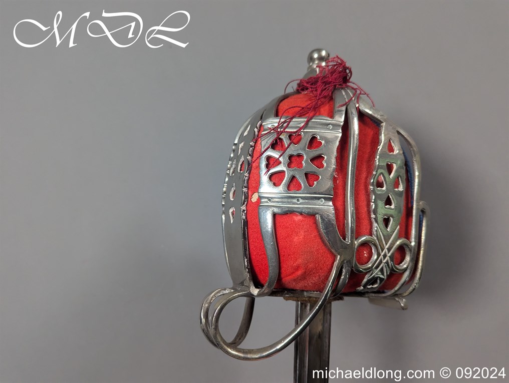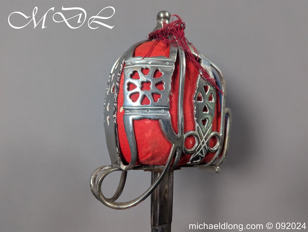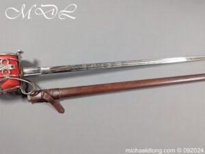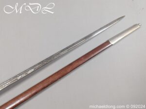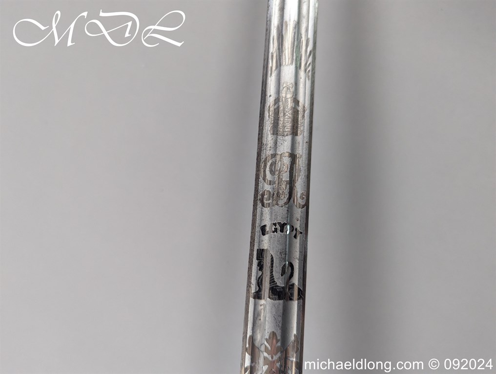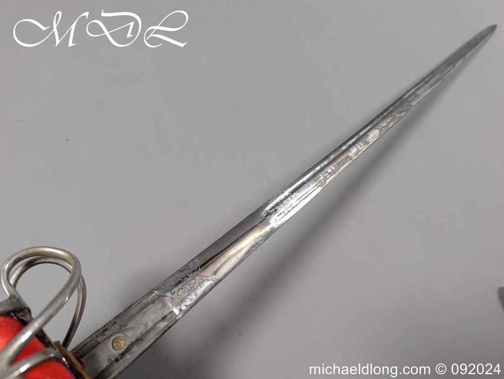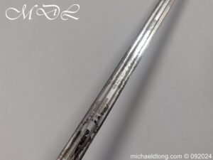 Scottish WW2 or WW1 Blackwatch Officer’s Sword. The sword with regulation hilt and complete with liner and fringe all in good condition. The broad sword blade with good etching including G R V Crown to one side the reverse with crown and regimental devises plus Blackwatch Royal Highlanders and brass proof plug. The scabbard field service in again nice condition with steel polish drag, for reference please see Swords of the British Army Revised Edition Page 160 Blade Length: 81.5cm Overall Length: 100cm