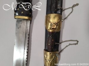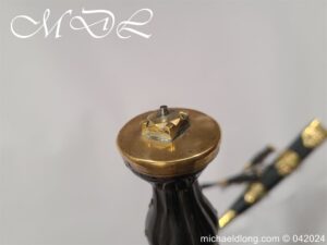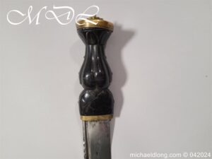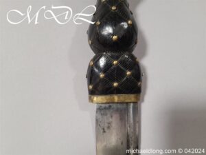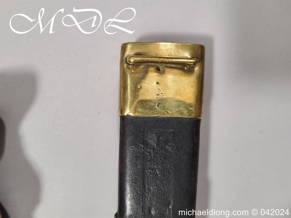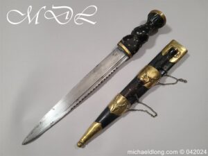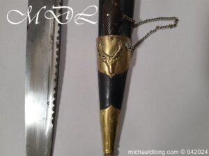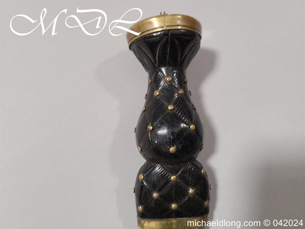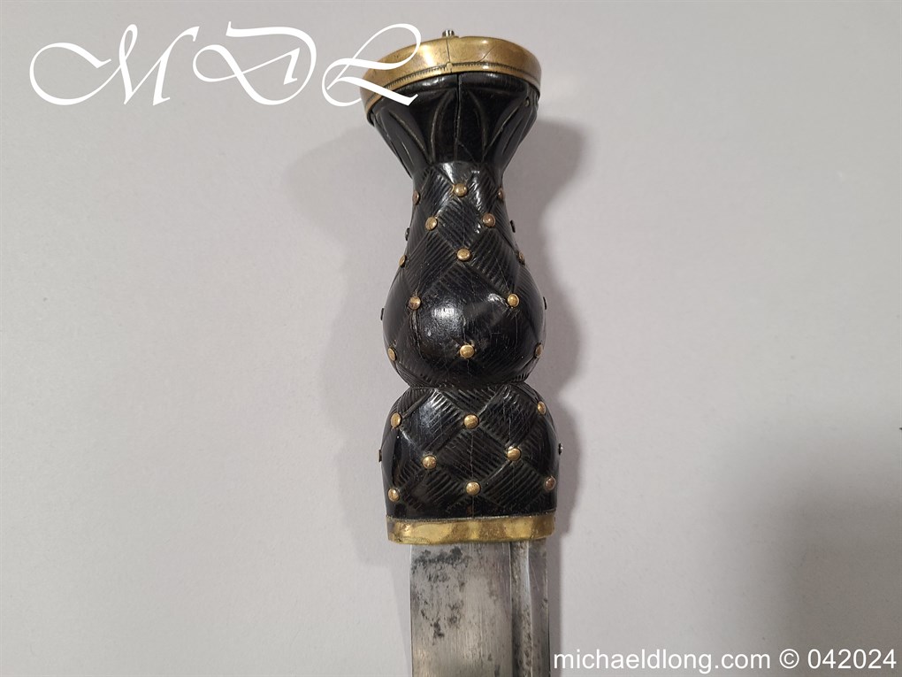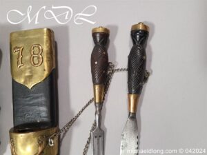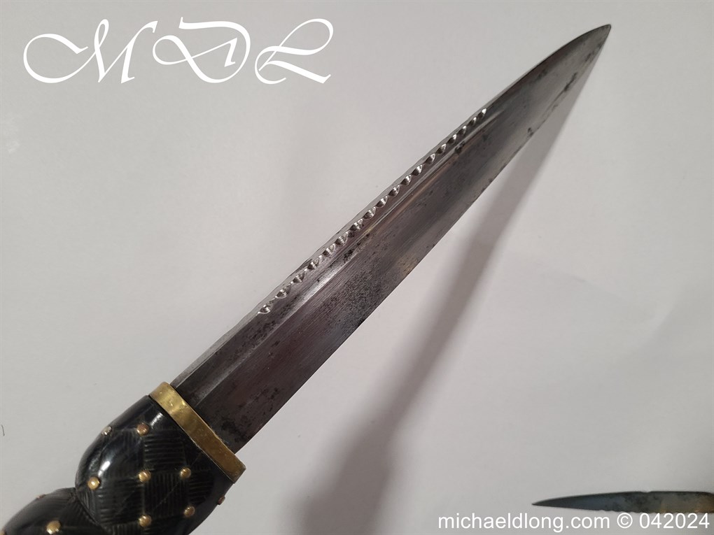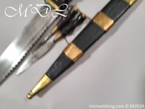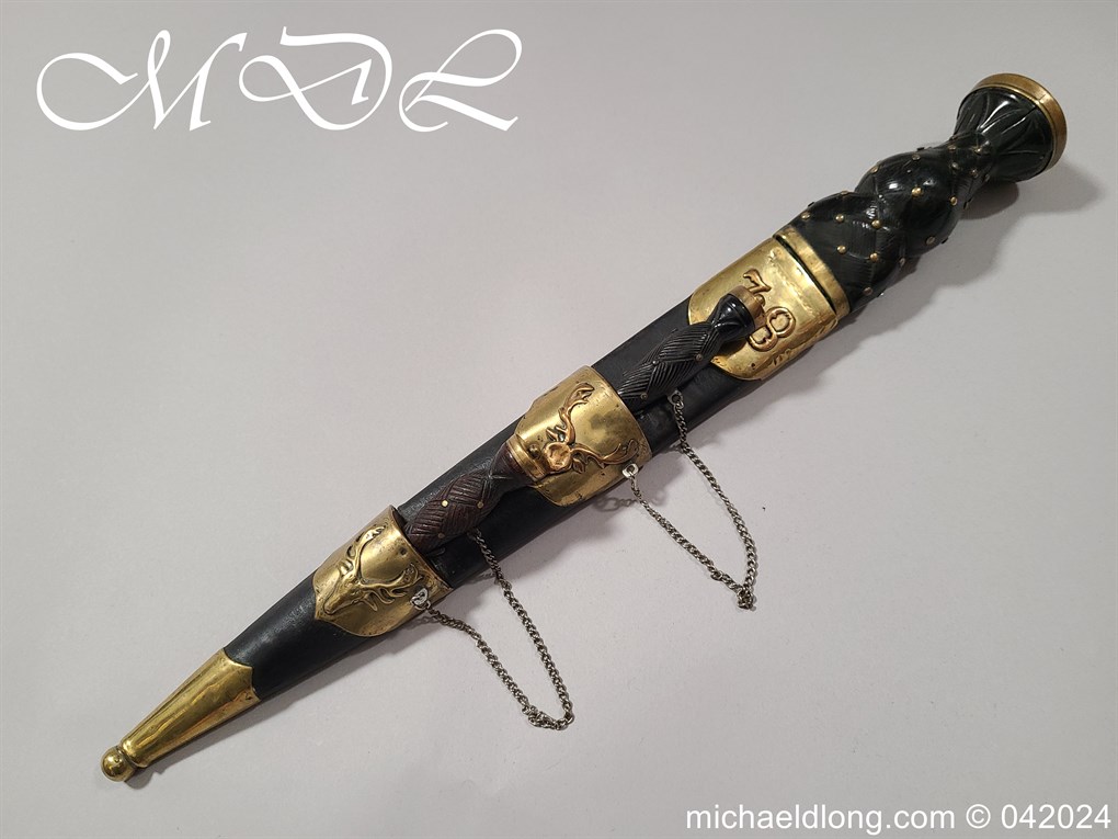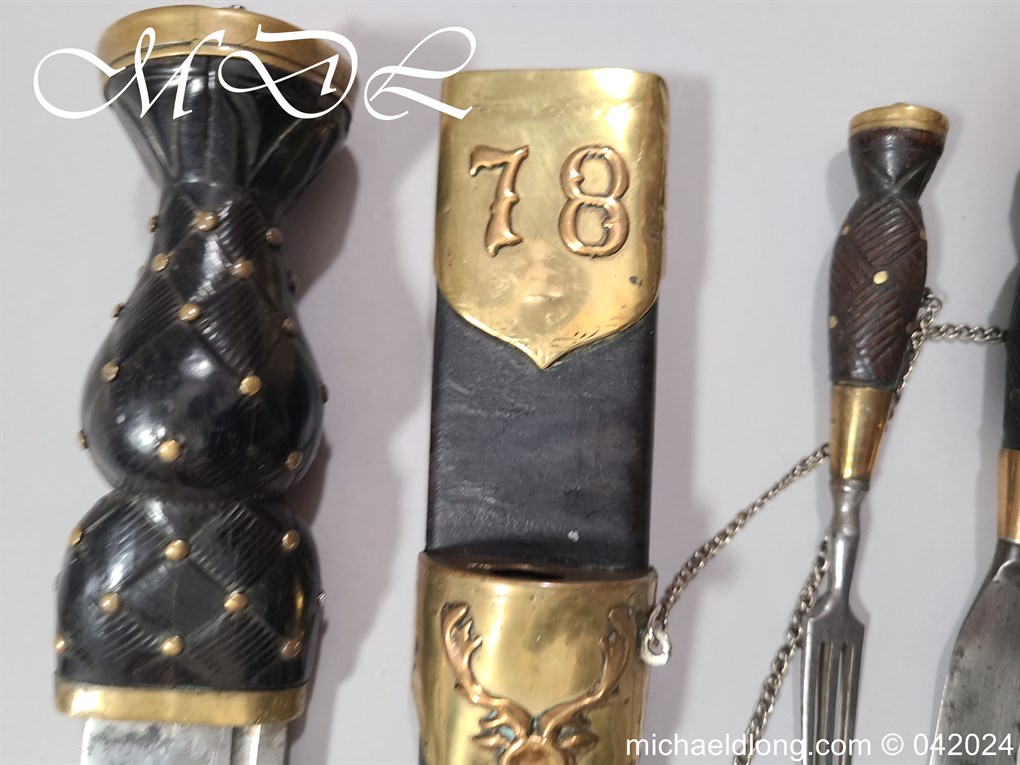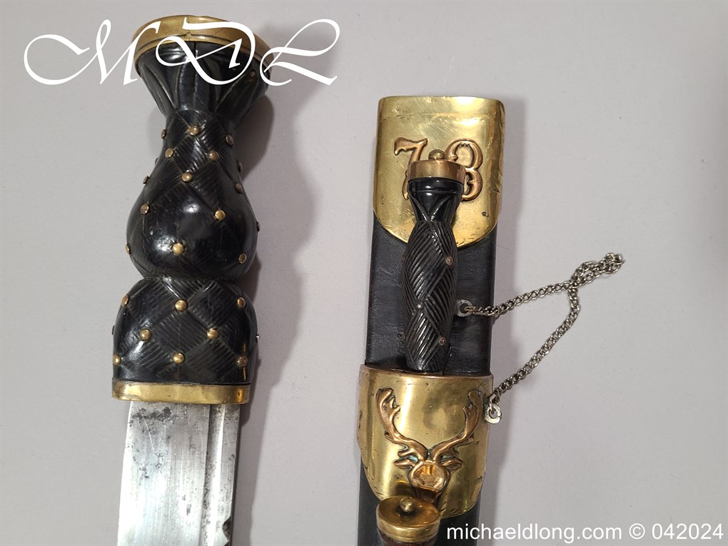 Scottish 78th Regiment of Highlander The Ross Shire Buffs rare Pipers Dirk circa 1810 Bog oak brass studded hilt with matching brass pommel. The blade of standard form with notched spine and 26.5cm in length. Brass mounted leather scabbard with 78th to the top fitting the reverse stamped with number 6. The two lower middle fittings containing the chained knife and fork, note chains look to be replacements both mounted with stag heads, overall length 40cm