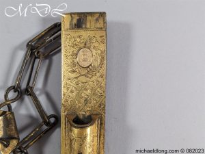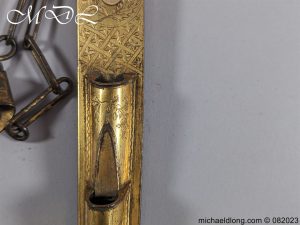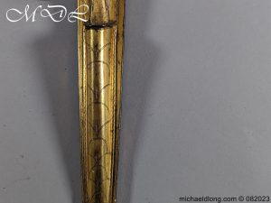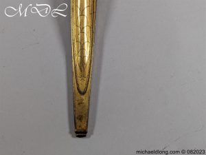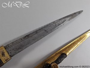 Scottish Georgian Dirk by Hunter Clan Hamilton and used by the 74th Highlanders. Gilt brass scabbard with super decoration and the pommel matching caps engraved with line decoration. The blade plain but in good condition some staining, the reverse of the scabbard engraved with Hunter Army Contractor to His Majesty Edinburgh. G Hunter worked between 1797 and 1822 it is complete with replacement matching knife and fork but you would not know, please note crack to hilt. Family crest of Clan Hamilton which is a ducal cornet an oak tree fructed and penetrated transversely in the main stem by a frame saw proper which is mounted on the scabbard.