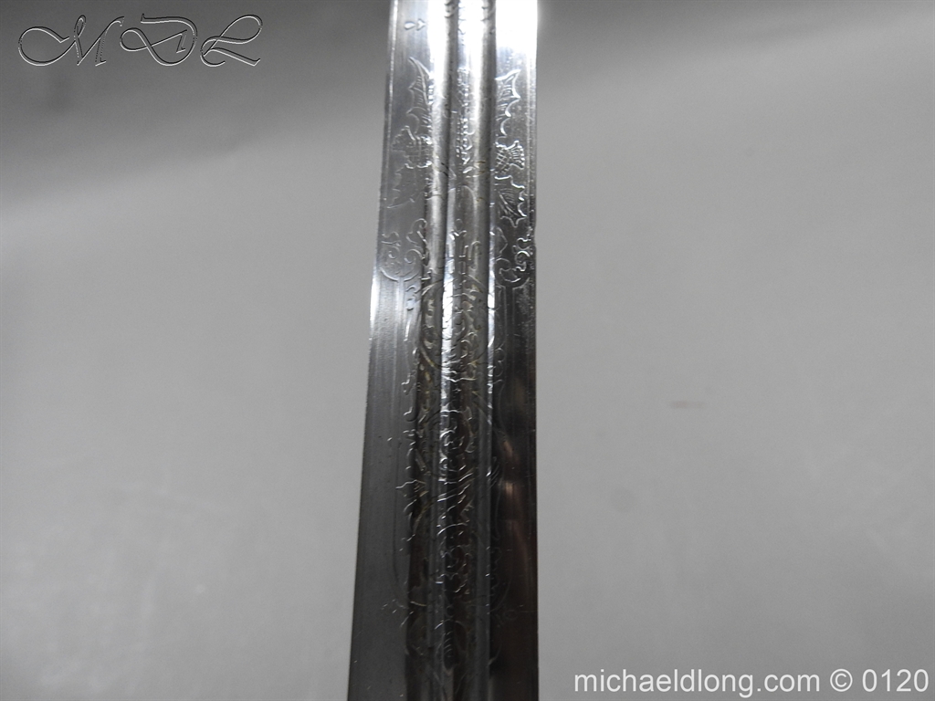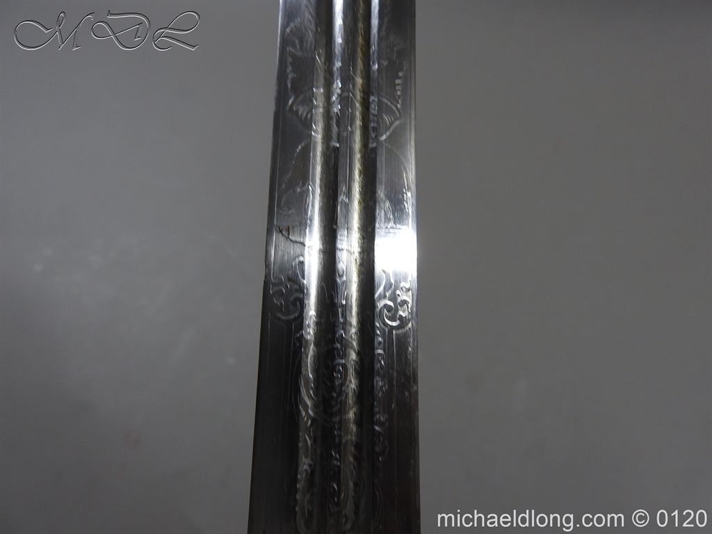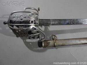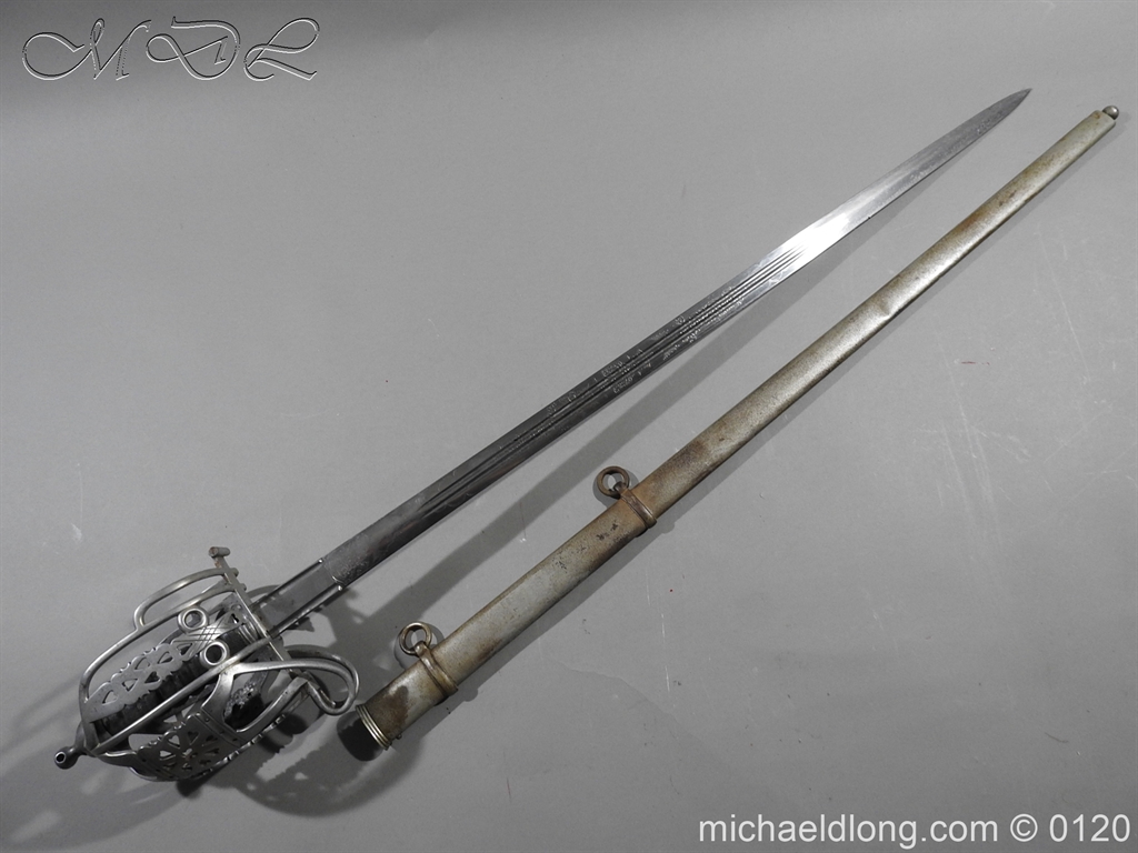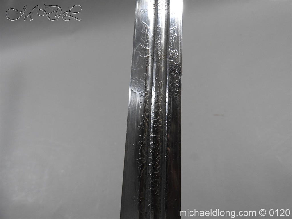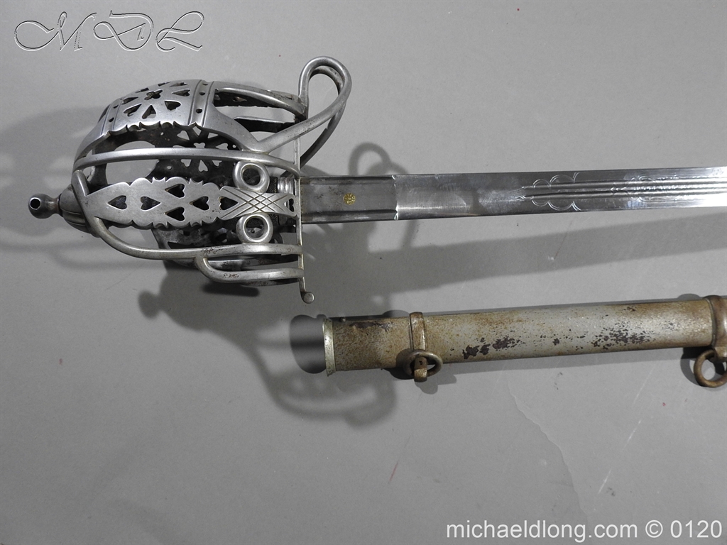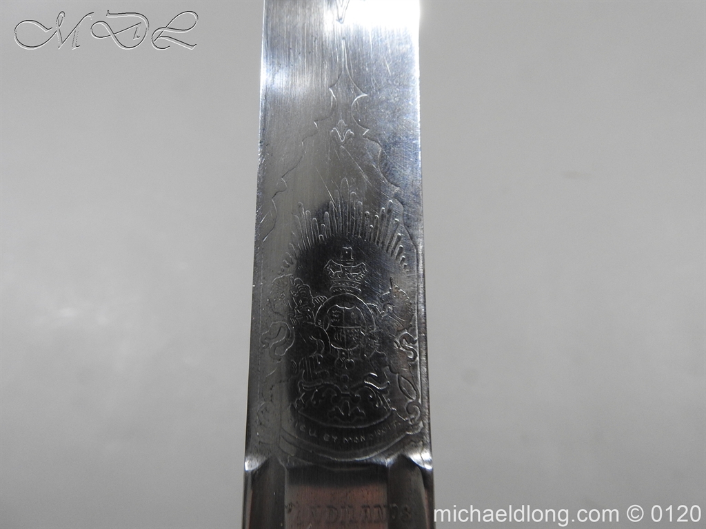 WW1 period Scottish Highland Light Infantry Officer’s Sword the blade is engraved with Kings Crown and regimental badge plus battle honour to reverse. The broad sword blade is in good condition the engraving is clear and visible. Regimental basket hilt and fish skin grip. It is complete with all steel scabbard which does show age wear. The blade with retailers details overall length 101cm blade 83cm