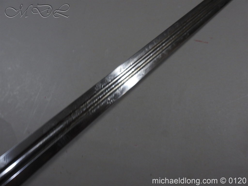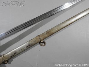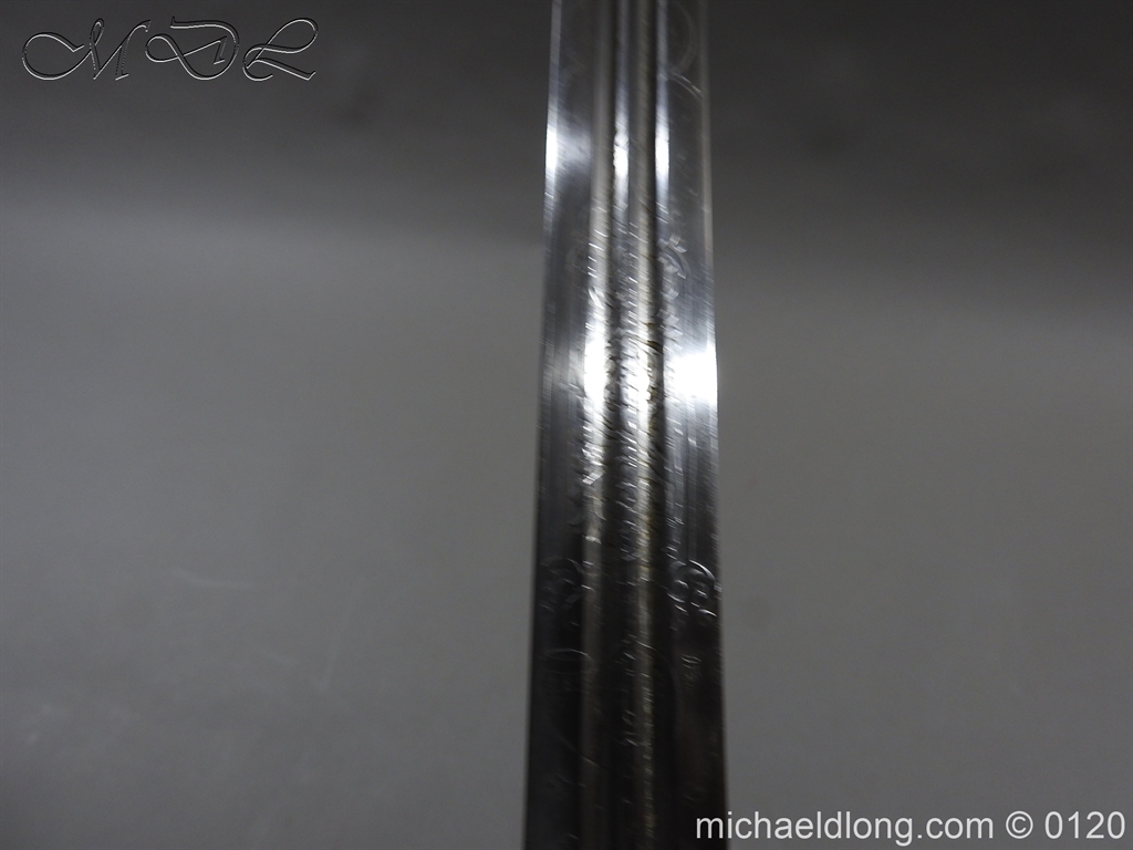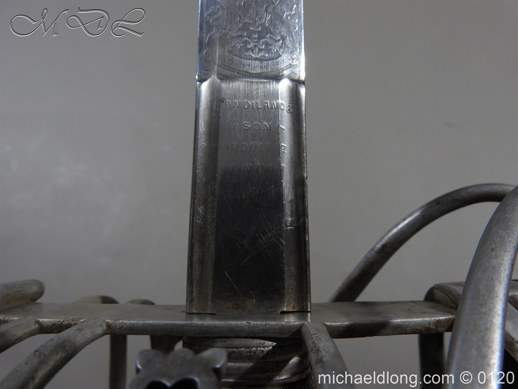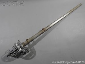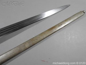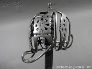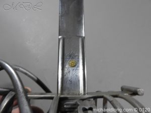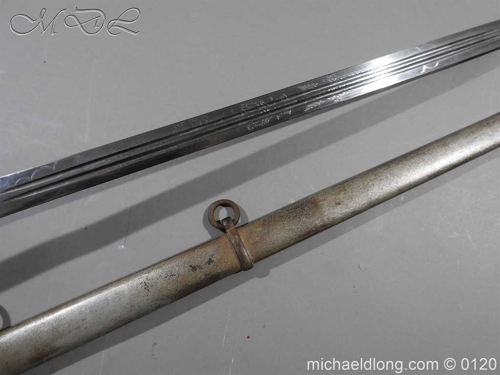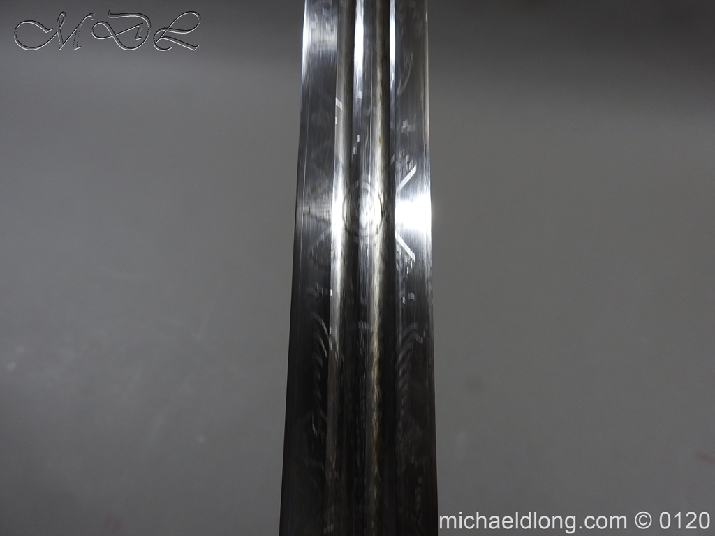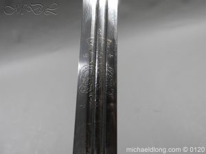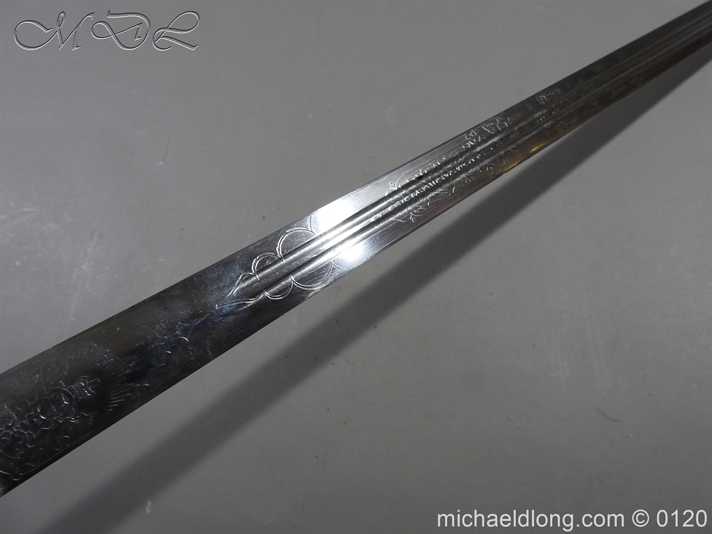 WW1 period Scottish Highland Light Infantry Officer’s Sword the blade is engraved with Kings Crown and regimental badge plus battle honour to reverse. The broad sword blade is in good condition the engraving is clear and visible. Regimental basket hilt and fish skin grip. It is complete with all steel scabbard which does show age wear. The blade with retailers details overall length 101cm blade 83cm