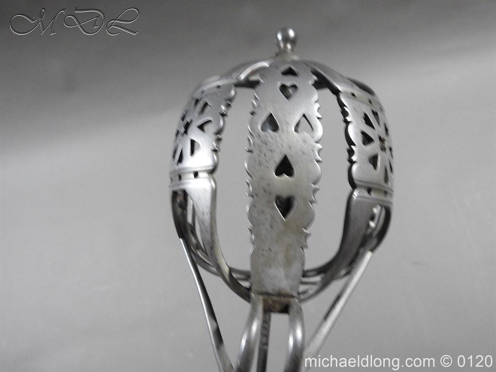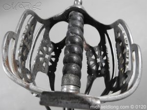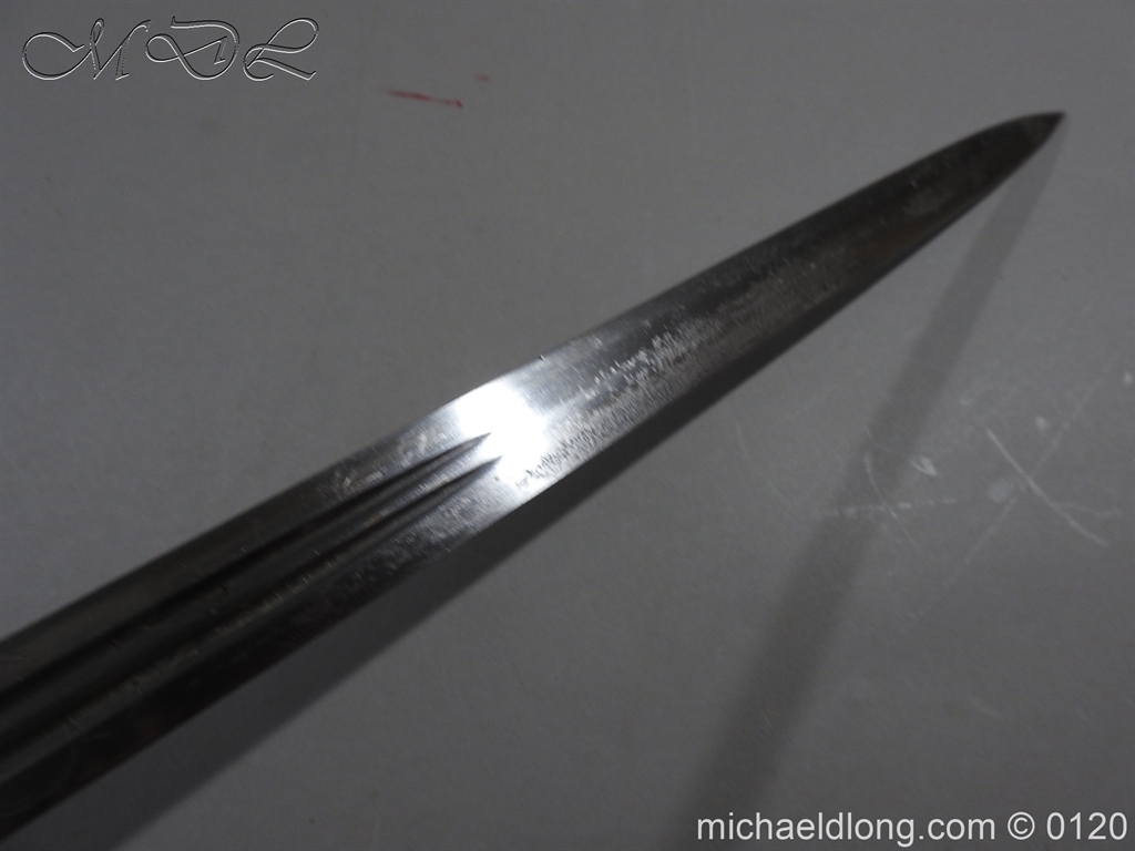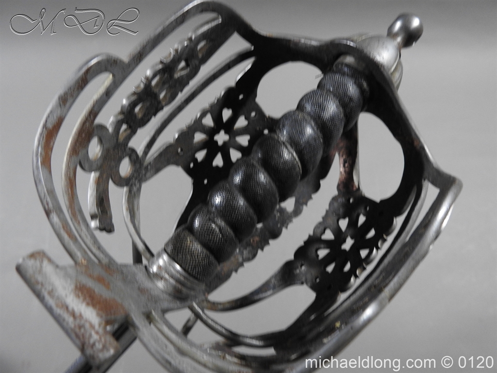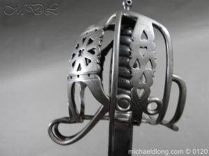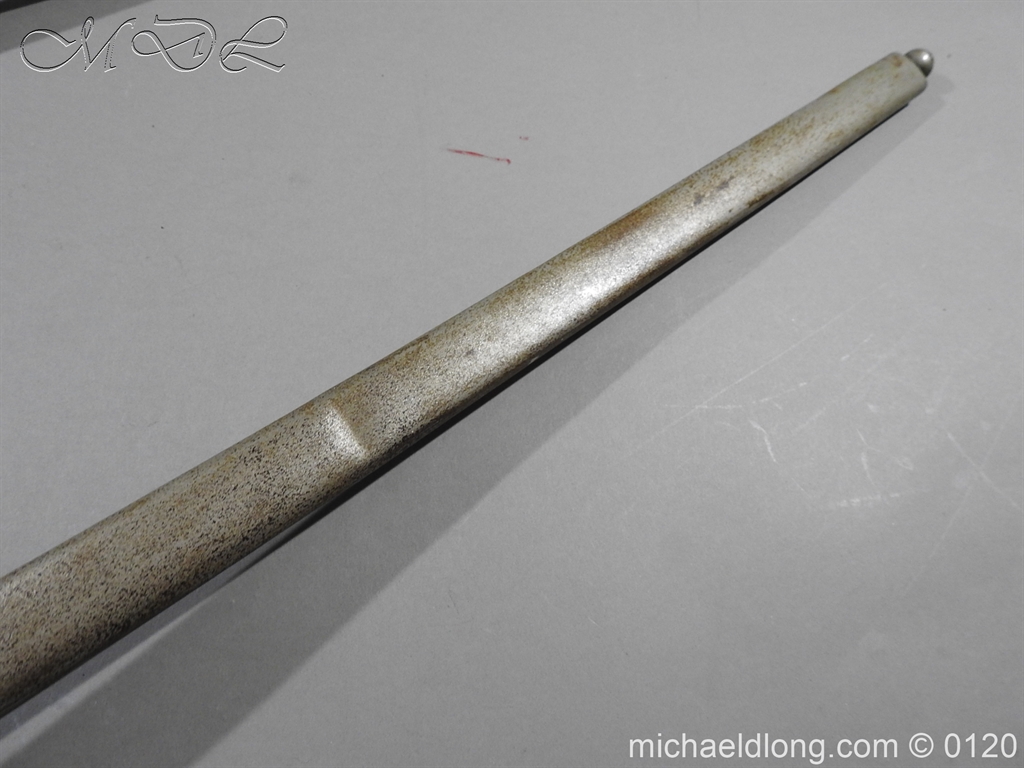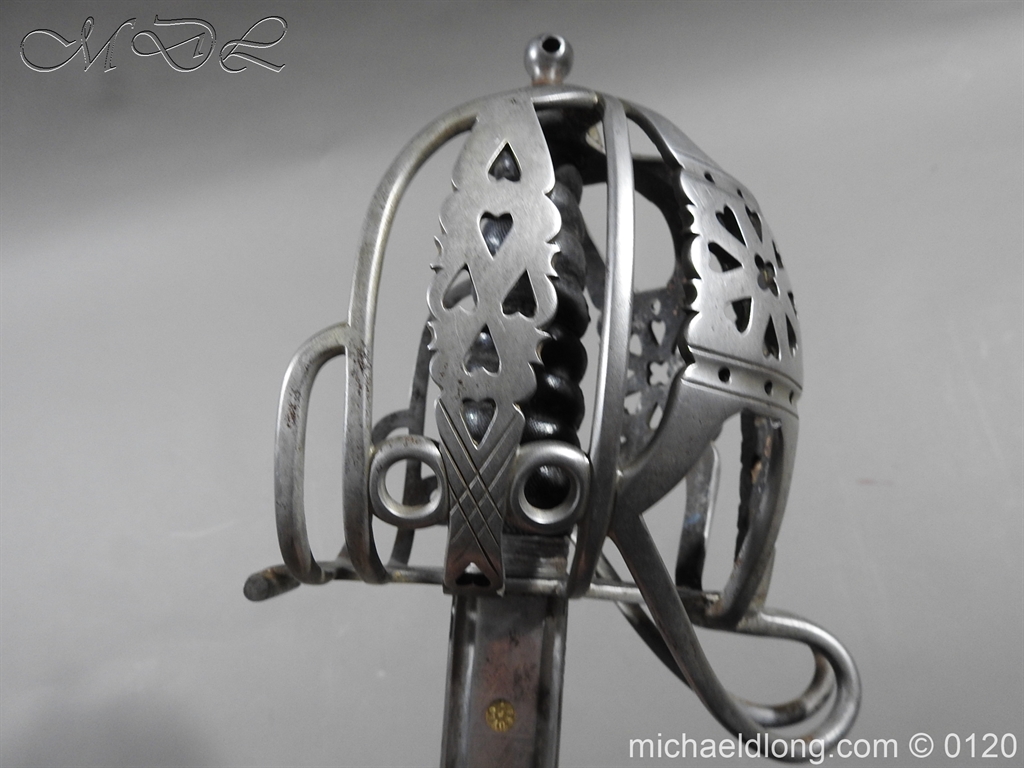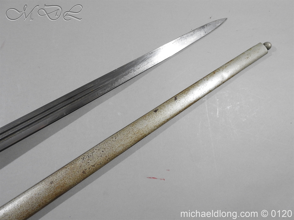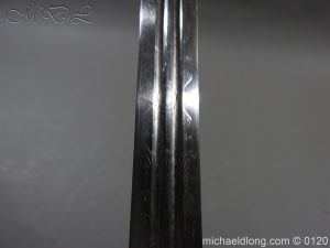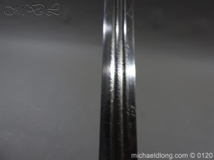WW1 period Scottish Highland Light Infantry Officer’s Sword the blade is engraved with Kings Crown and regimental badge plus battle honour to reverse. The broad sword blade is in good condition the engraving is clear and visible. Regimental basket hilt and fish skin grip. It is complete with all steel scabbard which does show age wear. The blade with retailers details overall length 101cm blade 83cm