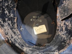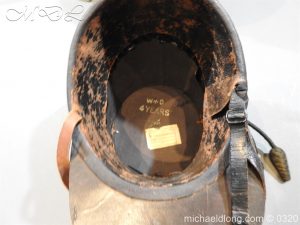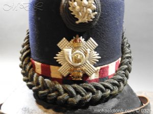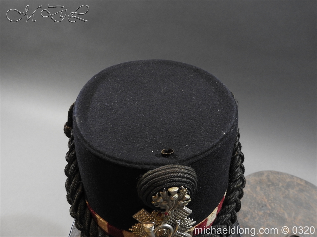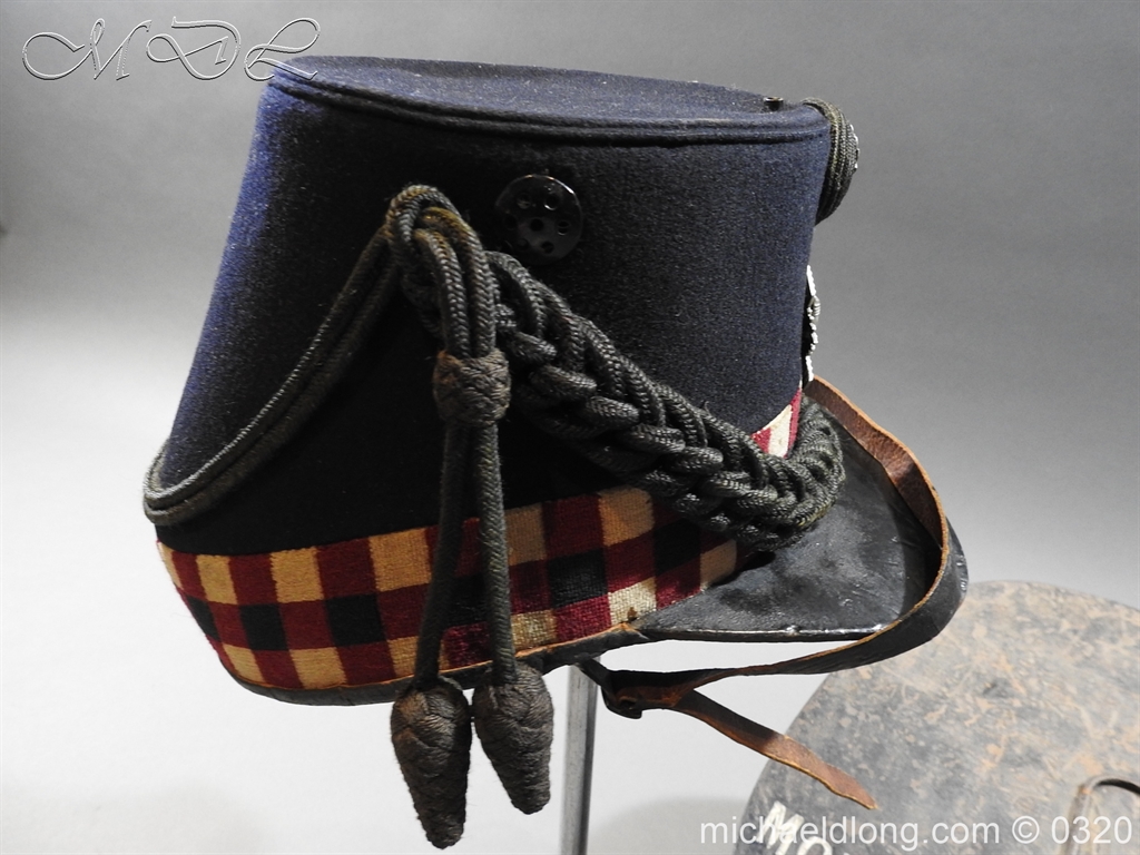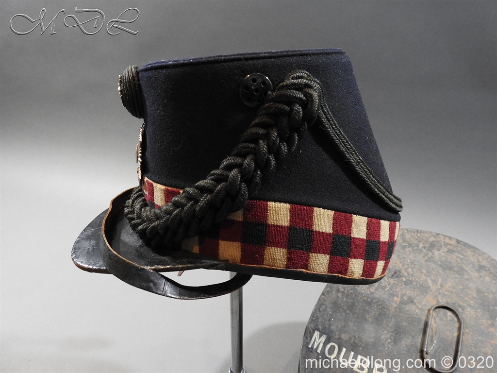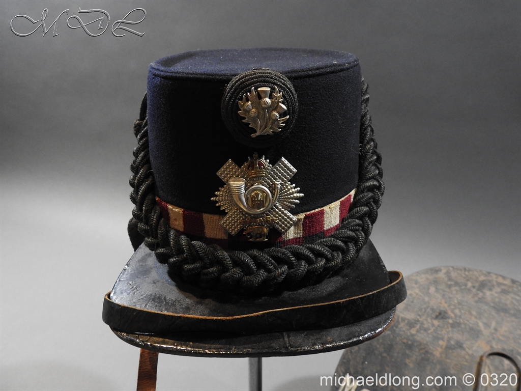 Scottish Highland Light Infantry Victorian Shako. A good quality example with dark blue body with diced band red-white-red and red-green-red. To the front, a Victorian regimental shako badge and black silk rosette mounted with a silver thistle device complete with plaited cap lines and black patent leather peak. The interior is with leather sweatband plus W D Stamp and maker label P Jacobson Army Contractor. Complete with storage tin marked internally Marshall & Aitkin of Edinburgh and externally Moubray Rolland 4th HLI
