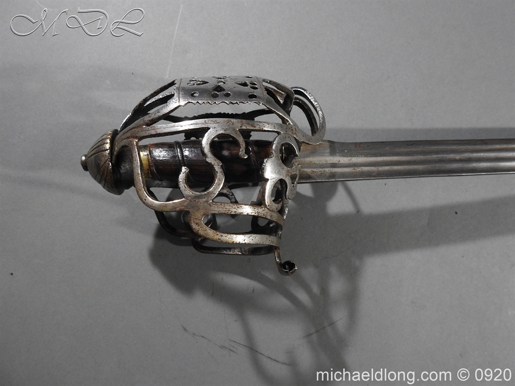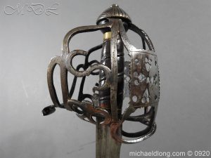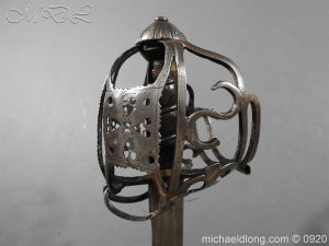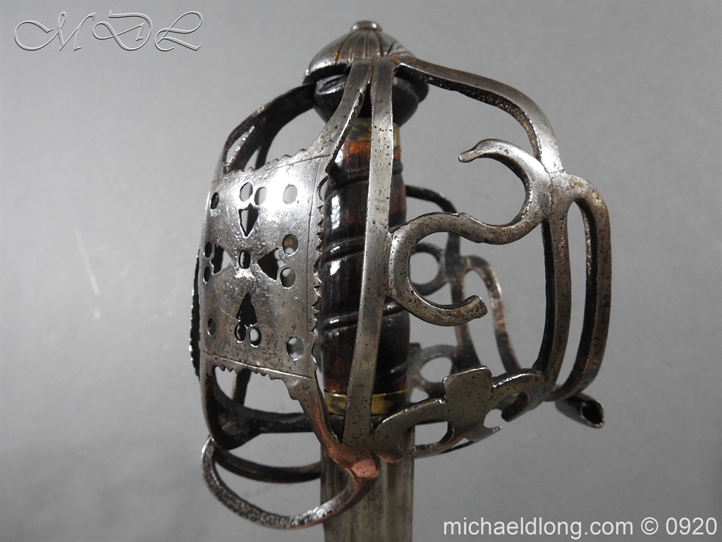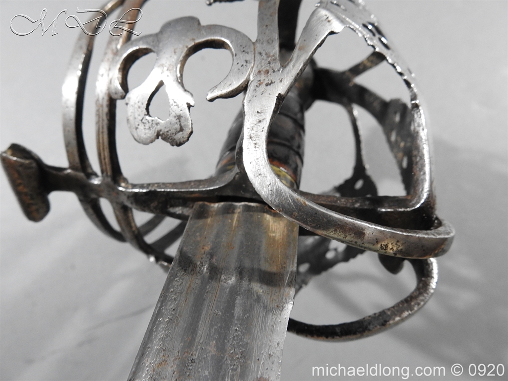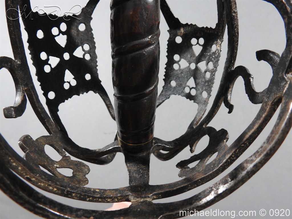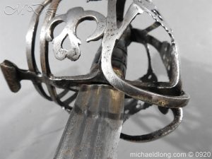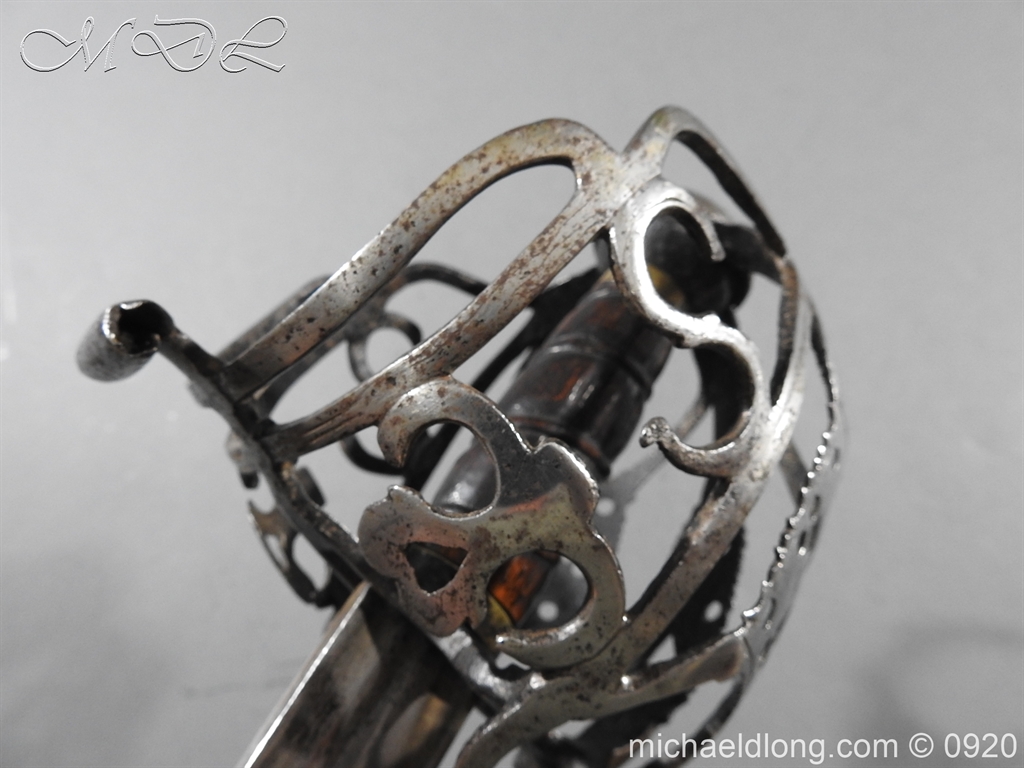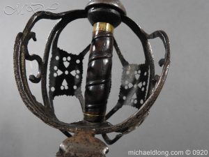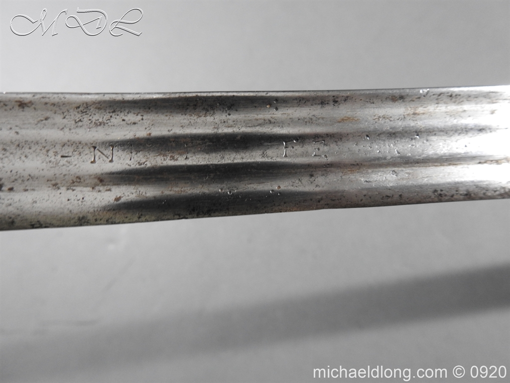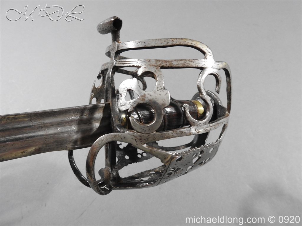 Scottish Infantry Officer’s sword c 1720 iron hilt with S bars and polish wood grip with brass collars. The blade multi fullered with marked ANDREIA FARARA however very faint and can only see the N FE and the reverse with XX single edged and 34 inches in length overall 40 inches please see for reference page 374 of Swords and Sword Makers of England and Scotland by Bezdek
