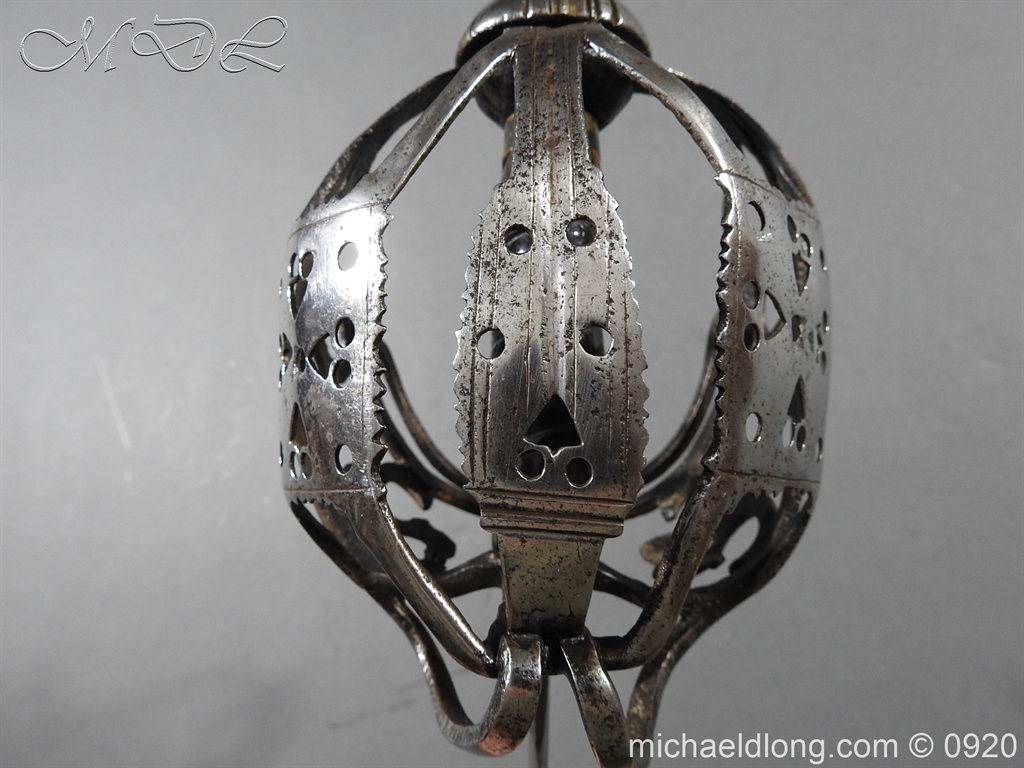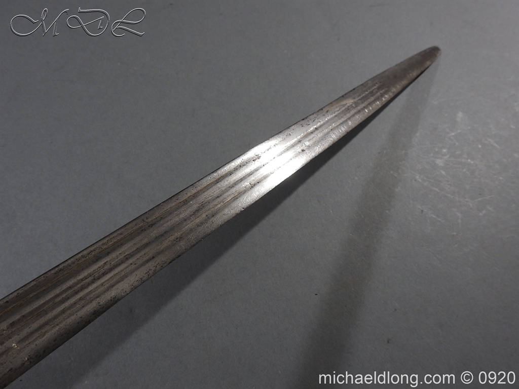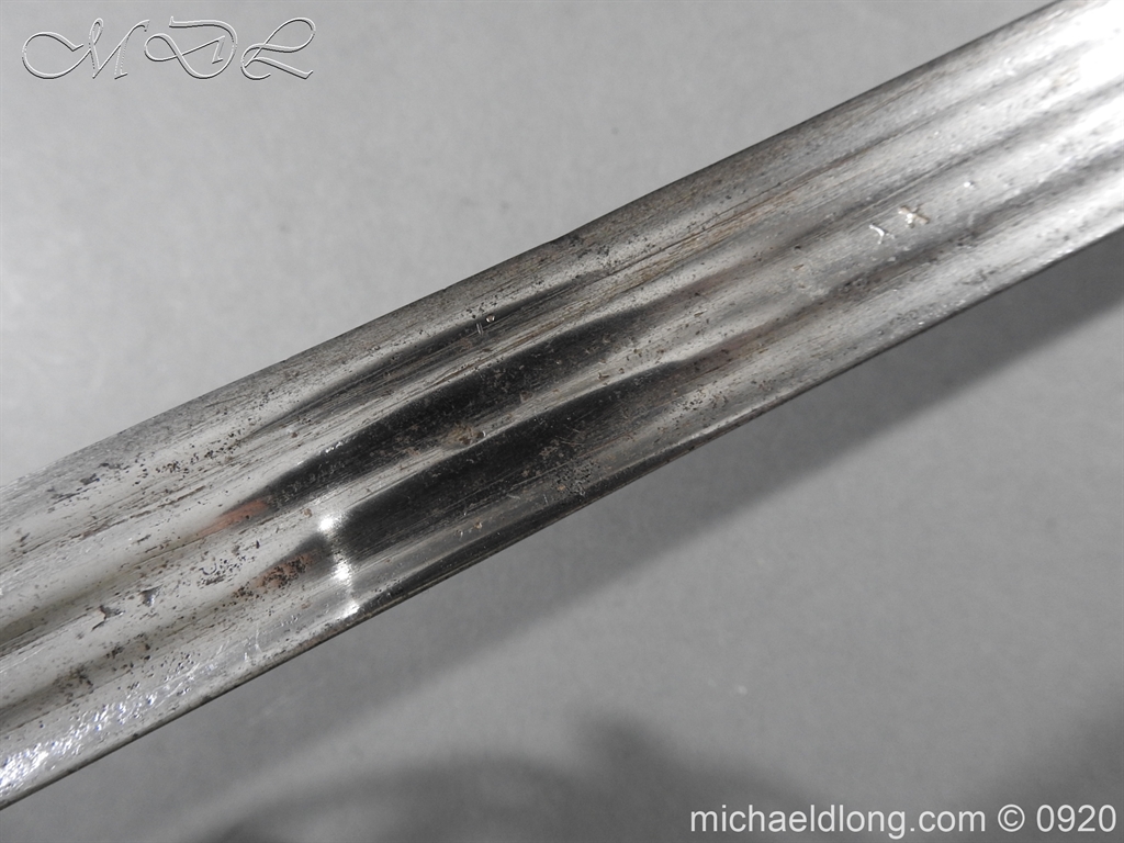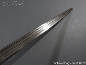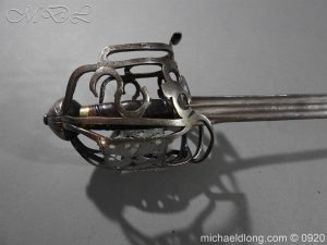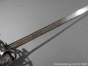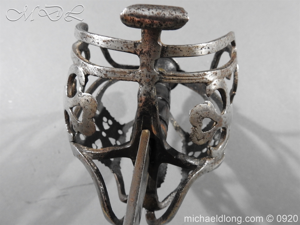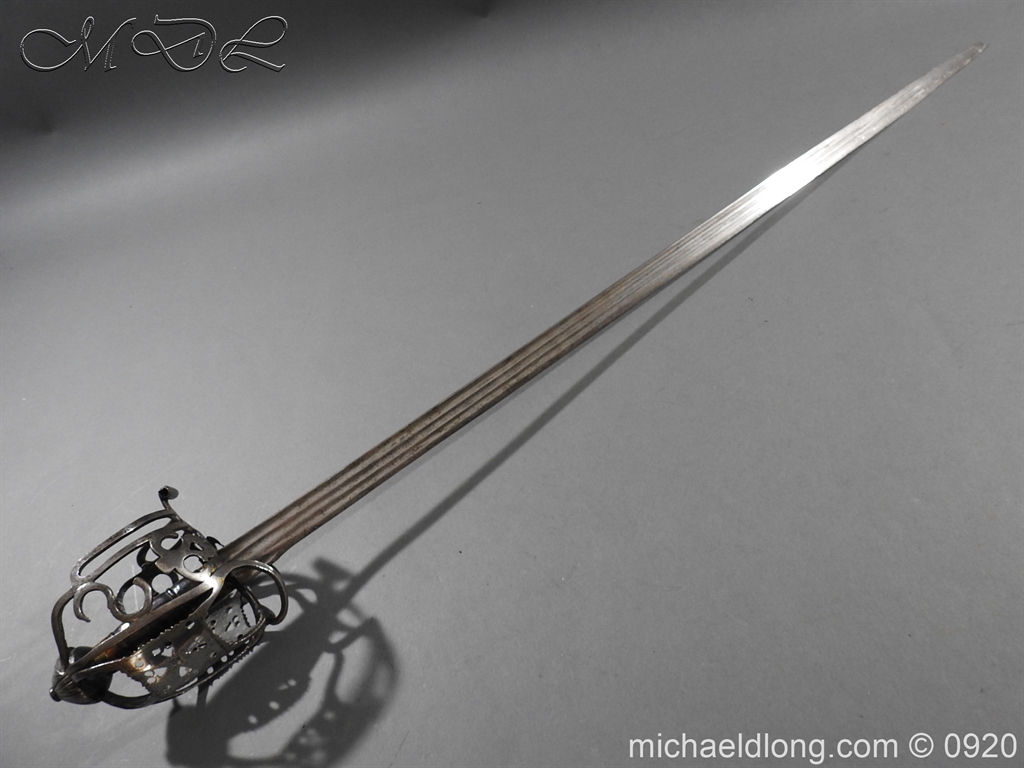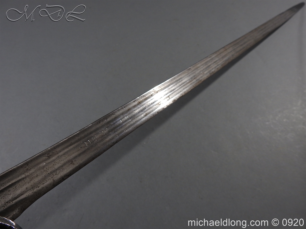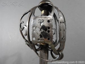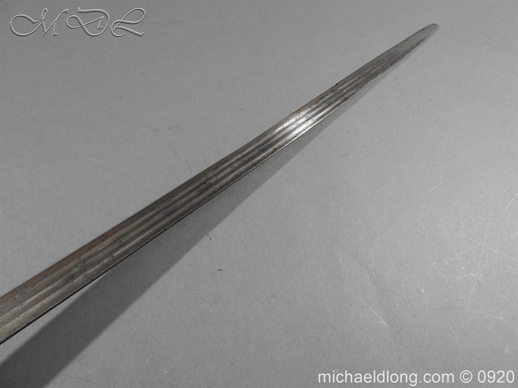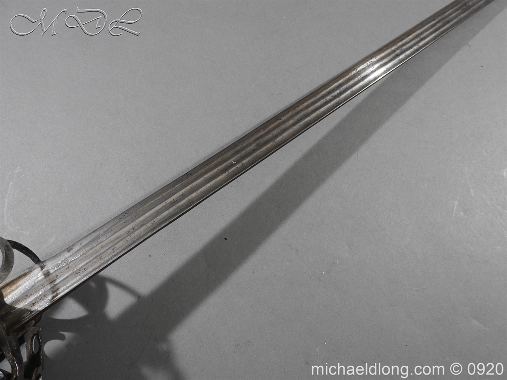 Scottish Infantry Officer’s sword c 1720 iron hilt with S bars and polish wood grip with brass collars. The blade multi fullered with marked ANDREIA FARARA however very faint and can only see the N FE and the reverse with XX single edged and 34 inches in length overall 40 inches please see for reference page 374 of Swords and Sword Makers of England and Scotland by Bezdek