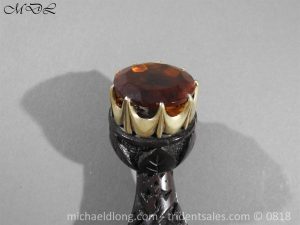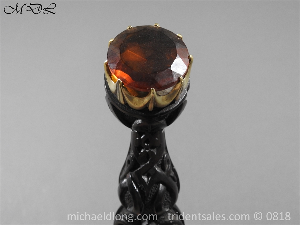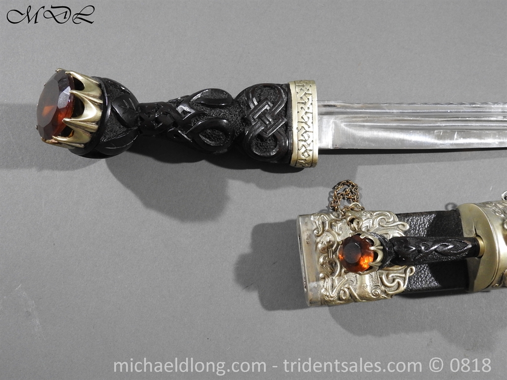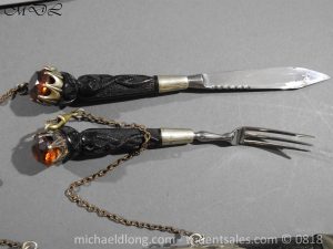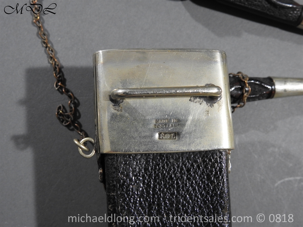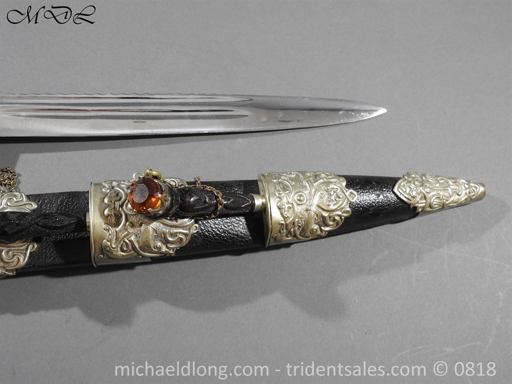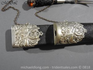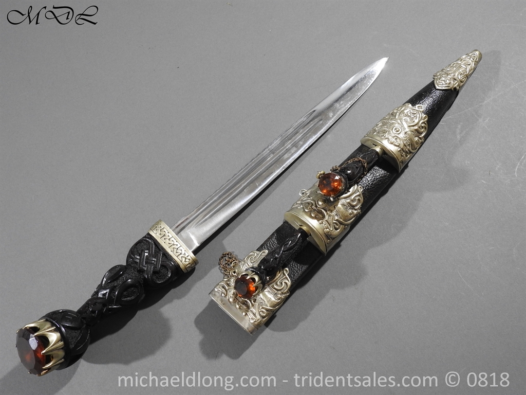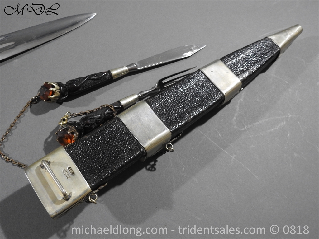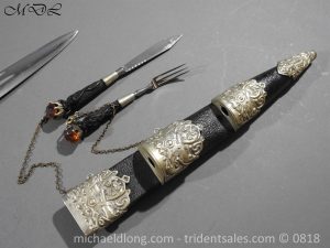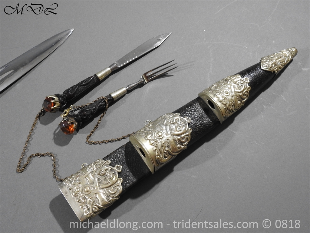 Early 20 century Scottish dirk with white metal decorative mounts, ebonised baluster grip deeply curved with matching knife and fork en suite secured by chains. The polished blade with notched back edge and 2 fullers and inserted matching imitation Cairngorm in crown mounts to dirk and knife and fork complete with leather scabbard maker marked.