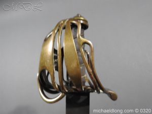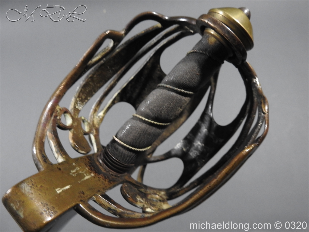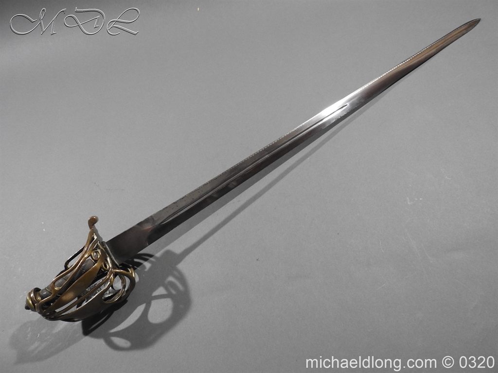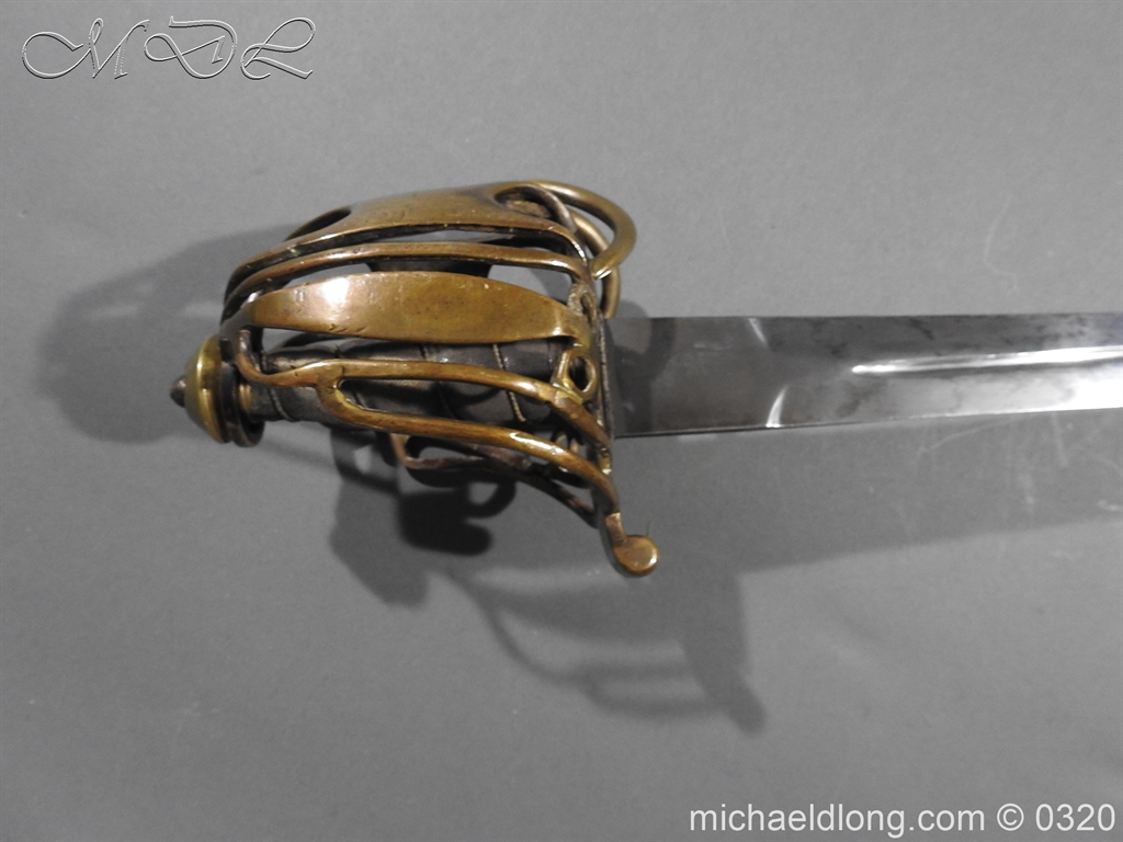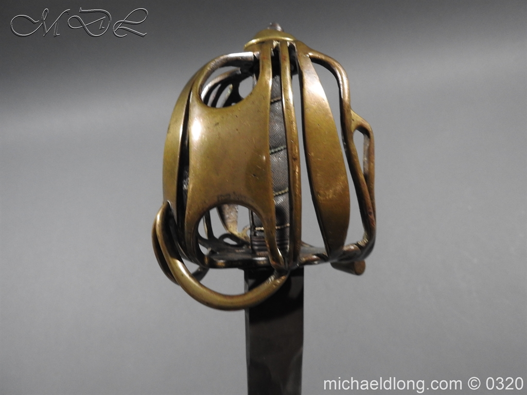 Scottish Officer’s 1798 Pat Broad Sword, brass basket hilt sword introduced to the Scottish Highland regiments in 1798 and only replaced by the regulation 1828 pattern sword so this pattern of sword was used throughout the Napoleonic War period. The brass basket fitted with wire bound fish skin grip and dome pommel. Straight double edged broad sword blade with short central please note one front bar slightly bent not uncommon on brass basket hilt swords overall length 99cm blade length 84cm
