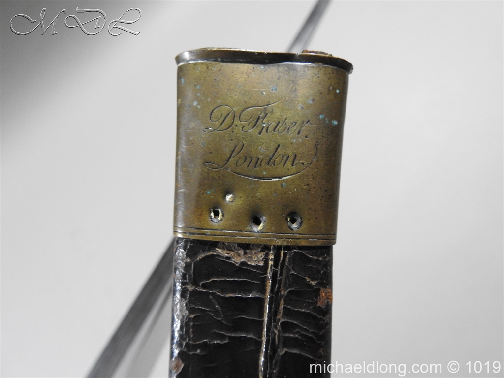 Super example of a Scottish Officer’s 1798 Pat Broad Sword by Fraser London, brass basket hilted sword introduced to the Scottish Highland regiments in 1798 and only replaced by the regulation 1828 pattern sword so this pattern of sword was used throughout the Napoleonic War period. The brass basket fitted with wire bound fish skin grip and dome pommel. Straight double edged blade with short central fuller and complete with black leather tooled scabbard with brass mounts the top one engraved with makers name D Fraser London – Overall length 97cm blade 82cm