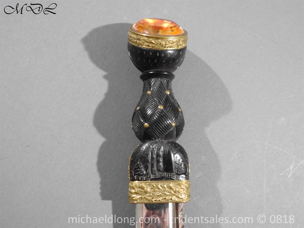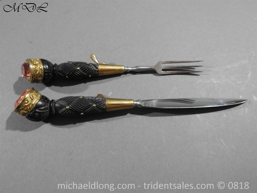 By R and B Kirkwood Edinburgh with bright single-edged blade notched along the back for much of its length, ebonised baluster grip carved with basketweave set with brass pins above crossed swords and bonnet on one side, a thistle on the other, brass mounts chased with thistles, and pommel set with a piece of faceted glass against orange foil, in original wood-lined black patent leather scabbard with border engraved brass mounts applied with thistles, the locket also with the figure of St. Andrew, and with foliate chape, the by-knife and fork en suite with the dirk complete with velvet lined case and hanging strap