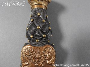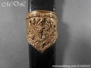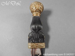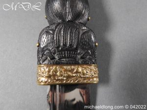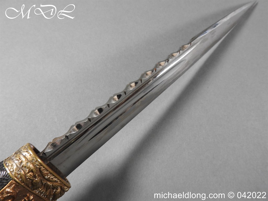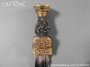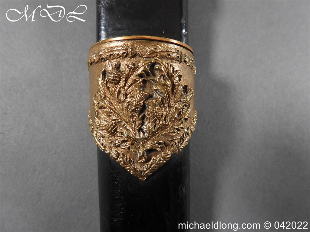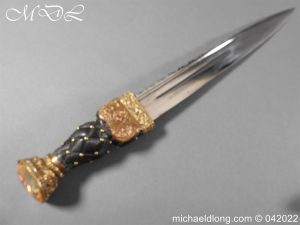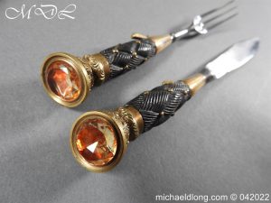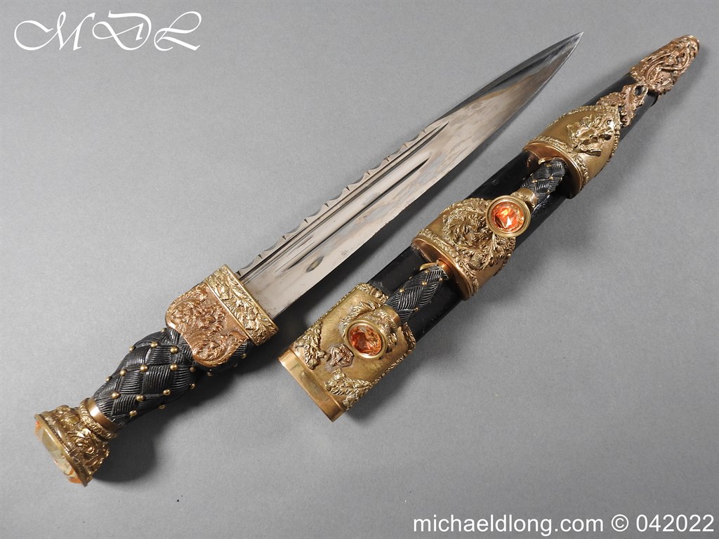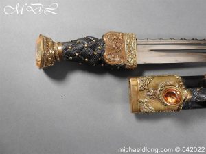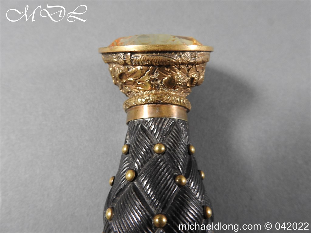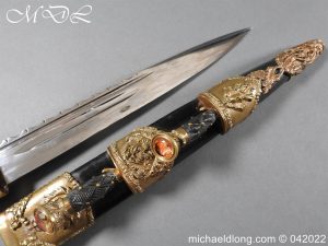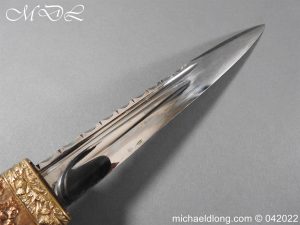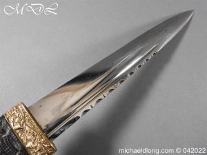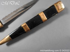 A Kings Crown Scottish officer’s dirk for the Queens Own Cameron Highlanders, the 28cm blade with facet edge back good very good condition. Ebonised baluster set with brass studs above a gilt mount with acanthus and oak leaves the rear with crossed swords and plumed hat, in original leather scabbard with gilt mounts with Kings crown the reverse maker marked Anderson and Son, knife and fork en suite. All in very good condition purchased from the Brigadier Ian Colin Cameron estate sale along with is dirk dress belt which is listed separately, sold with research.
