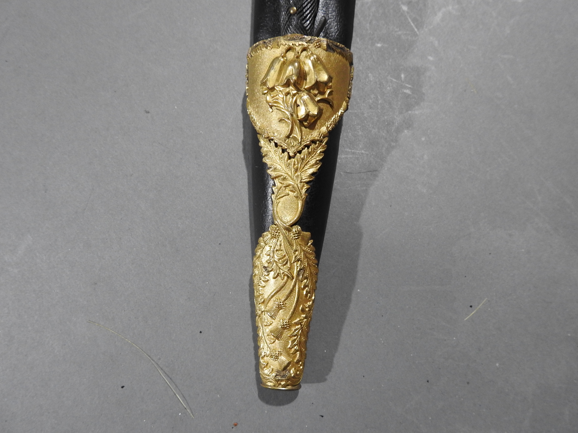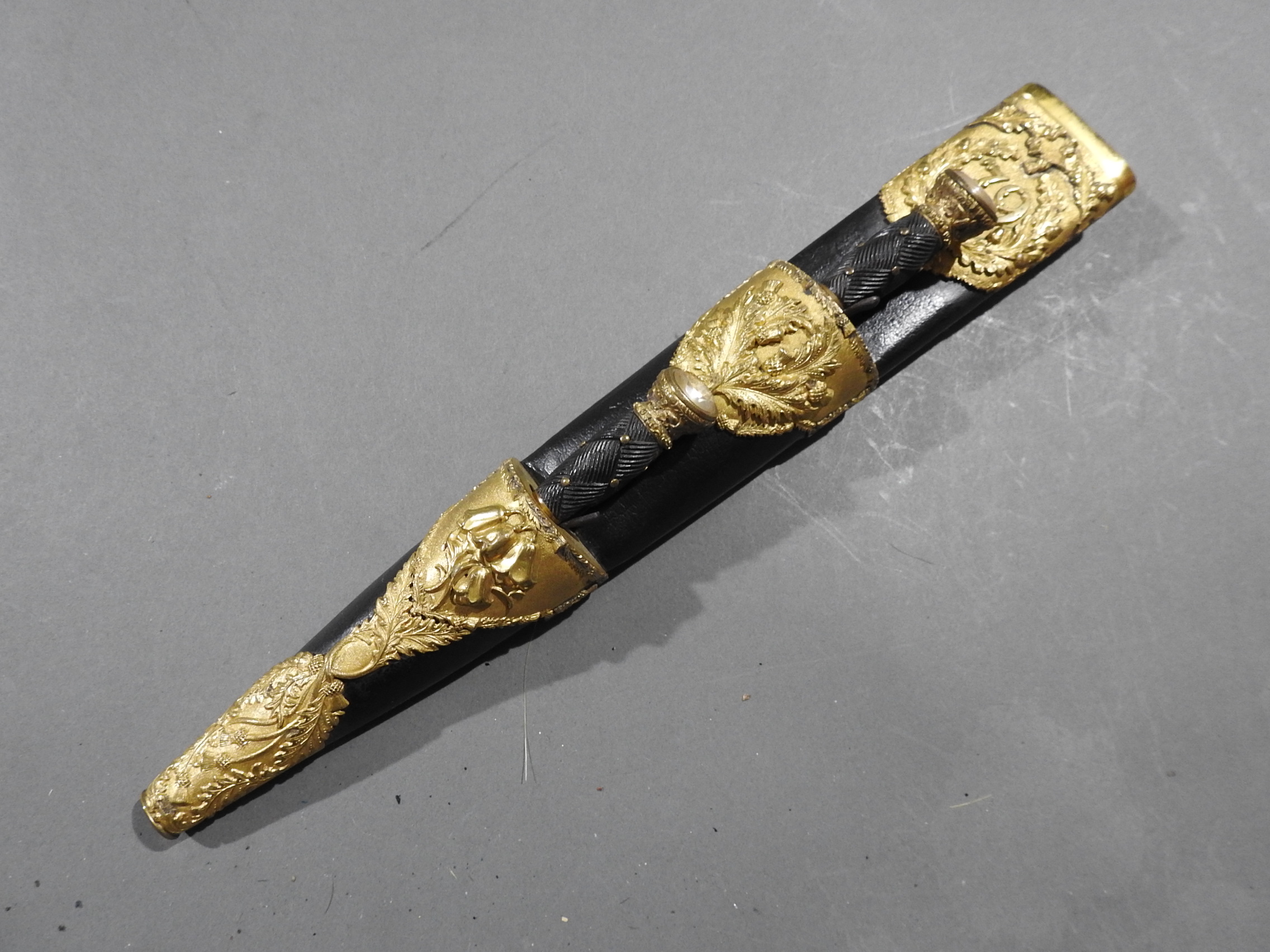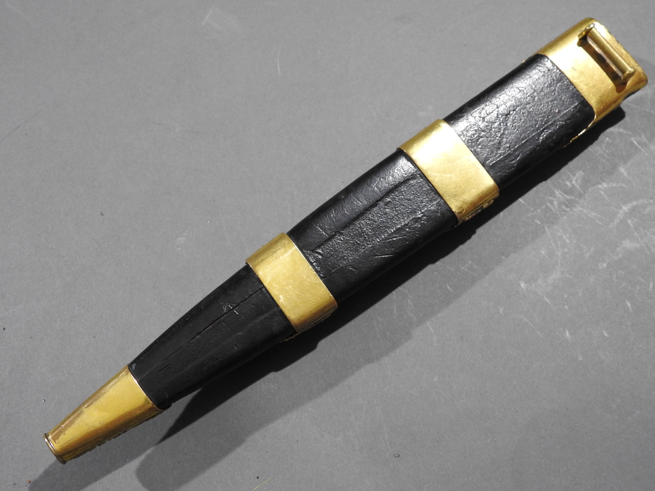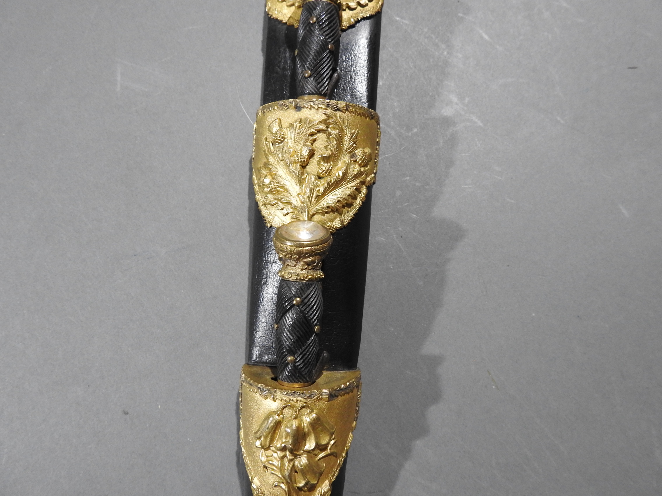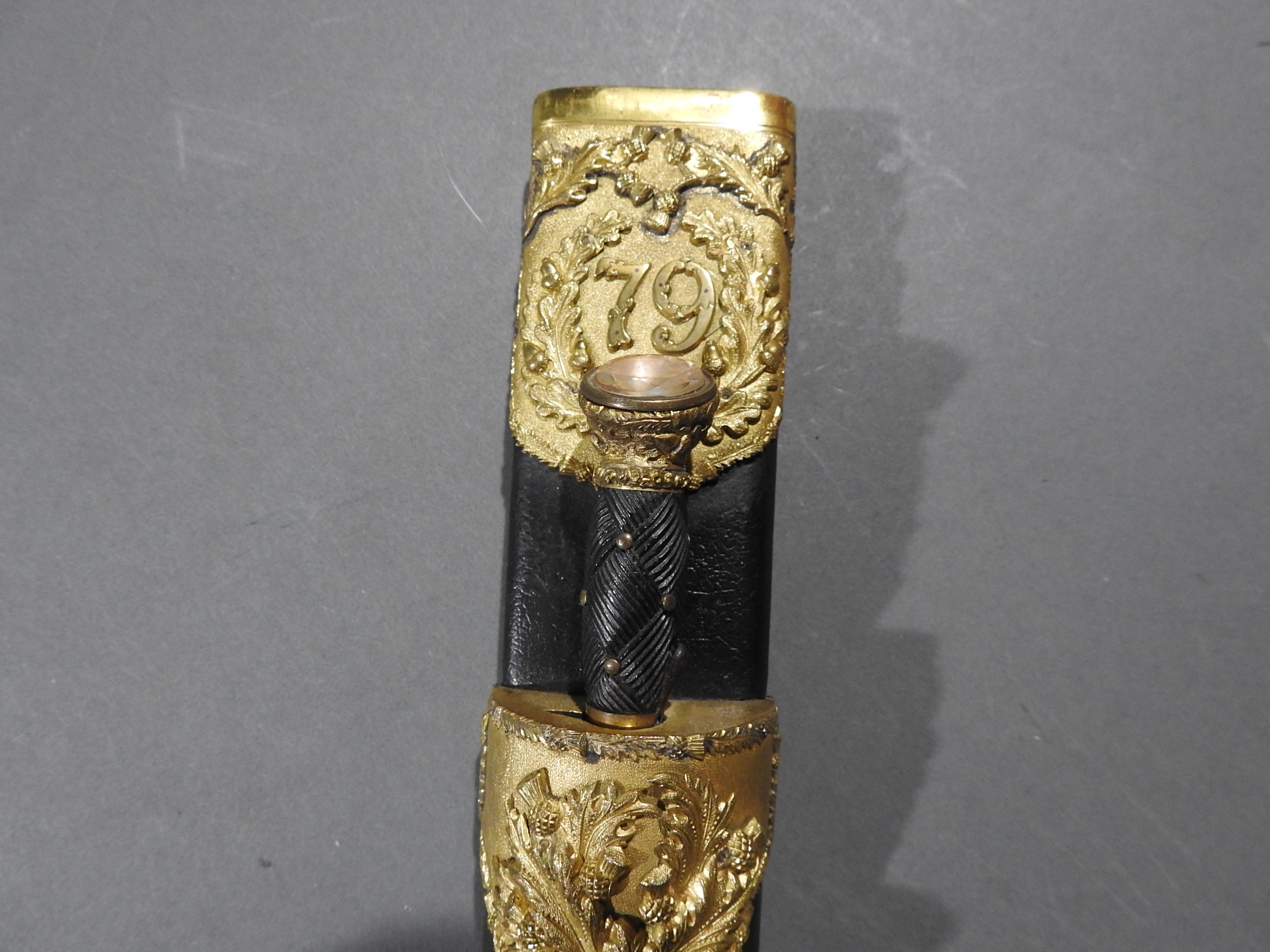 A Victorian period Scottish officers dirk for the 79th regiment Queens Own Cameron Highlanders, the 28cm double blade engraved blade with VR Crown regimental badge and battle honours although very faint plus facet edge back. Ebonised baluster set with brass studs above a gilt mount of acanthus and oak leaves the rear with crossed swords and plumed hat, in original leather scabbard with gilt mounts the marked 79th, knife and fork en suite. All in very good condition, pommel stone maybe a replacement.