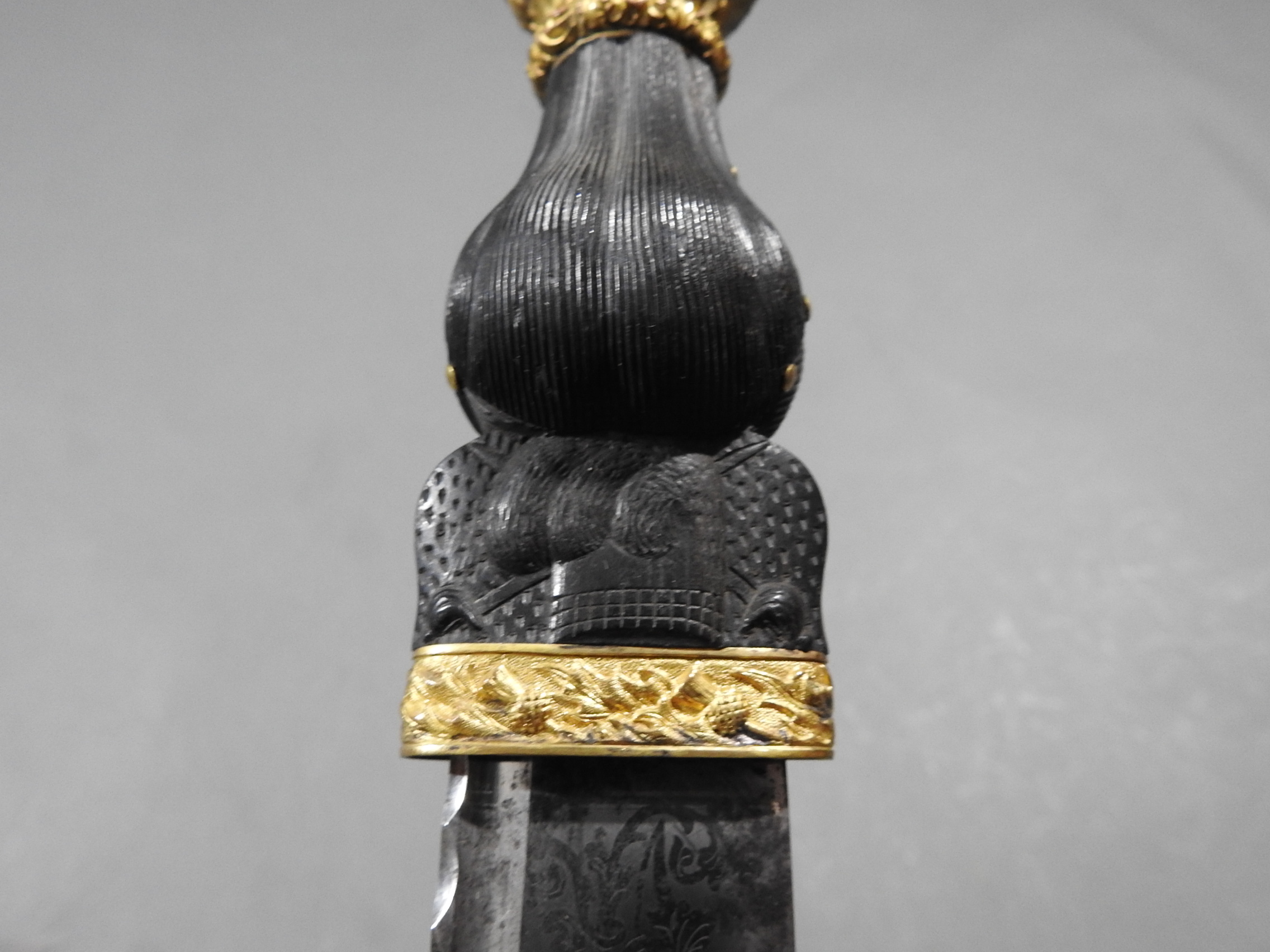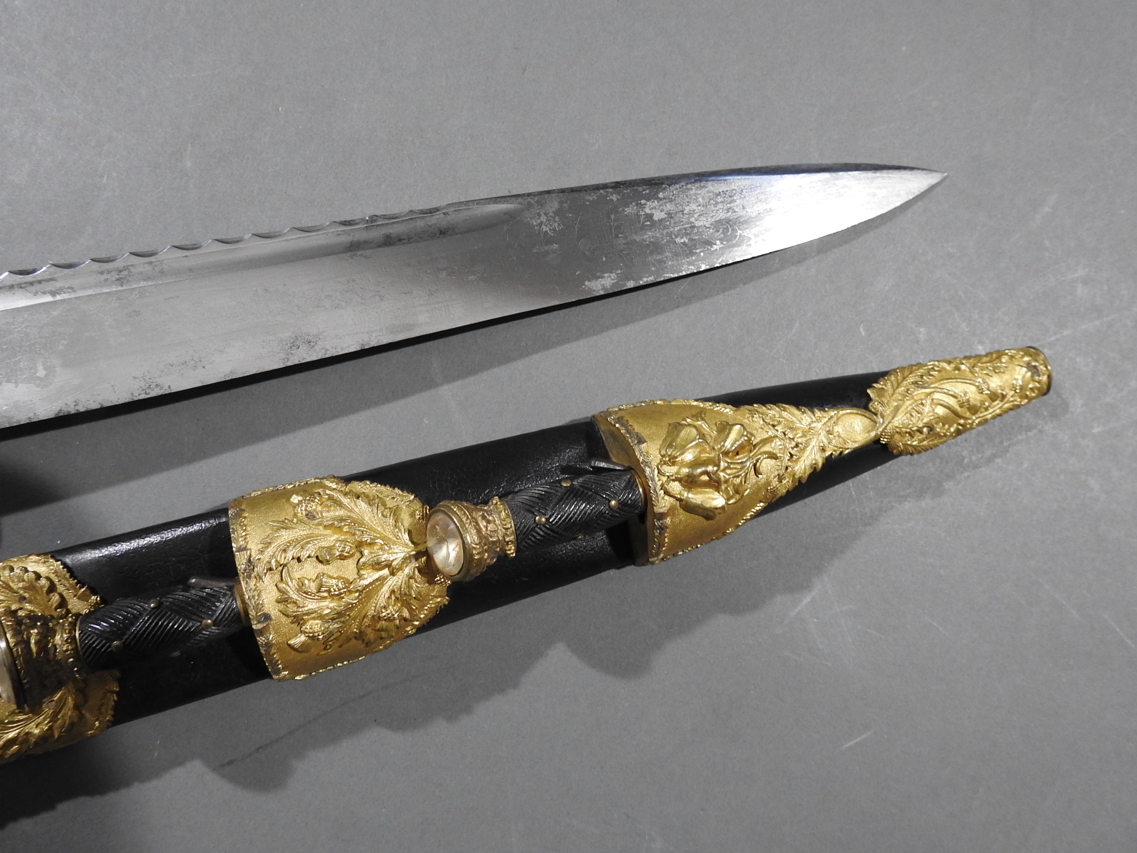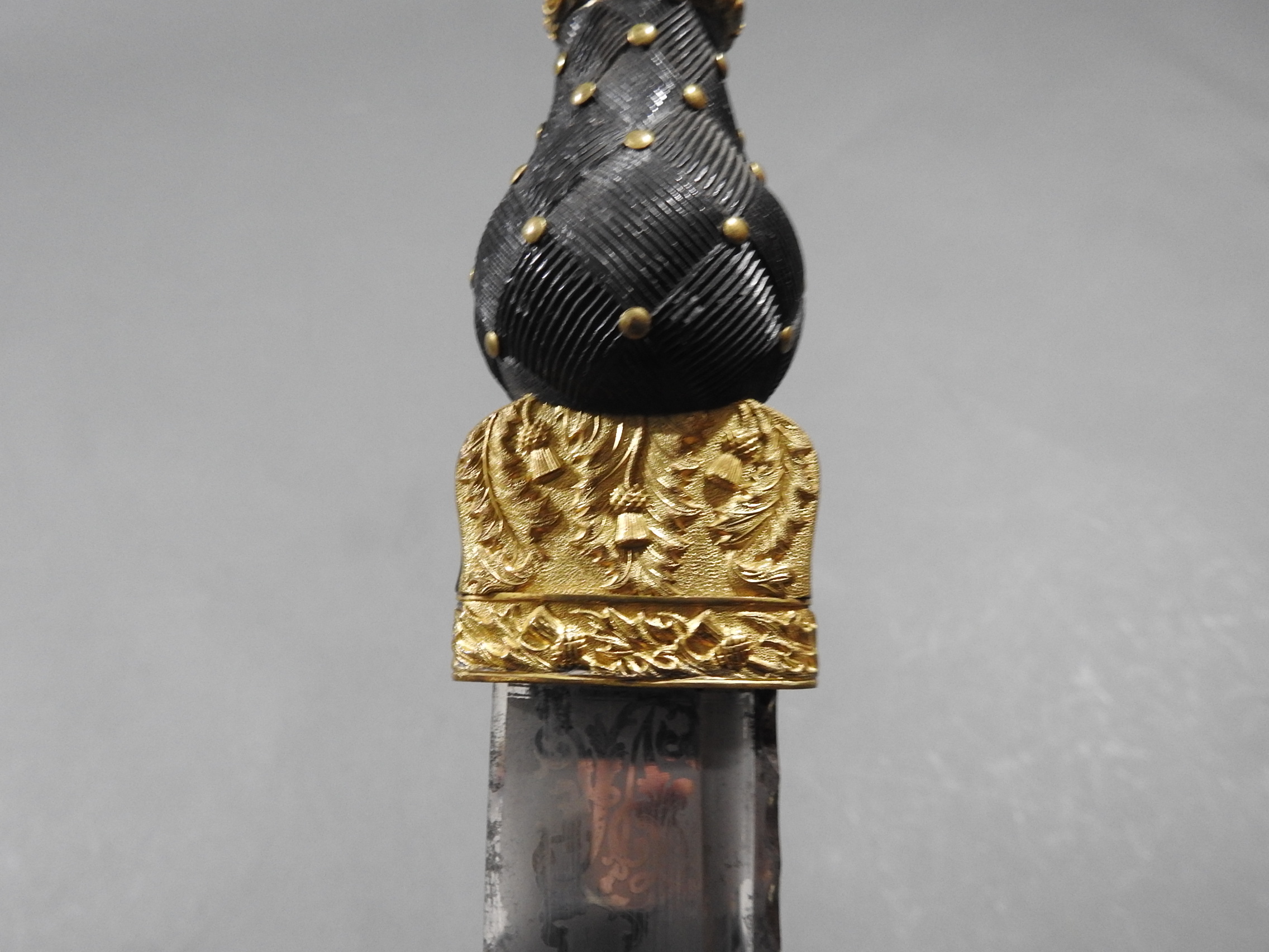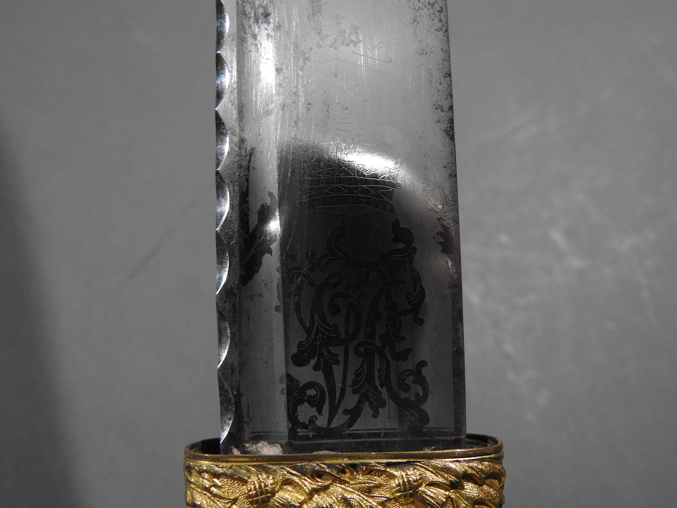 A Victorian period Scottish officers dirk for the 79th regiment Queens Own Cameron Highlanders, the 28cm double blade engraved blade with VR Crown regimental badge and battle honours although very faint plus facet edge back. Ebonised baluster set with brass studs above a gilt mount of acanthus and oak leaves the rear with crossed swords and plumed hat, in original leather scabbard with gilt mounts the marked 79th, knife and fork en suite. All in very good condition, pommel stone maybe a replacement.