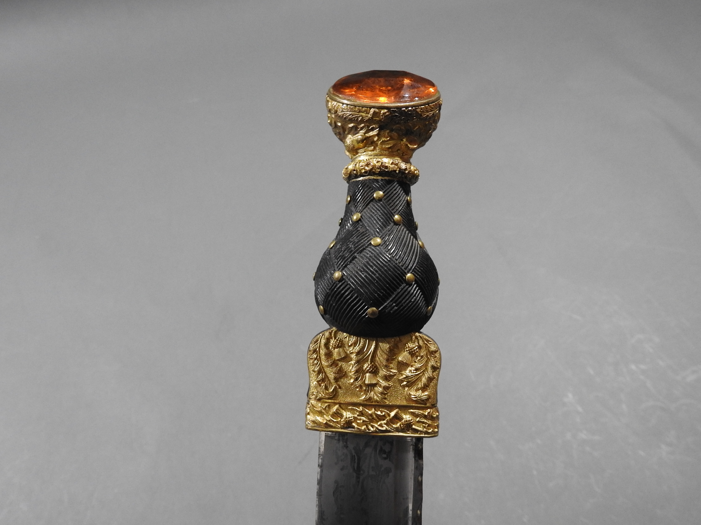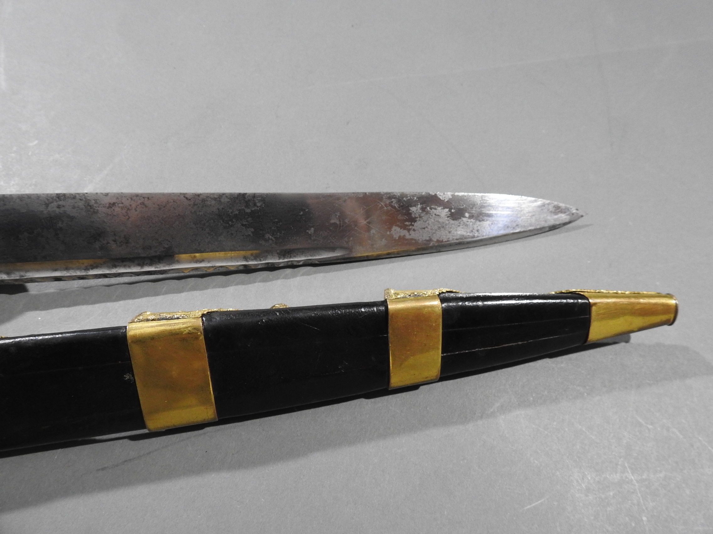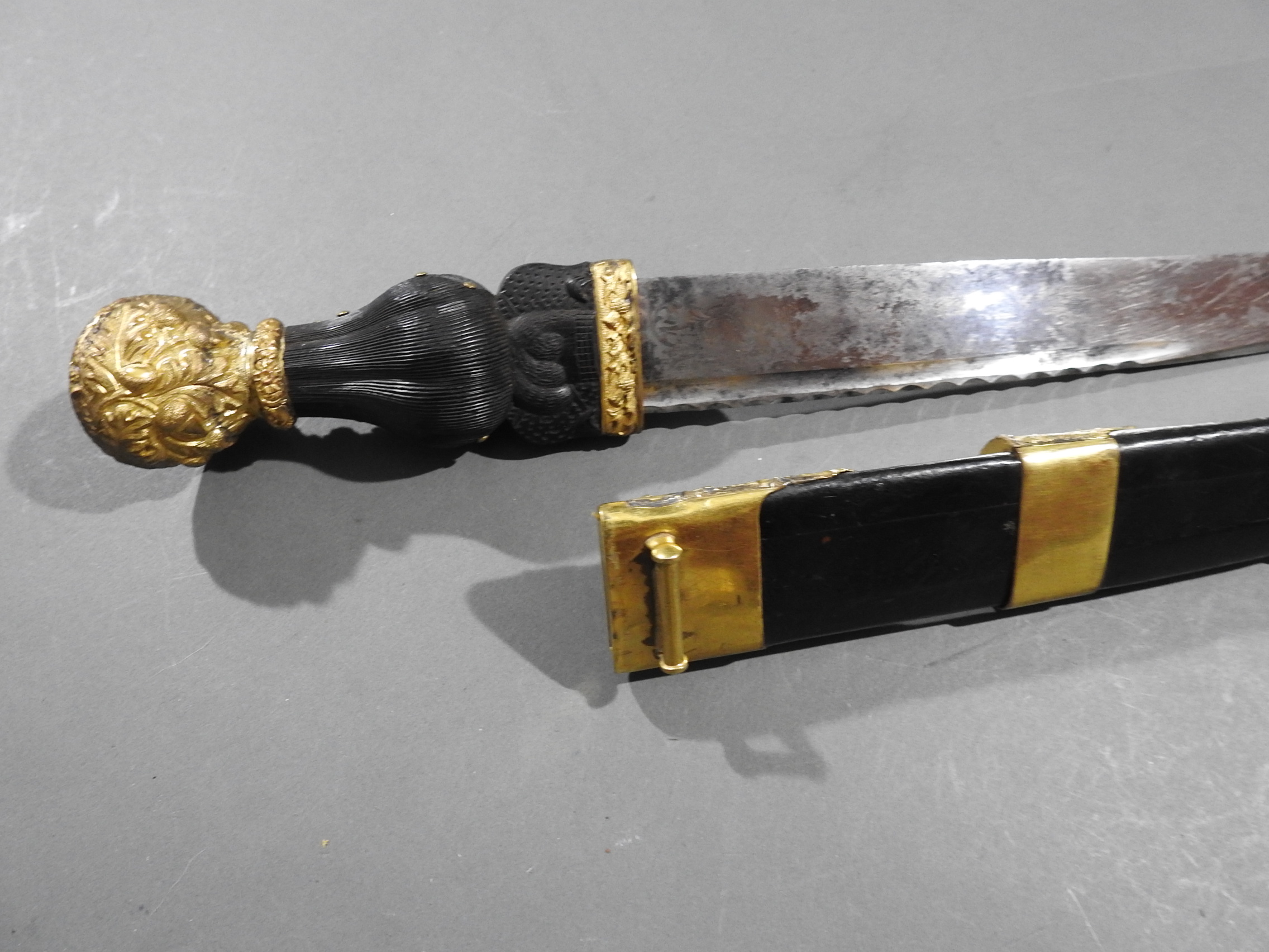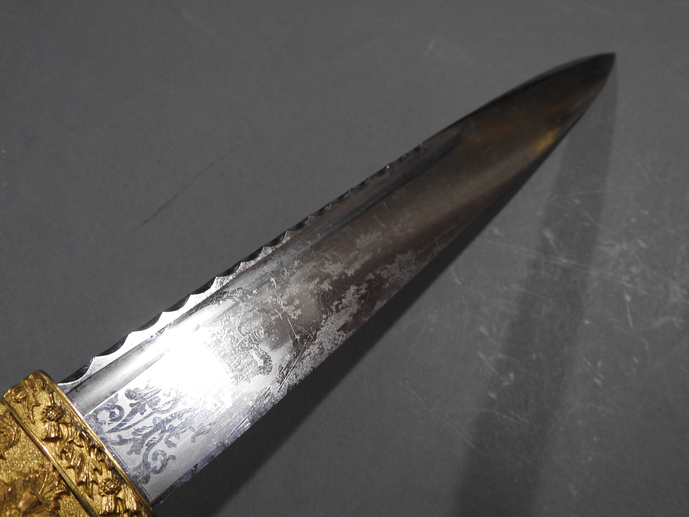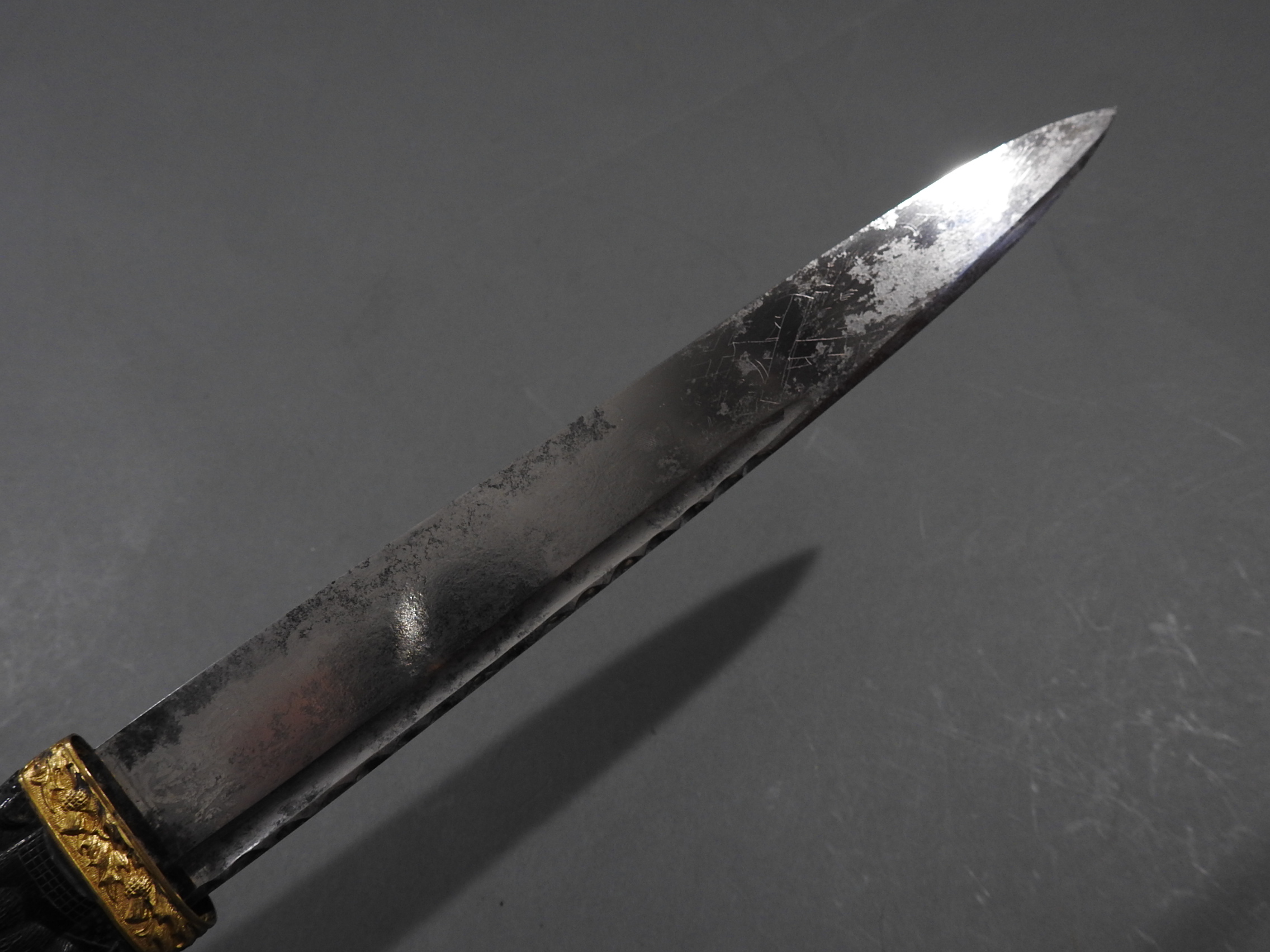 A Victorian period Scottish officers dirk for the 79th regiment Queens Own Cameron Highlanders, the 28cm double blade engraved blade with VR Crown regimental badge and battle honours although very faint plus facet edge back. Ebonised baluster set with brass studs above a gilt mount of acanthus and oak leaves the rear with crossed swords and plumed hat, in original leather scabbard with gilt mounts the marked 79th, knife and fork en suite. All in very good condition, pommel stone maybe a replacement.