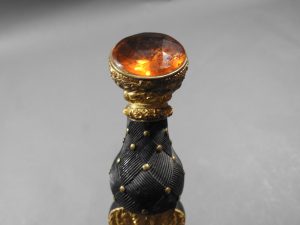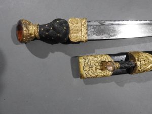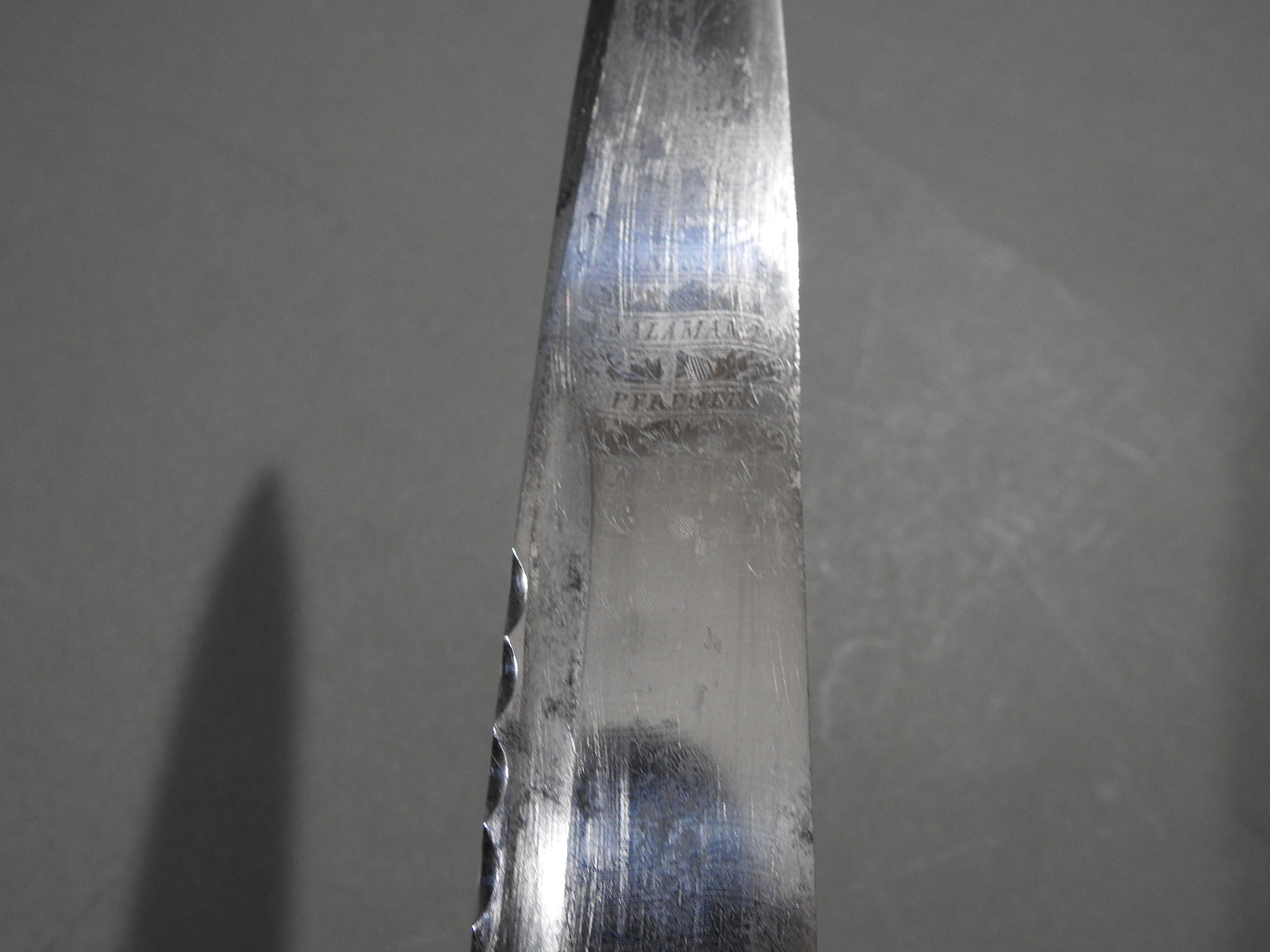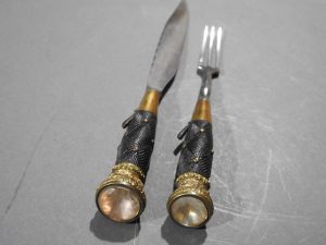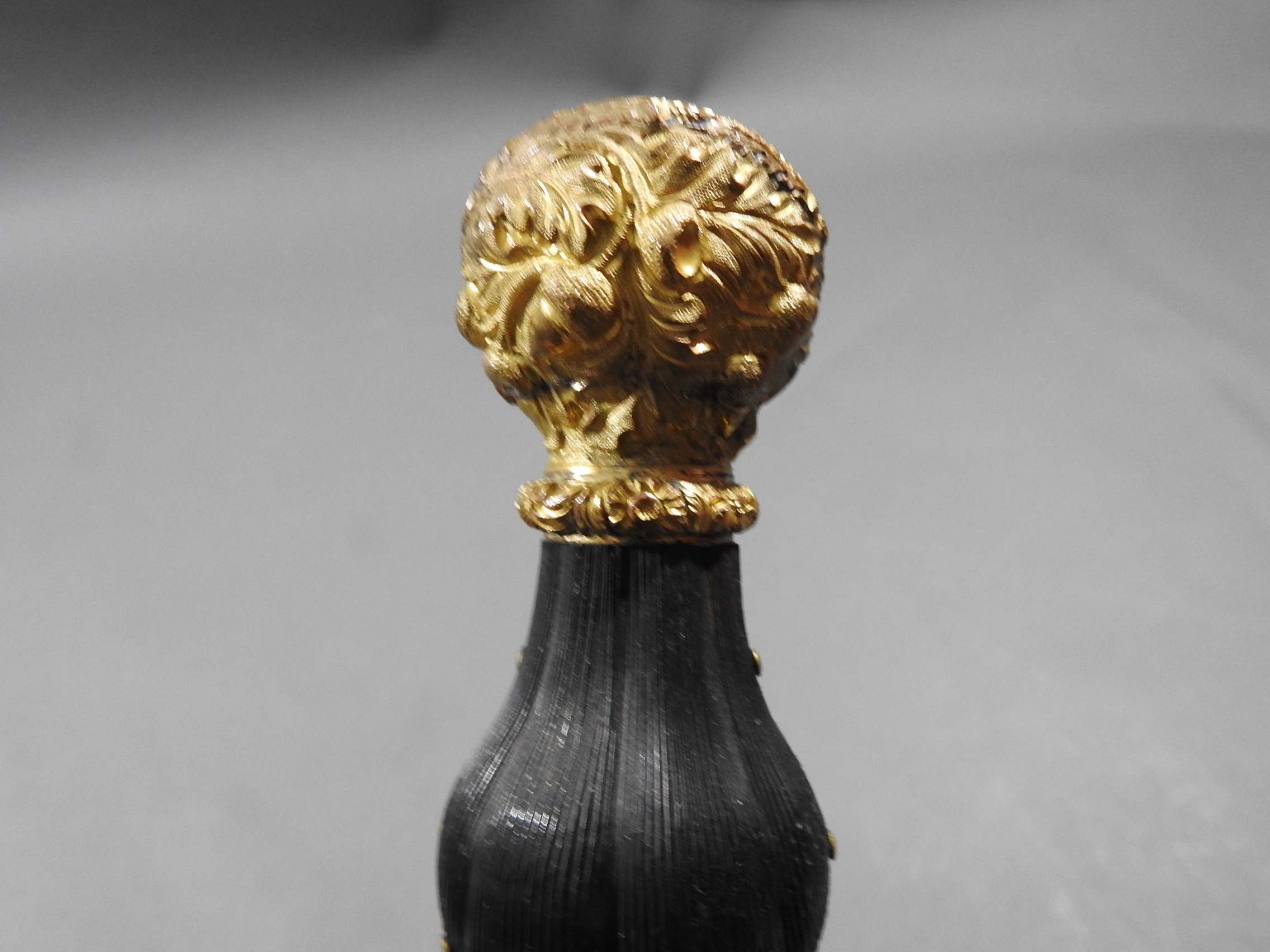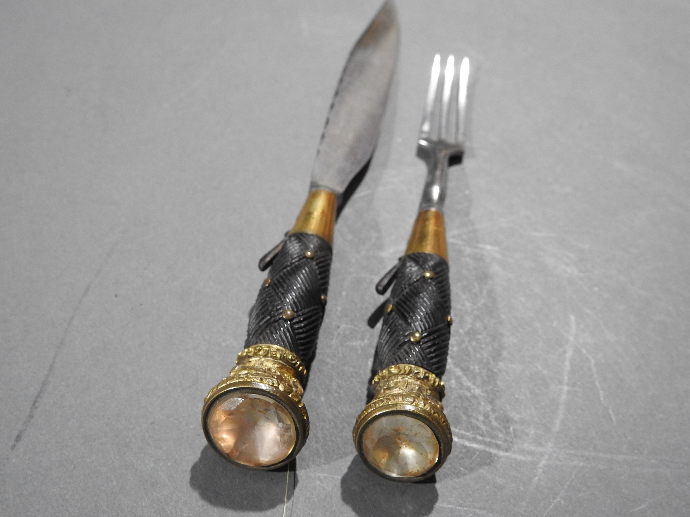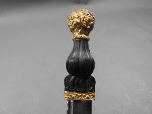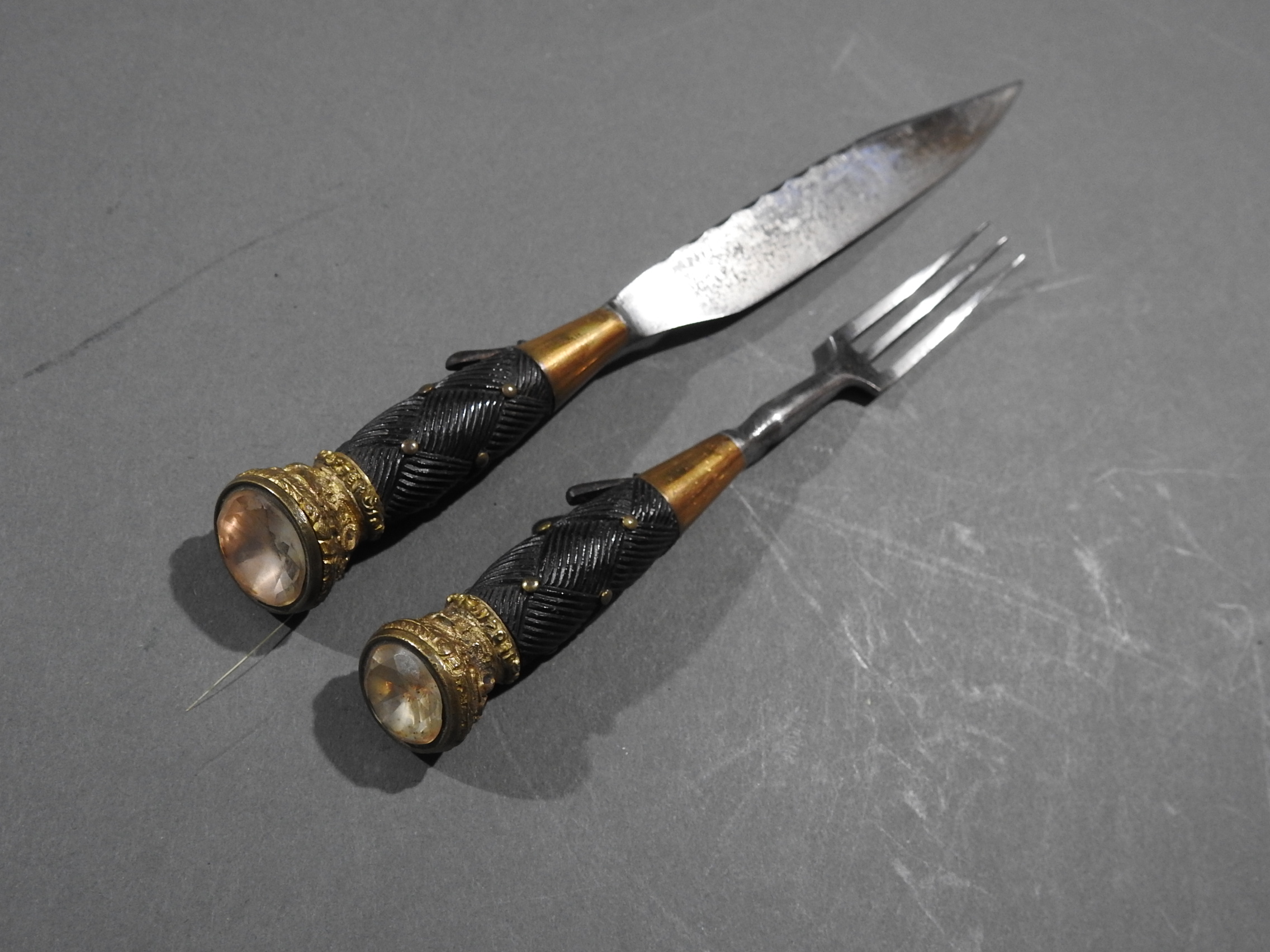 A Victorian period Scottish officers dirk for the 79th regiment Queens Own Cameron Highlanders, the 28cm double blade engraved blade with VR Crown regimental badge and battle honours although very faint plus facet edge back. Ebonised baluster set with brass studs above a gilt mount of acanthus and oak leaves the rear with crossed swords and plumed hat, in original leather scabbard with gilt mounts the marked 79th, knife and fork en suite. All in very good condition, pommel stone maybe a replacement.