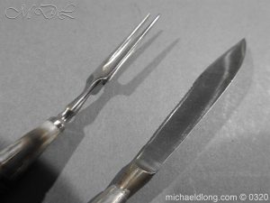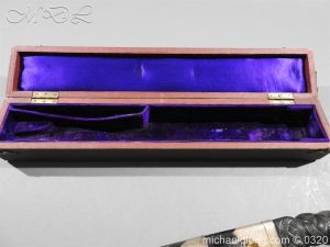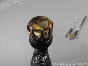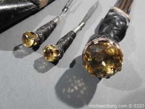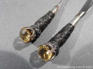 Scottish Silver mounted Dress Dirk with Clan Cockburn crest and hallmarked Edinburgh 1927 and maker marked T E Thomas Ebbutt. All the silver mounts are highly engraved with Celtic Knot designs and the top mount with family crest to centre and hallmarks to reverse. Matching stones to ensuite knife, fork and pommel all set in a claw shaped mountings. It is complete with leather bound case with purple velvet and silk lining. Over all length 18 inches the blade 11 inches note all mounts with age tarnish but will clean if required.