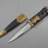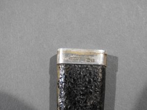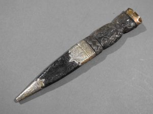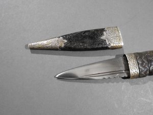 Hallmarked Birmingham 1935 marker J C and S with the initials ED overall length 17cm and with a 8cm blade – Thistle and Celtic knot design to all fittings, weave design to grip, pommel set with a stone, scabbard is leather covered all mounts hallmarked.