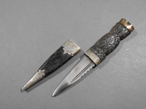 Hallmarked Birmingham 1935 marker J C and S with the initials ED overall length 17cm and with a 8cm blade – Thistle and Celtic knot design to all fittings, weave design to grip, pommel set with a stone, scabbard is leather covered all mounts hallmarked.