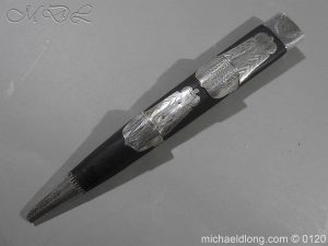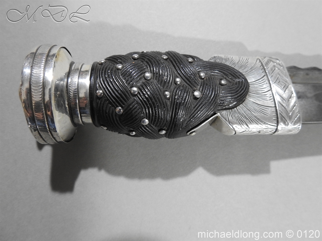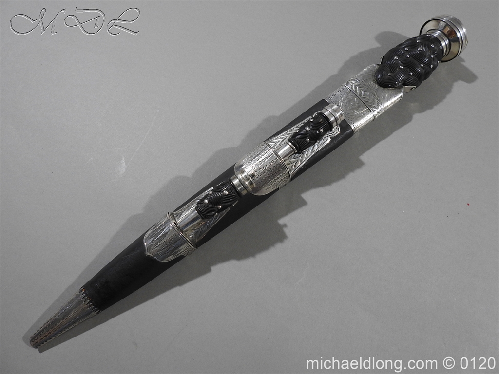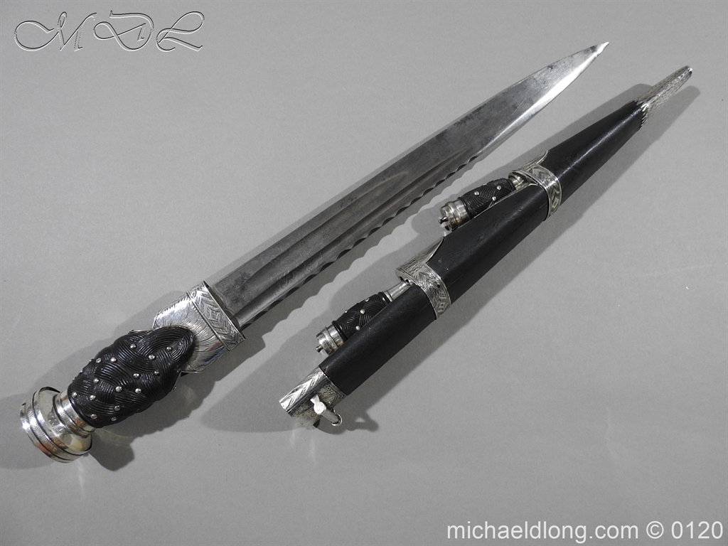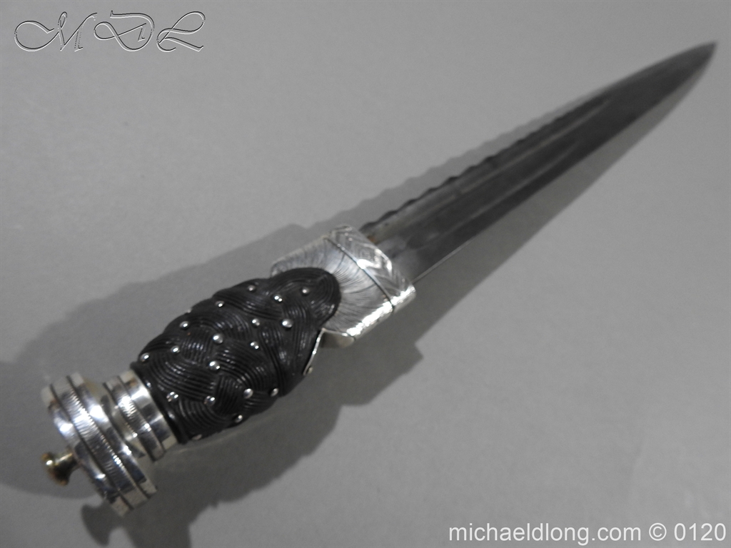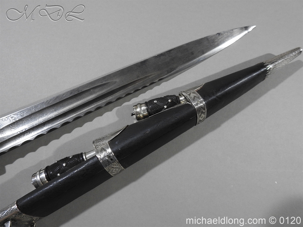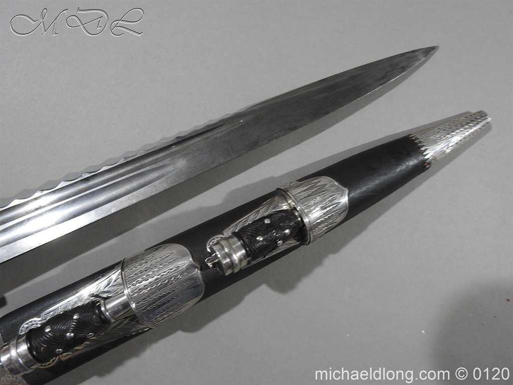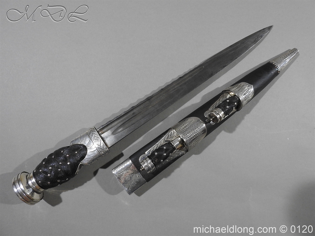 With fullered blade notched along the back and with false double edge at the point, etched along one side with maker Pillin London and Victorian Royal coat of Arms, ebonised baluster grip carved with basket weave set with silver studs, silver mounts comprising heavy engraved with floral and line designs, in original wood-lined black leather scabbard with matching mounts plus by-knife and fork en suite with the dirk. Note the mounts test as silver but no hallmark.