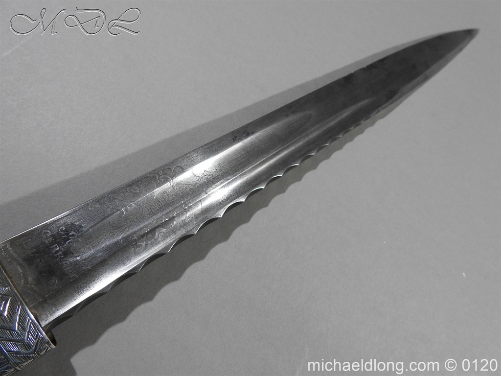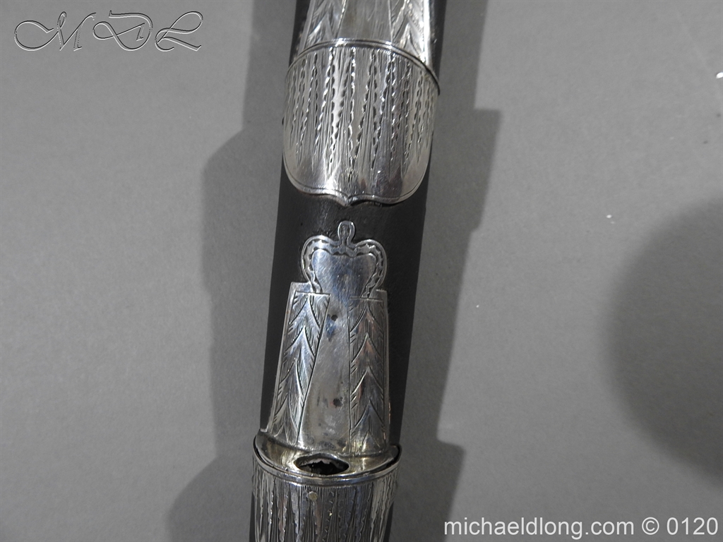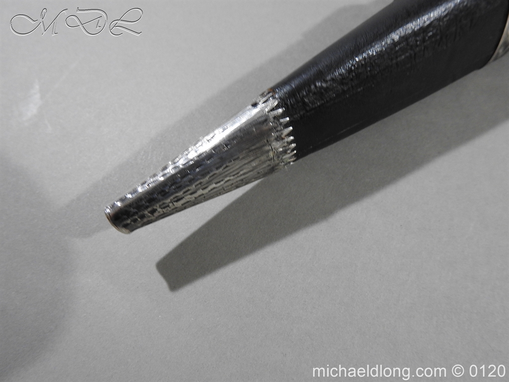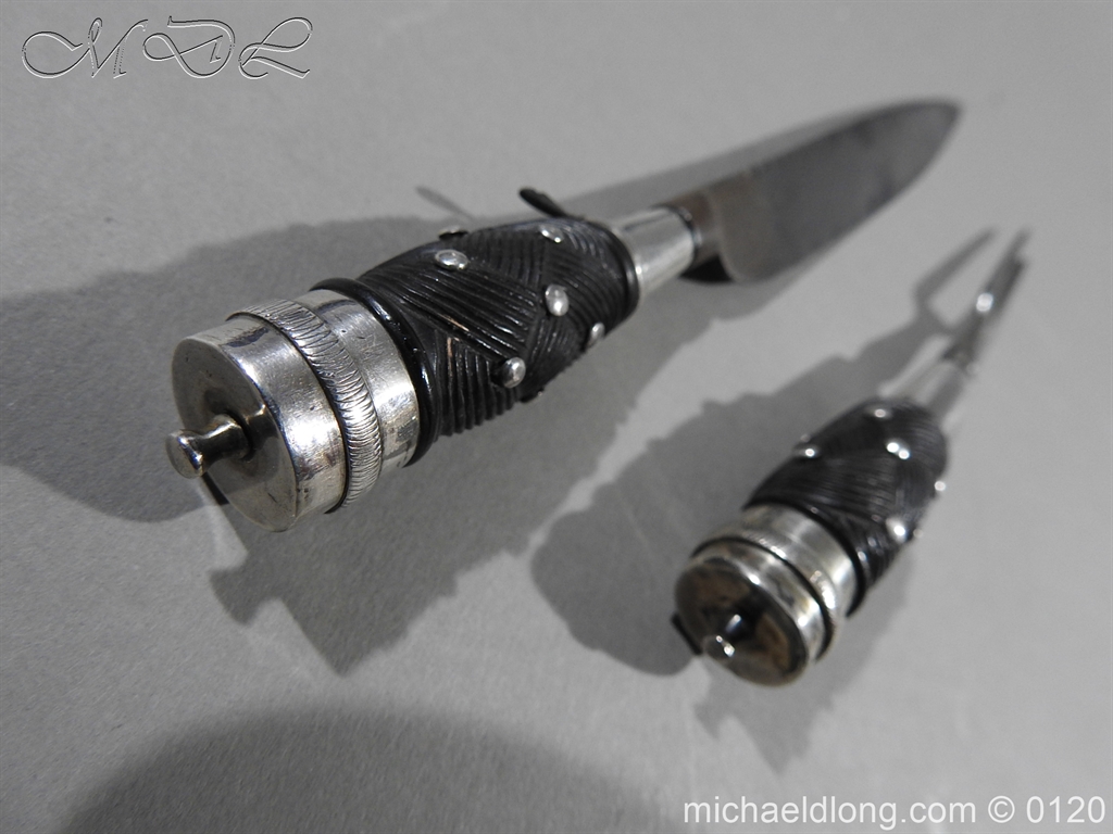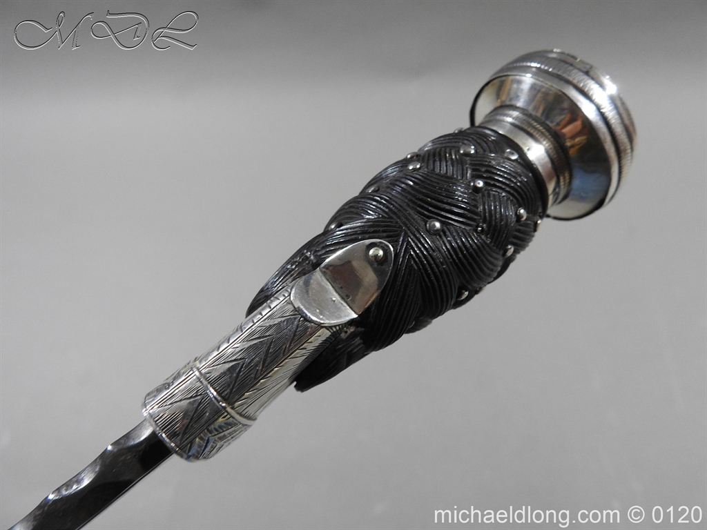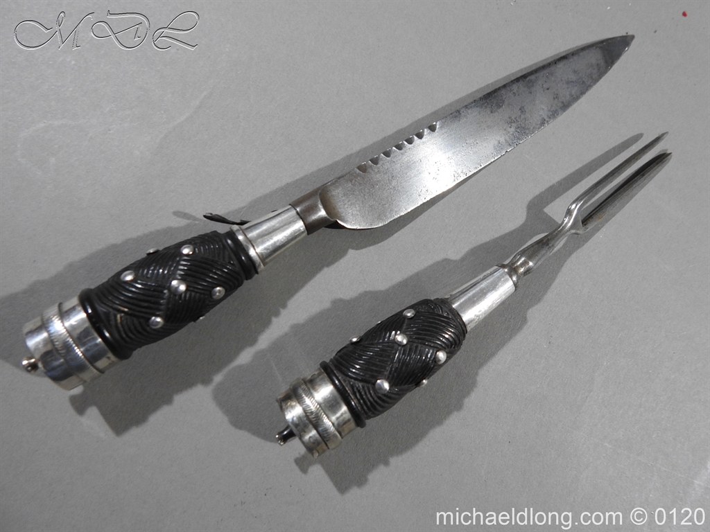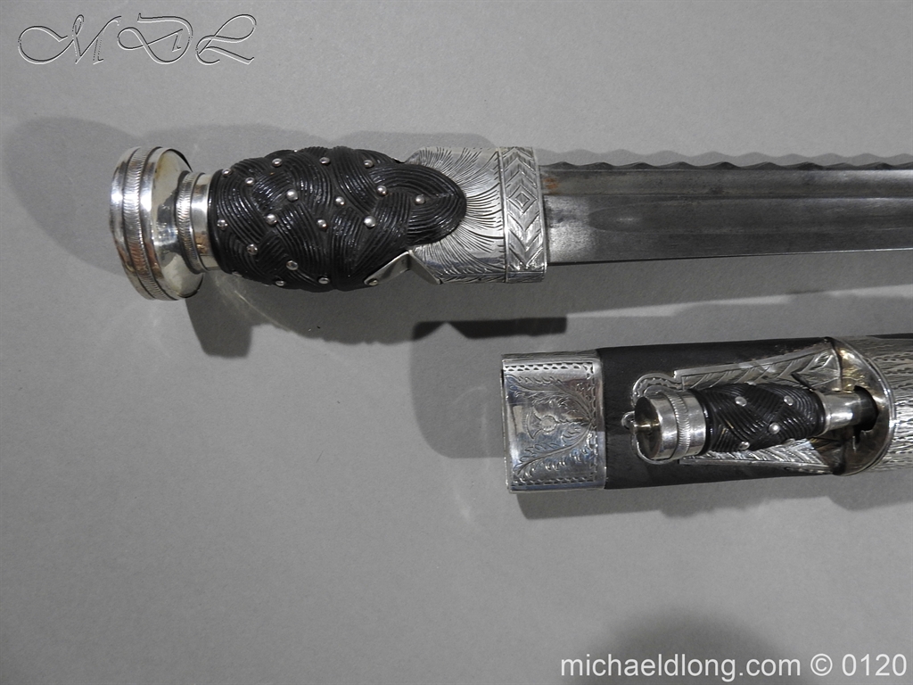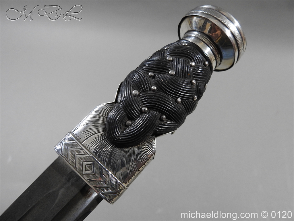 With fullered blade notched along the back and with false double edge at the point, etched along one side with maker Pillin London and Victorian Royal coat of Arms, ebonised baluster grip carved with basket weave set with silver studs, silver mounts comprising heavy engraved with floral and line designs, in original wood-lined black leather scabbard with matching mounts plus by-knife and fork en suite with the dirk. Note the mounts test as silver but no hallmark.