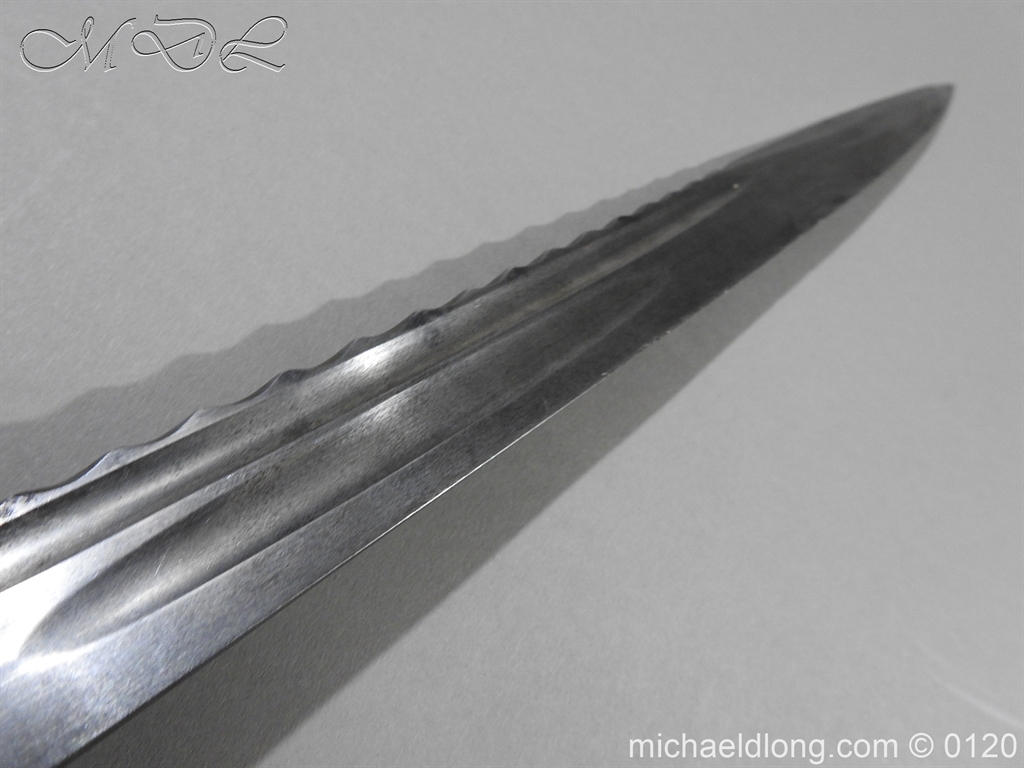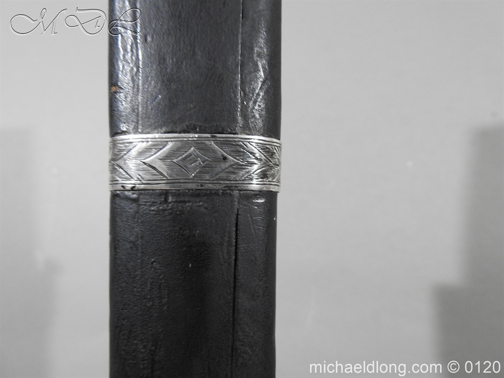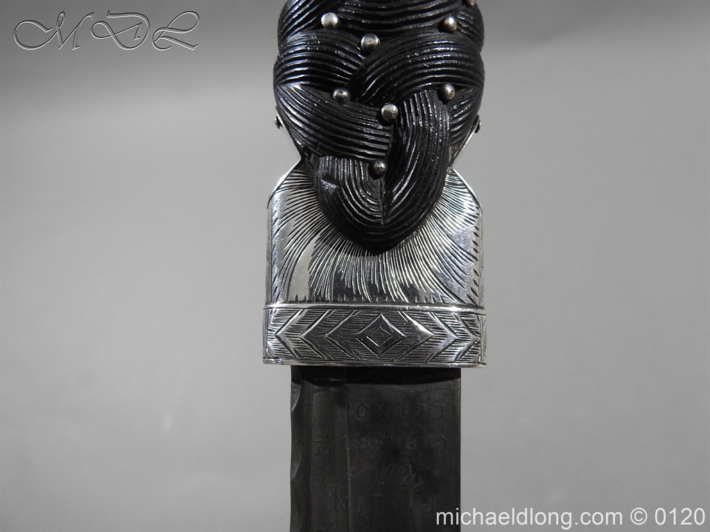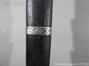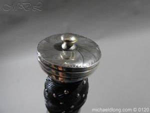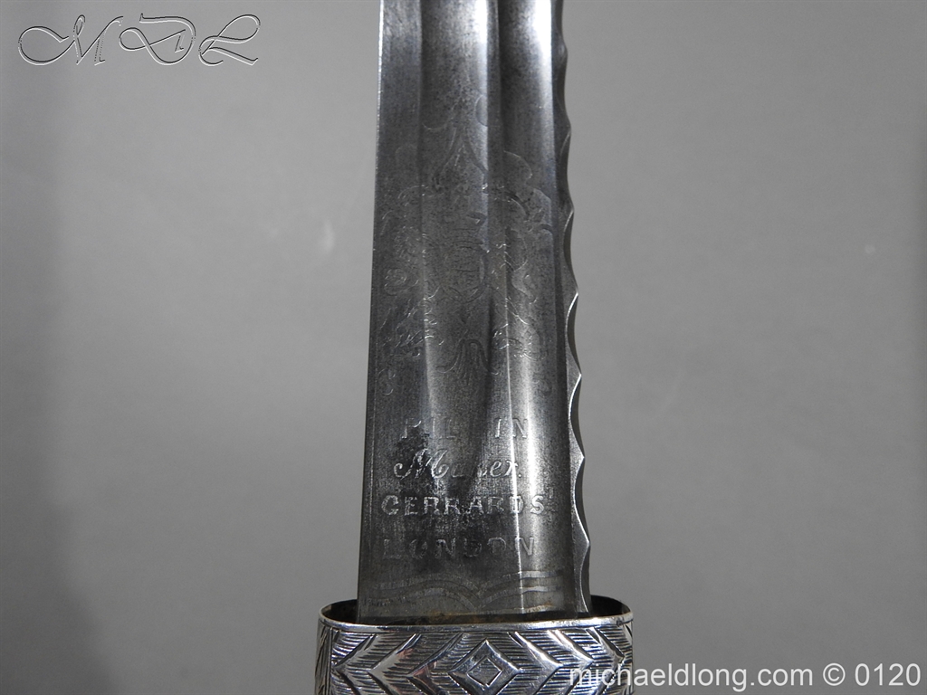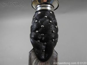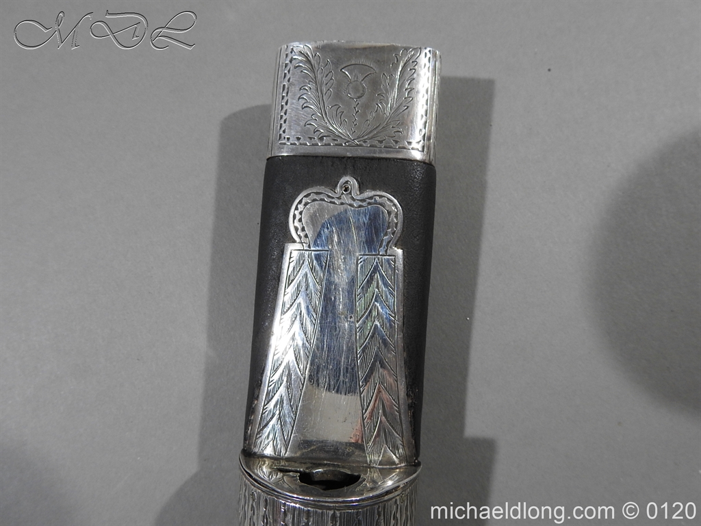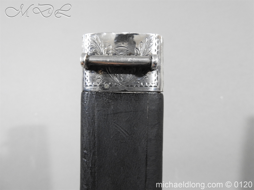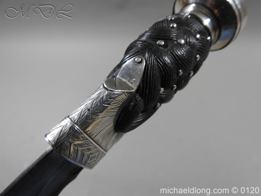 With fullered blade notched along the back and with false double edge at the point, etched along one side with maker Pillin London and Victorian Royal coat of Arms, ebonised baluster grip carved with basket weave set with silver studs, silver mounts comprising heavy engraved with floral and line designs, in original wood-lined black leather scabbard with matching mounts plus by-knife and fork en suite with the dirk. Note the mounts test as silver but no hallmark.