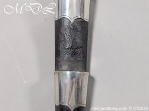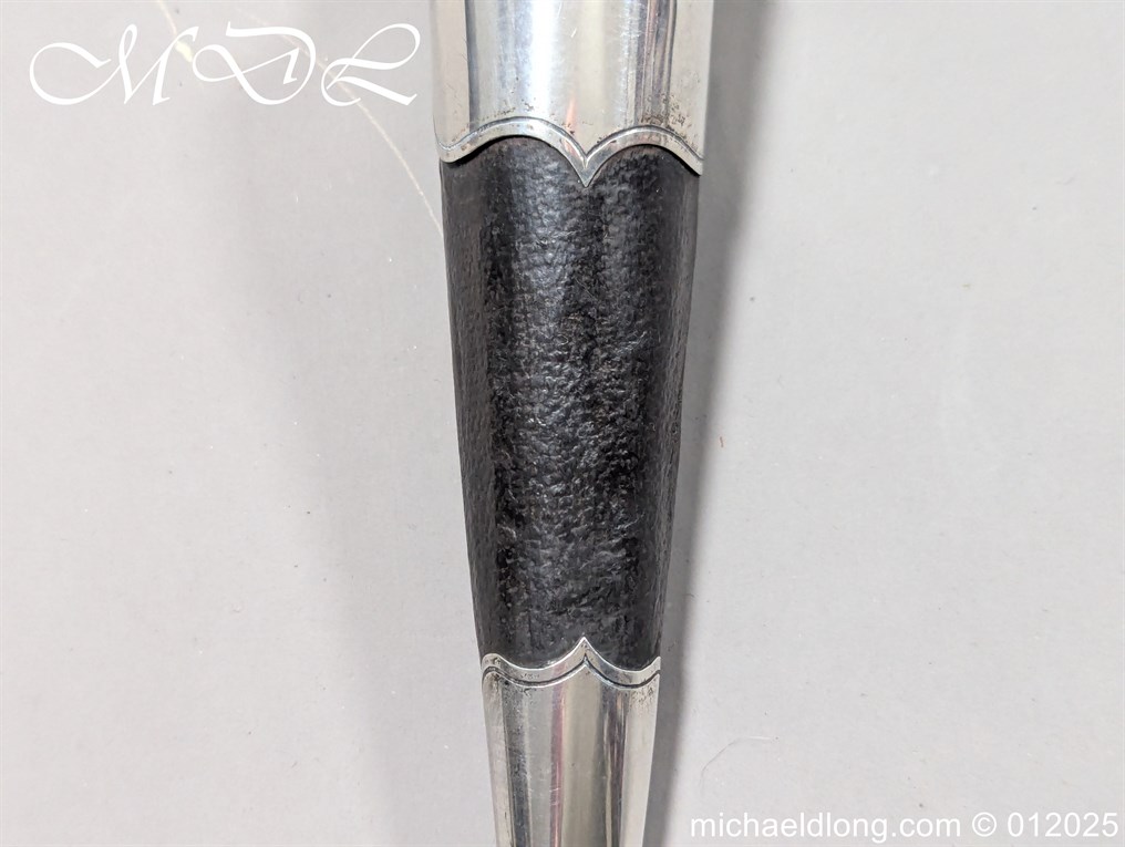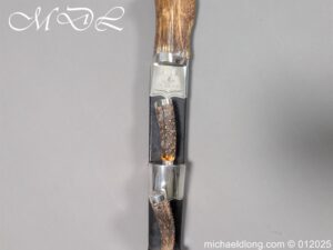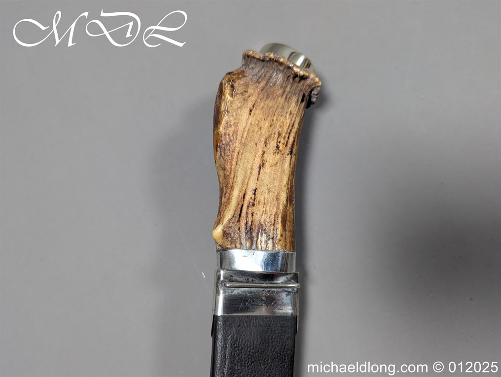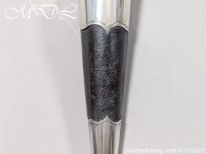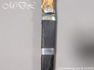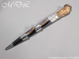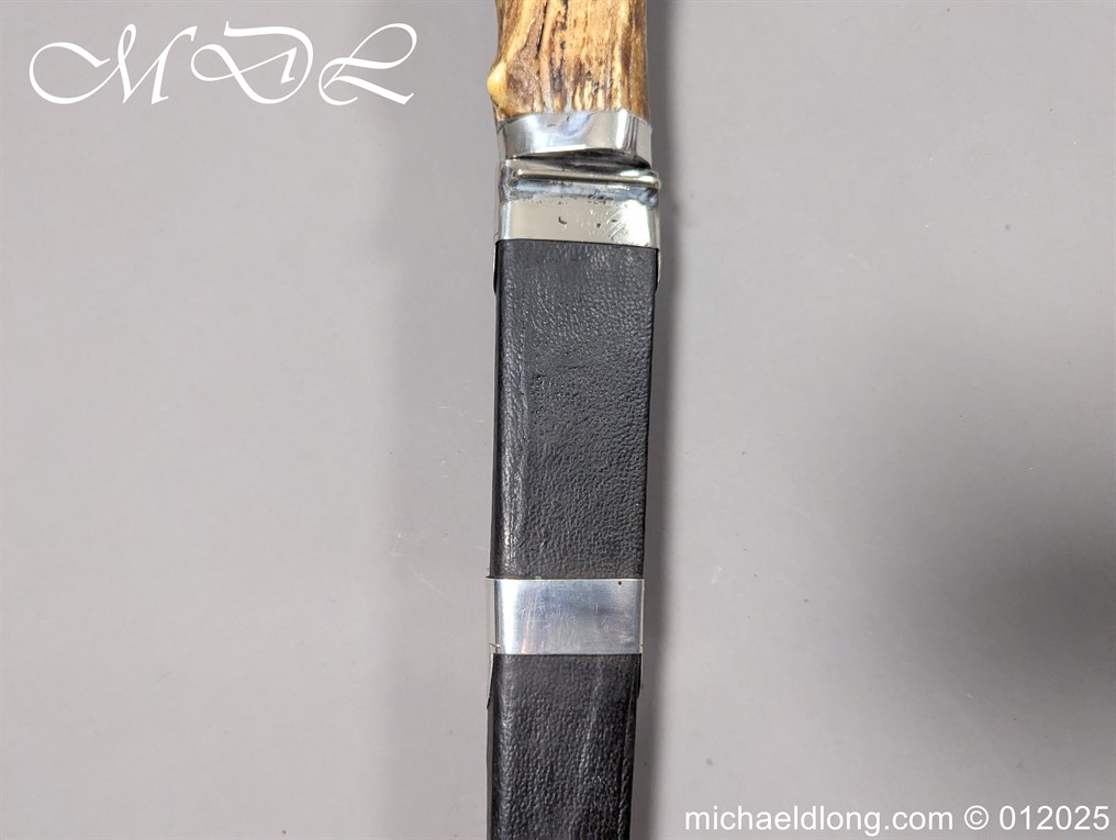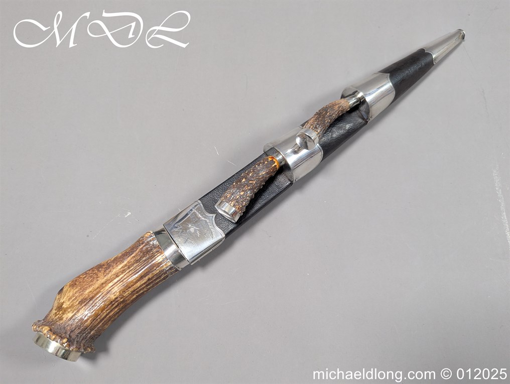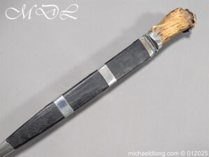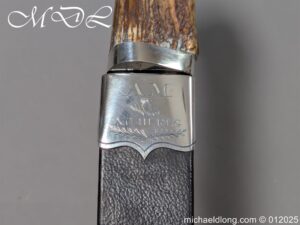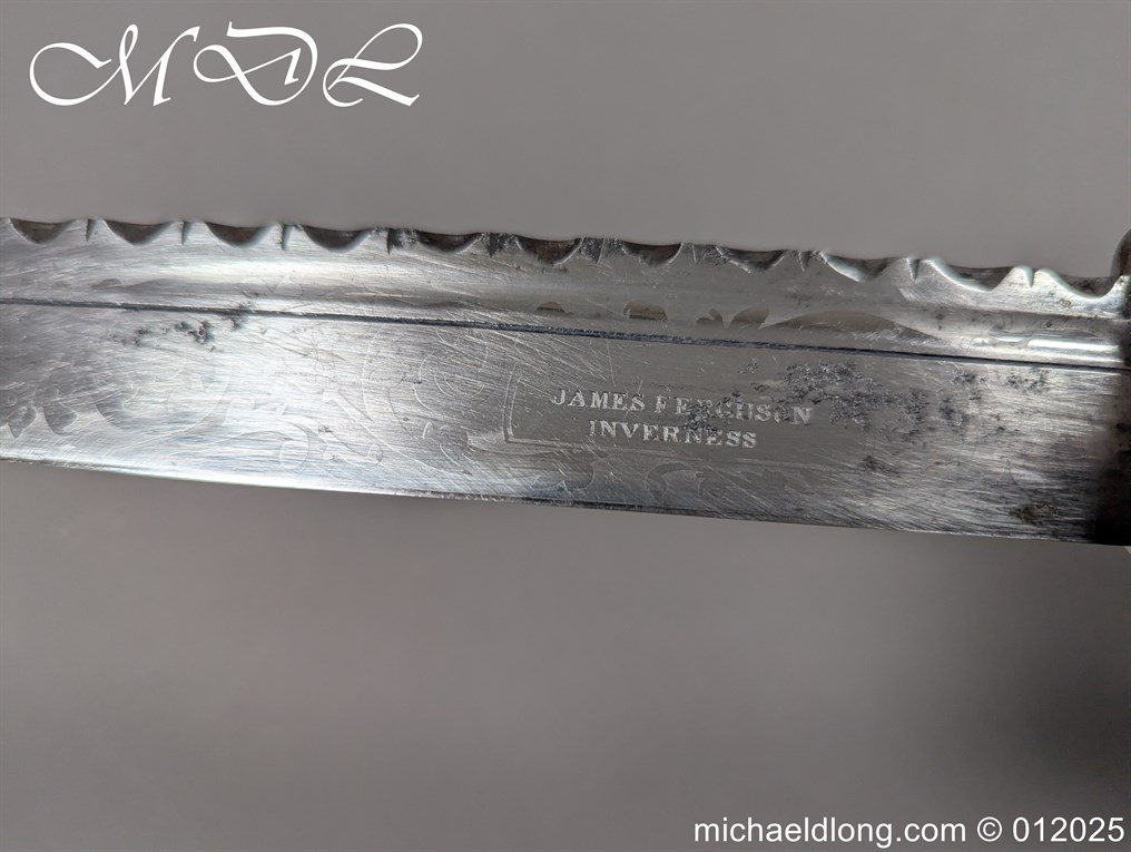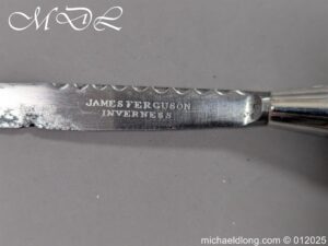 Scottish 93rd Regimental Dirk to General Alexander MacIintosh. Made by James Ferguson Inverness with stag horn grips finished with silver caps all engraved with family crest. The blade with faint engraving and maker marked, notched along the back and with false double edge at the point. The black leather scabbard with silver matching mounts, the top one engraved with the initials A M, Thistle and X C I I I REG please note age wear to bottom mount. Overall length 42cm the blade 29..5cm – No hallmarks but fittings test as silver
