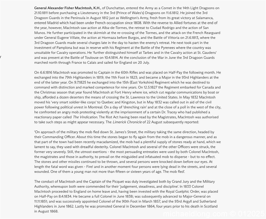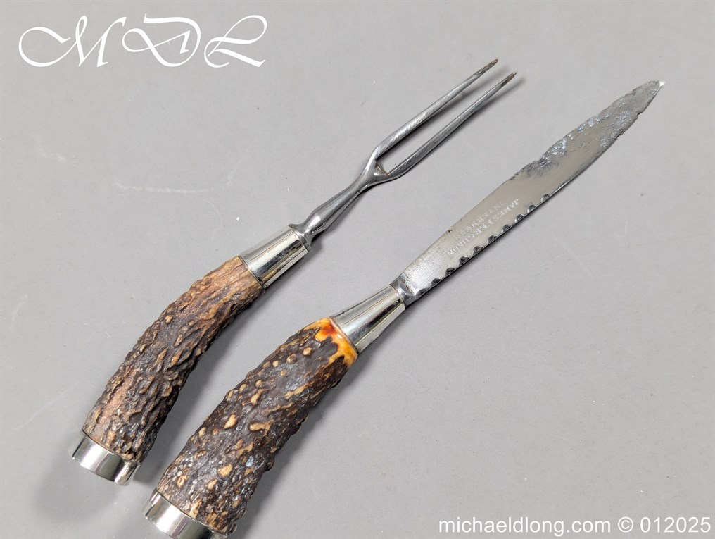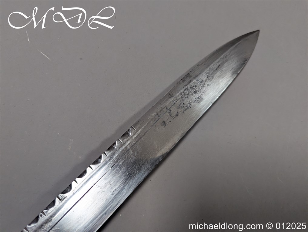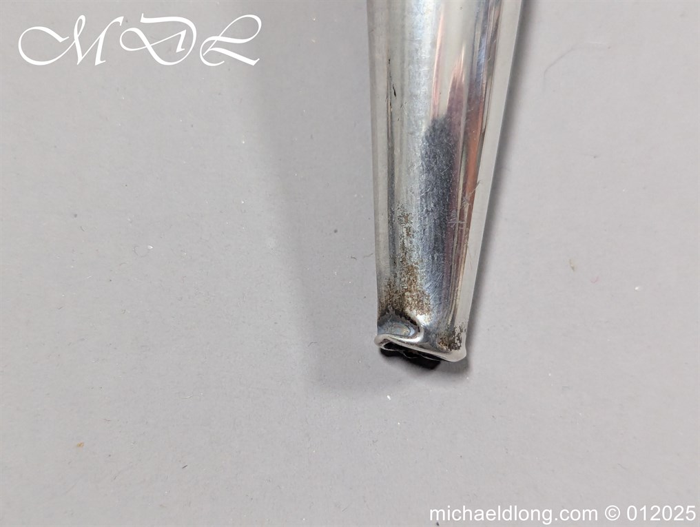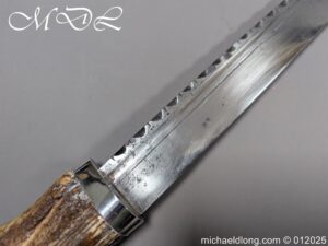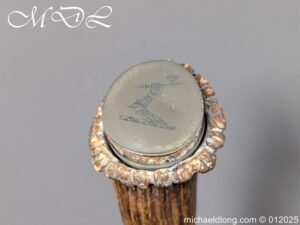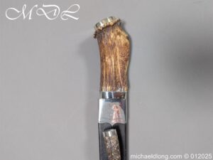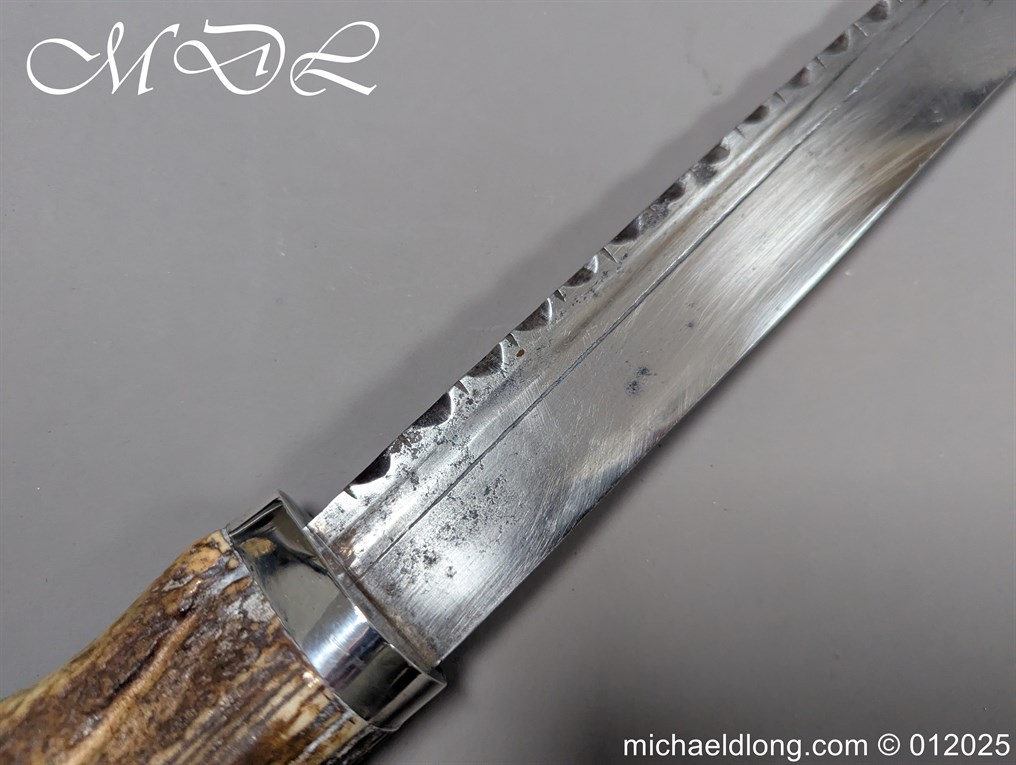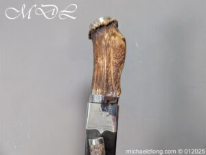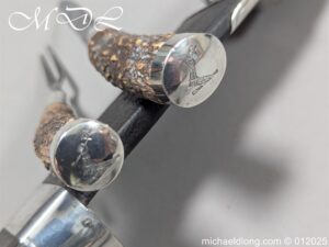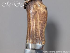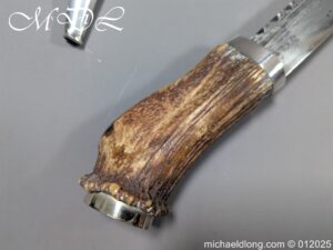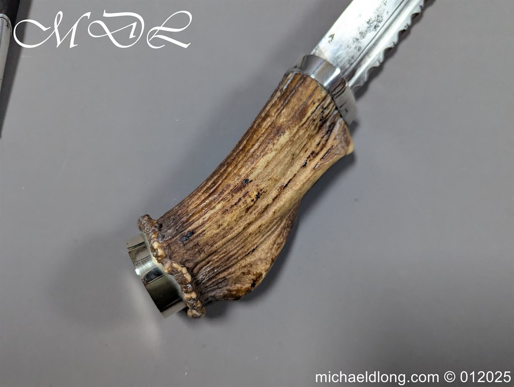 Scottish 93rd Regimental Dirk to General Alexander MacIintosh. Made by James Ferguson Inverness with stag horn grips finished with silver caps all engraved with family crest. The blade with faint engraving and maker marked, notched along the back and with false double edge at the point. The black leather scabbard with silver matching mounts, the top one engraved with the initials A M, Thistle and X C I I I REG please note age wear to bottom mount. Overall length 42cm the blade 29..5cm – No hallmarks but fittings test as silver