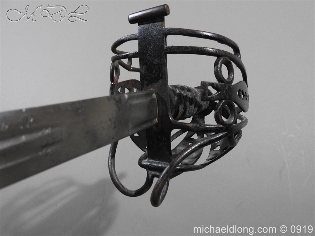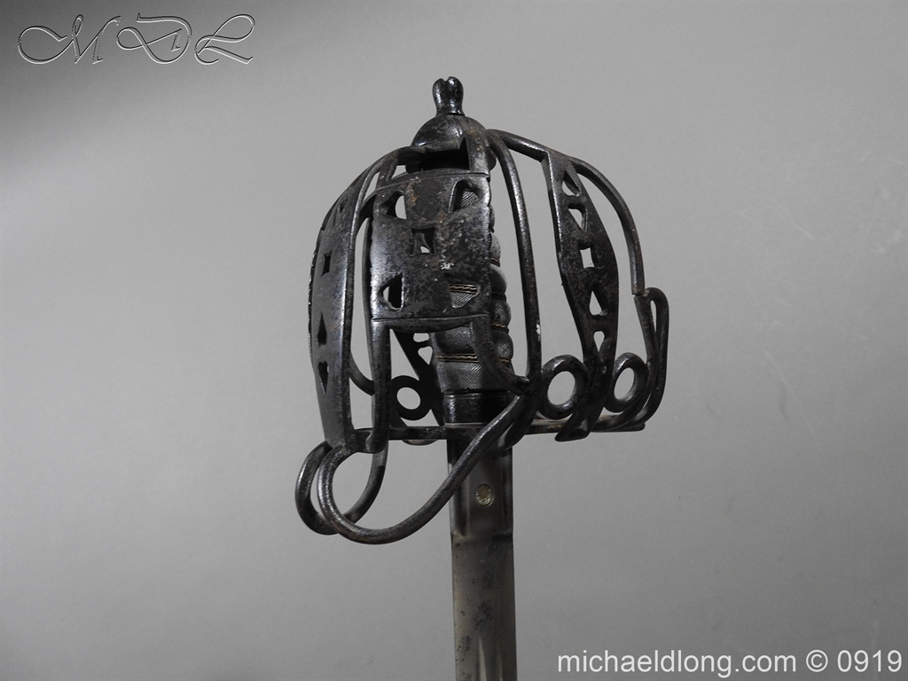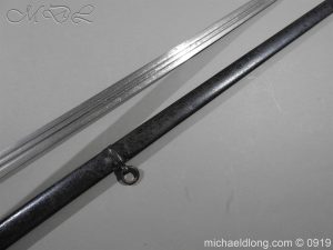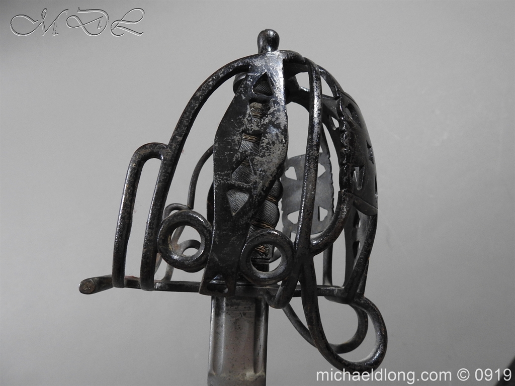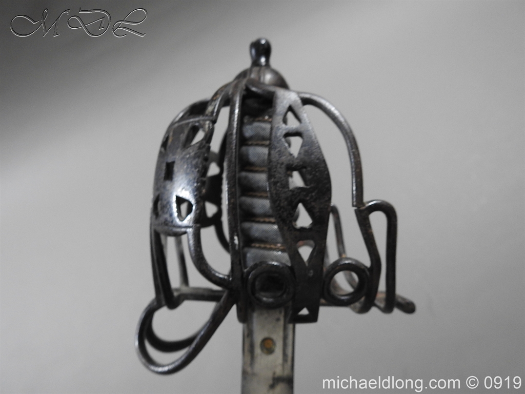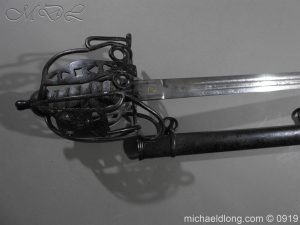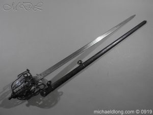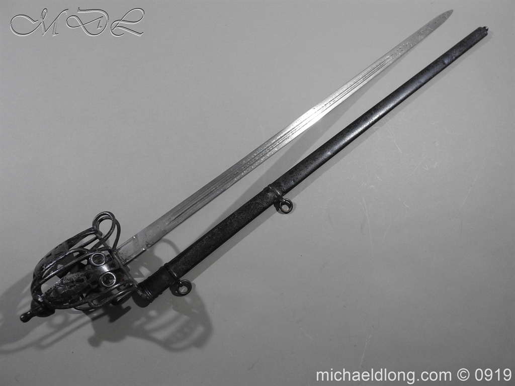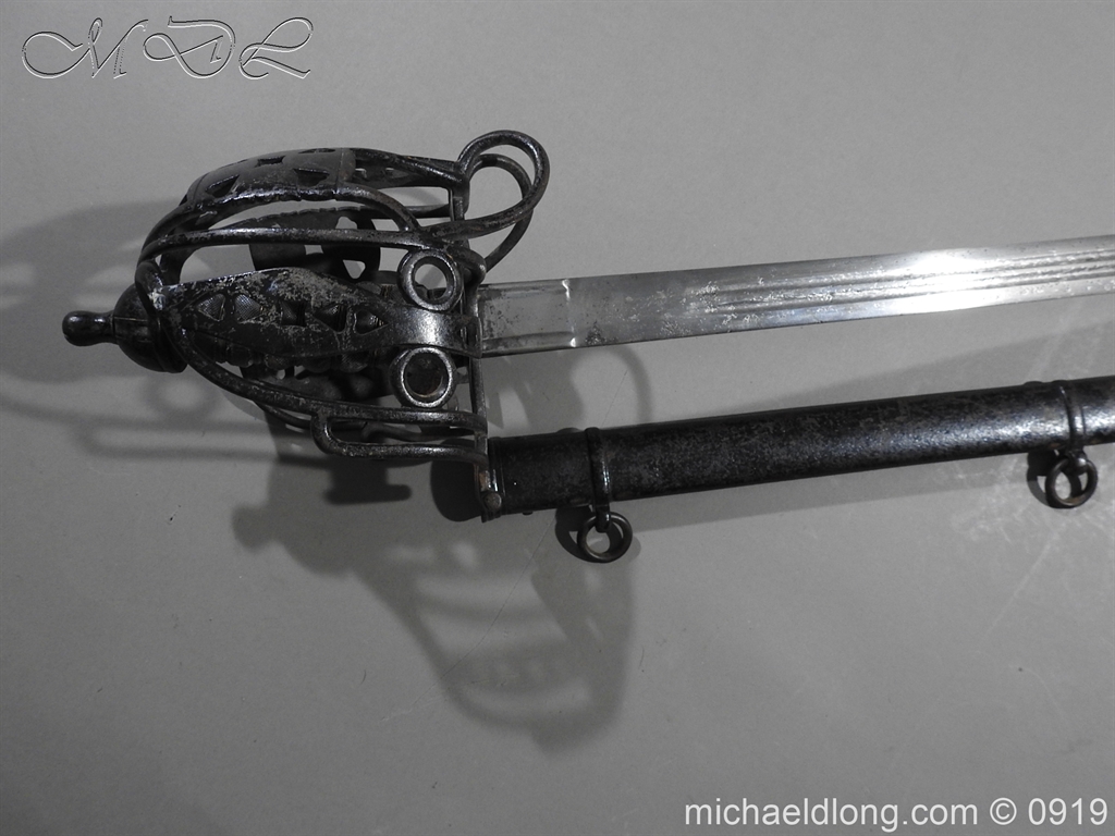 Scottish Victorian Basket Hilt Sword with regulation hilt and fish skin grip with age wear towards pommel. Straight double edged broad sword blade with makers name and proof plug to reverse has been cleaning no engraving visible complete with matching steel scabbard. Dark finish to the sword and scabbard possibly Boar War period