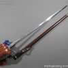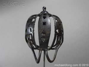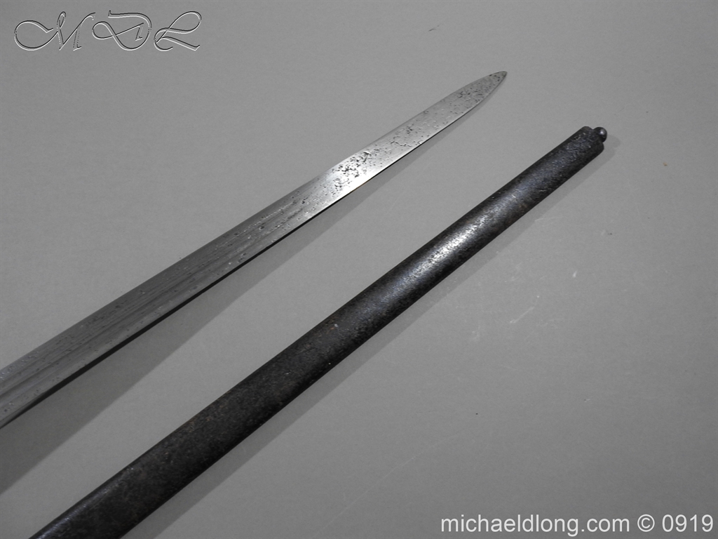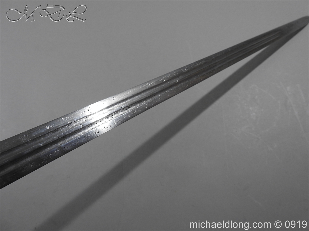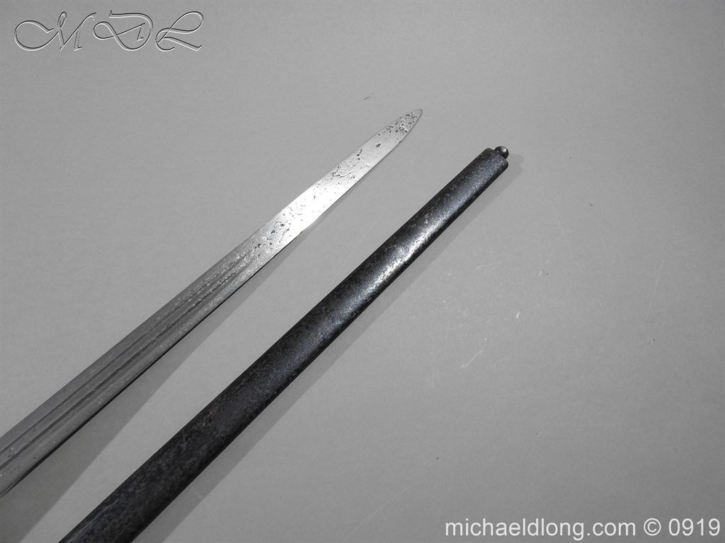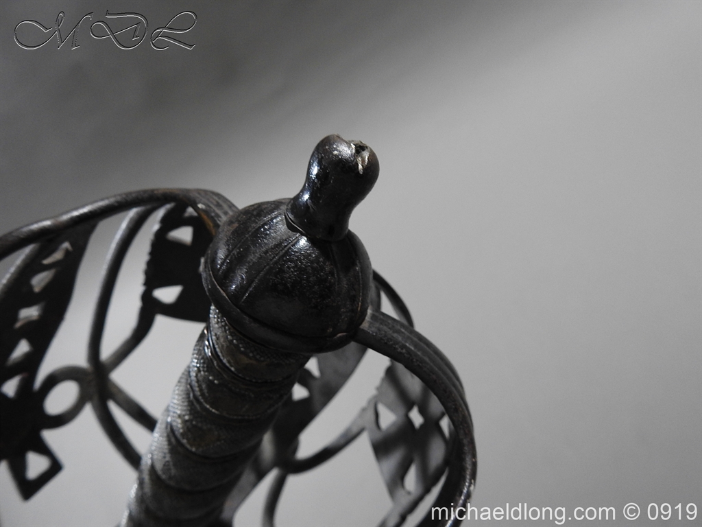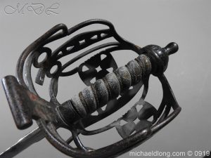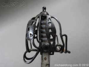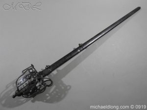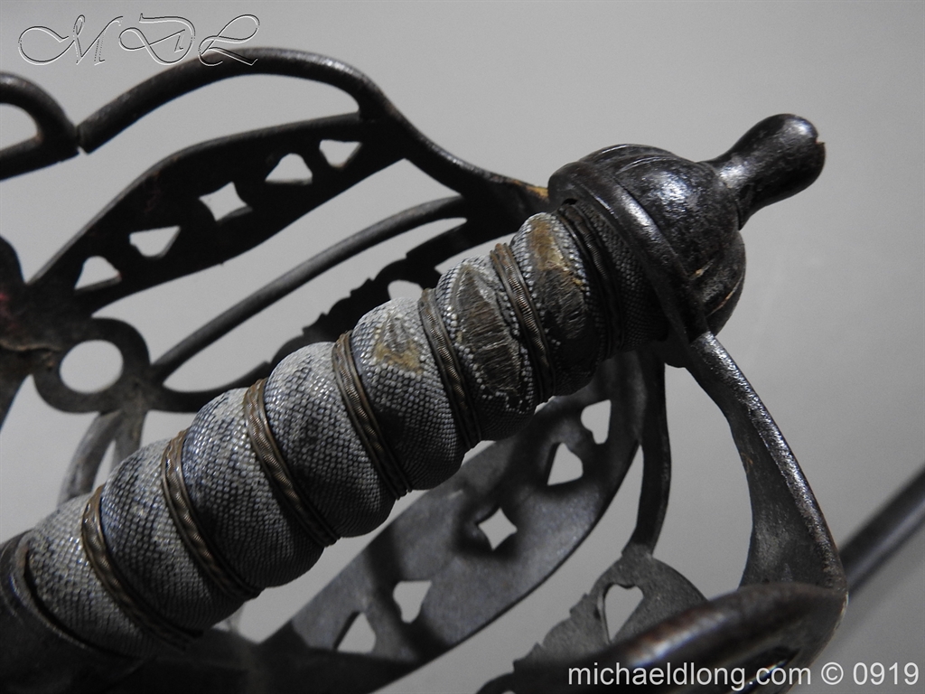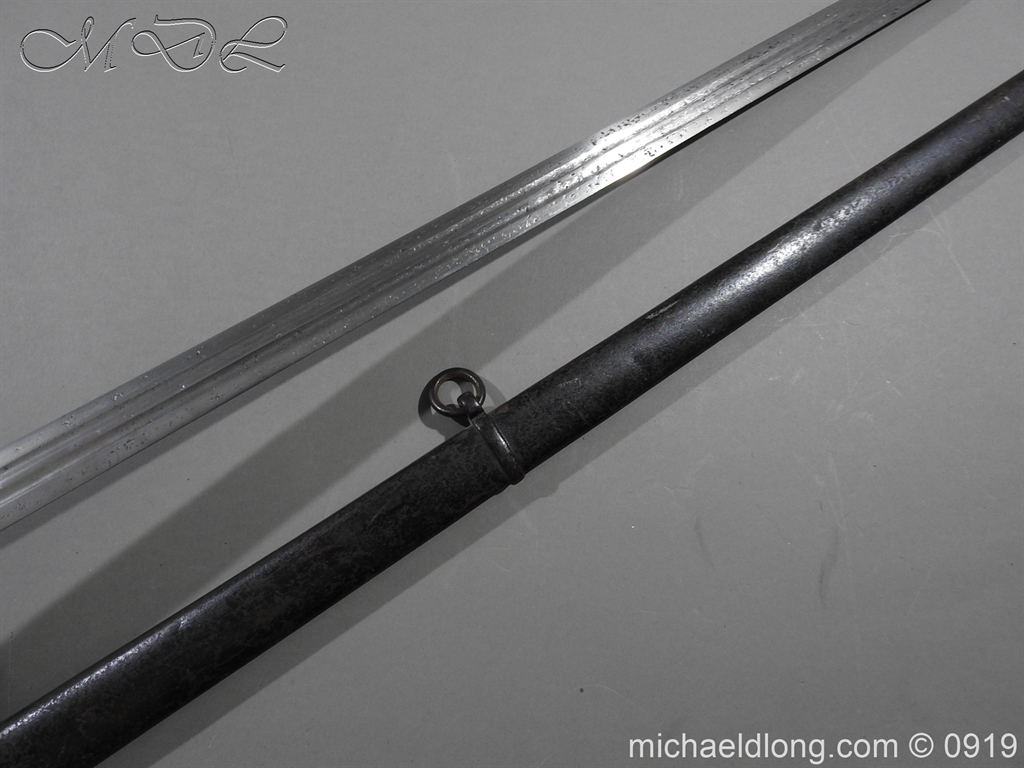 Scottish Victorian Basket Hilt Sword with regulation hilt and fish skin grip with age wear towards pommel. Straight double edged broad sword blade with makers name and proof plug to reverse has been cleaning no engraving visible complete with matching steel scabbard. Dark finish to the sword and scabbard possibly Boar War period