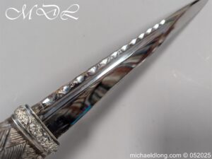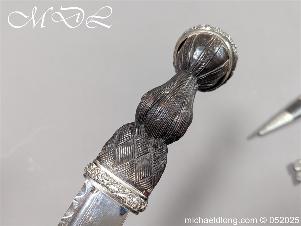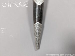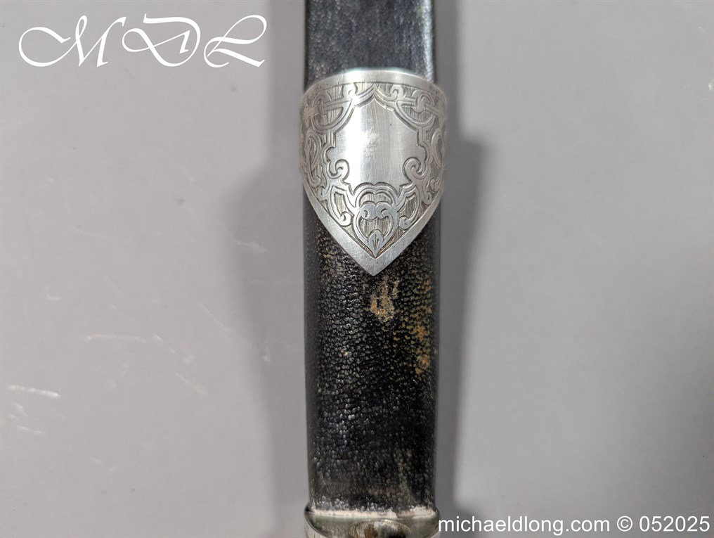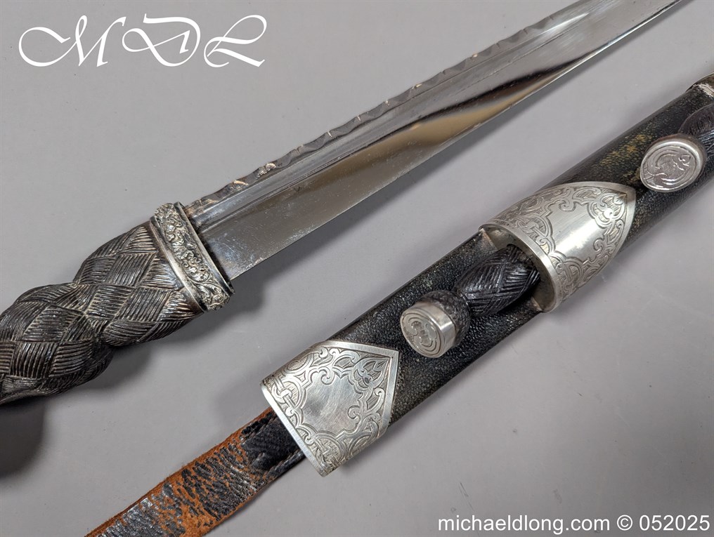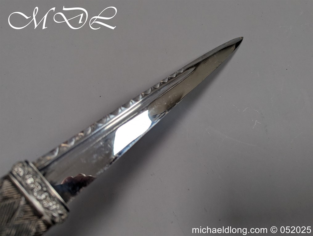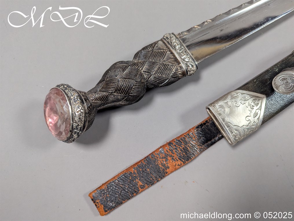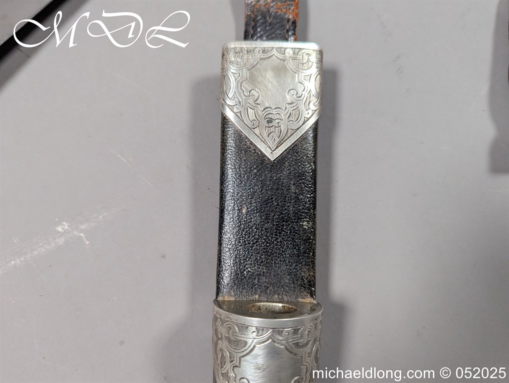 Scottish Victorian Dirk, carved hilt with floral decoration to the silver mounts. The 12 inch blade with top fuller and notched spine. The black leather scabbard with matching silver mounts and complete with knife and fork ensuite. Please note the mounts test as silver but not hallmarked overall length 17 inches
