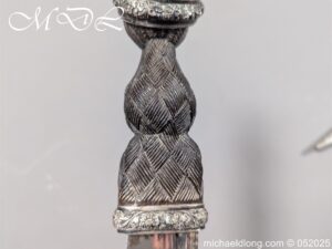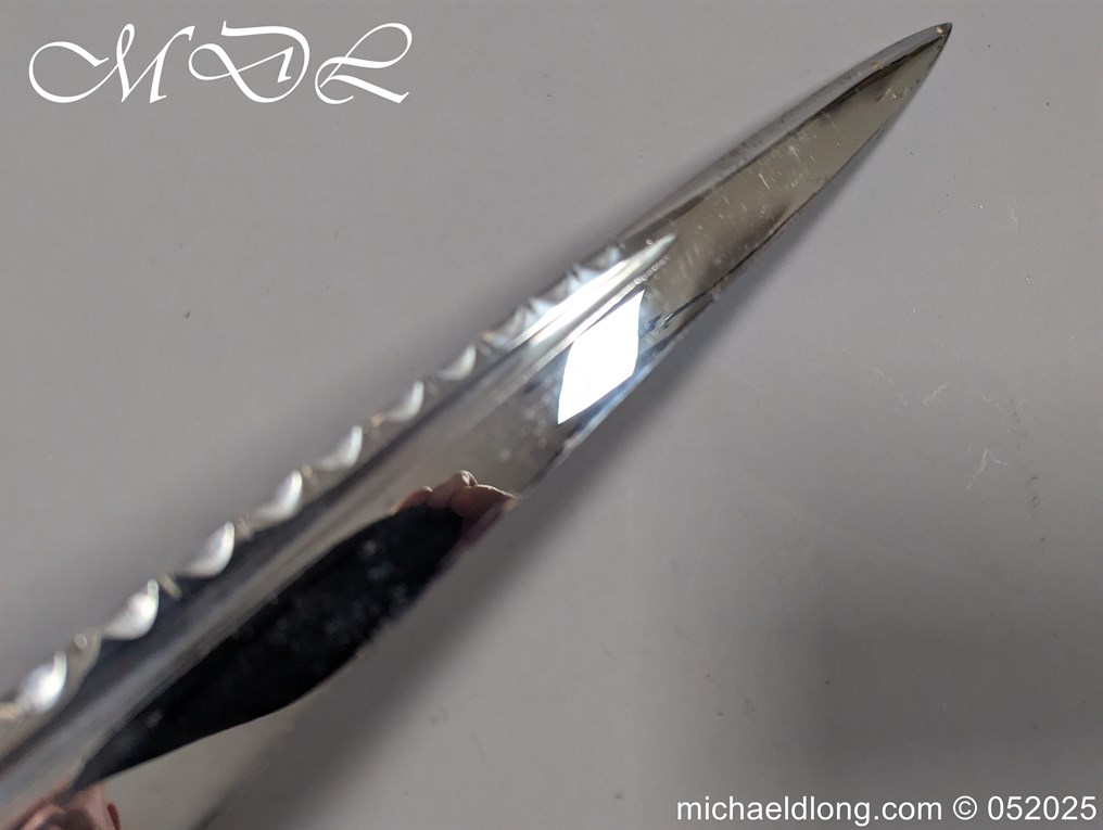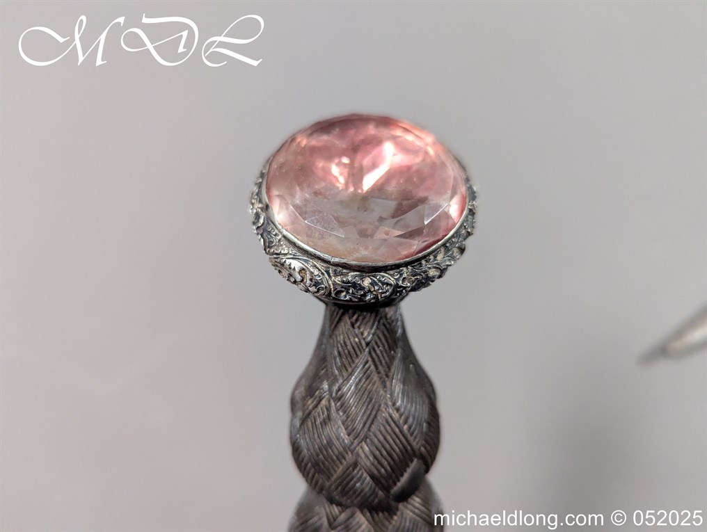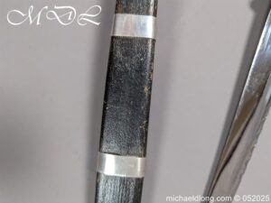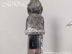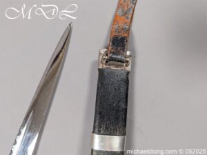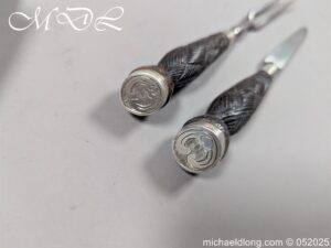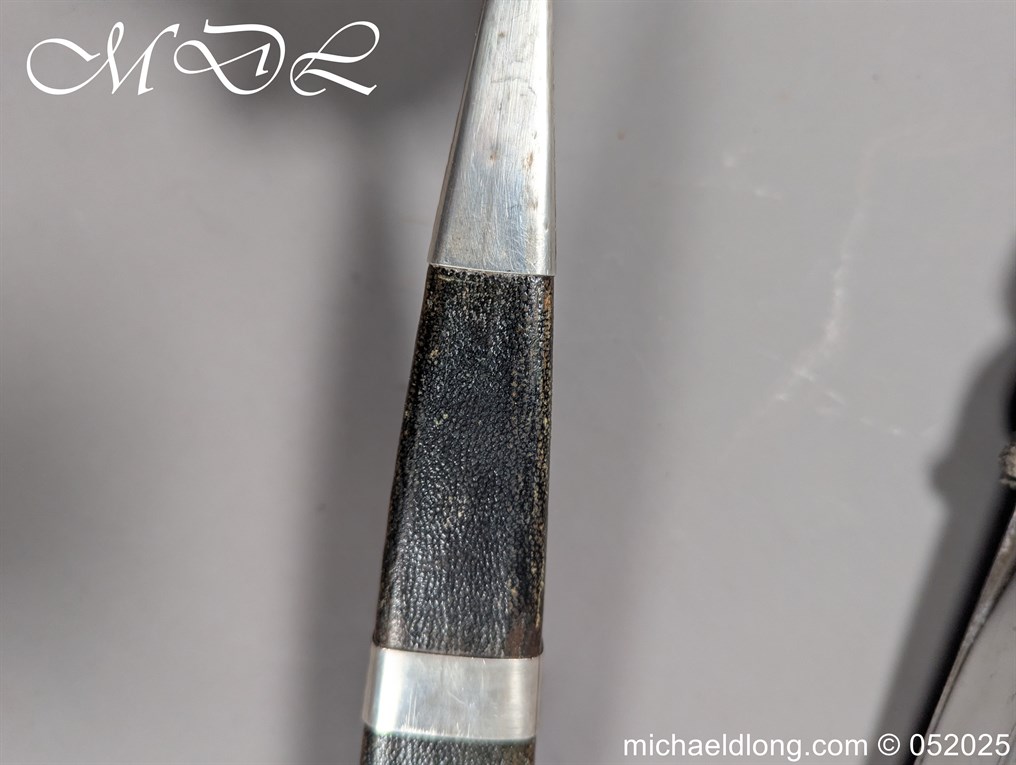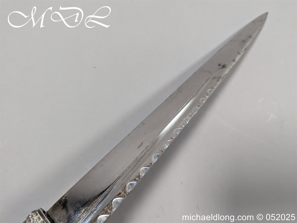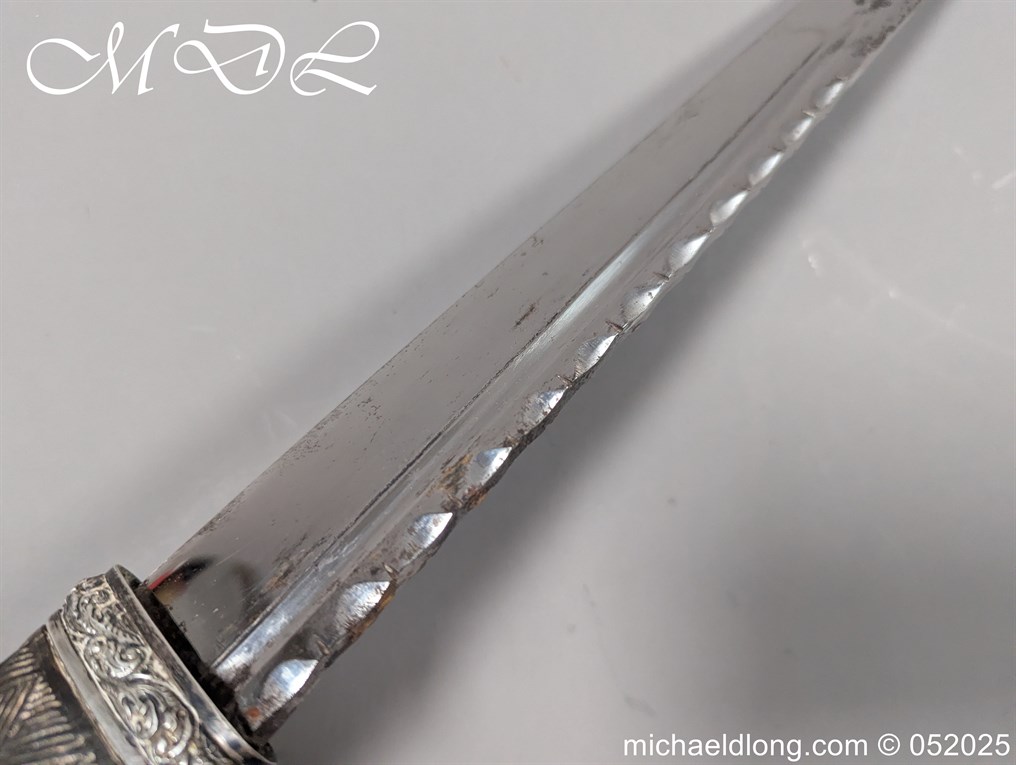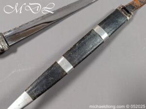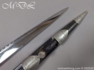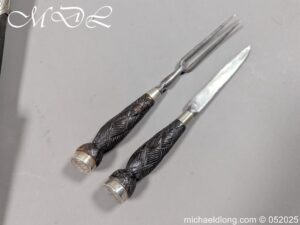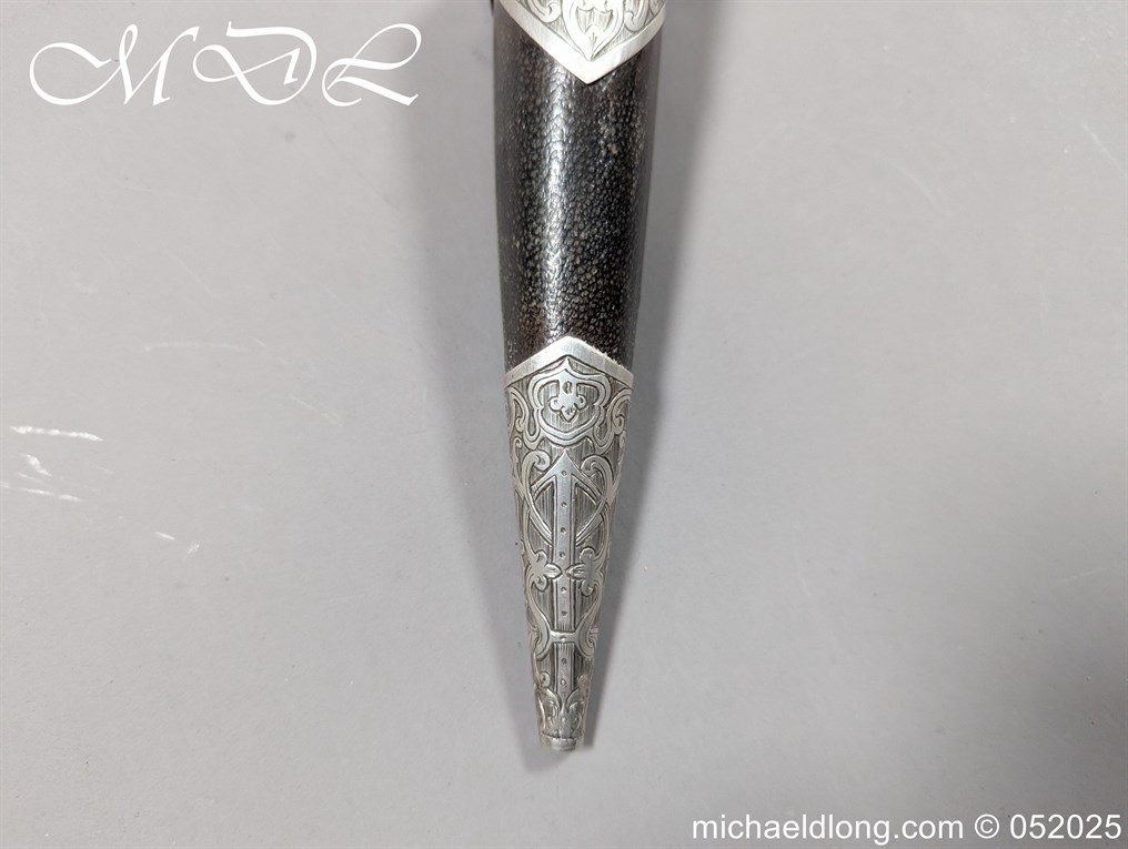 Scottish Victorian Dirk, carved hilt with floral decoration to the silver mounts. The 12 inch blade with top fuller and notched spine. The black leather scabbard with matching silver mounts and complete with knife and fork ensuite. Please note the mounts test as silver but not hallmarked overall length 17 inches