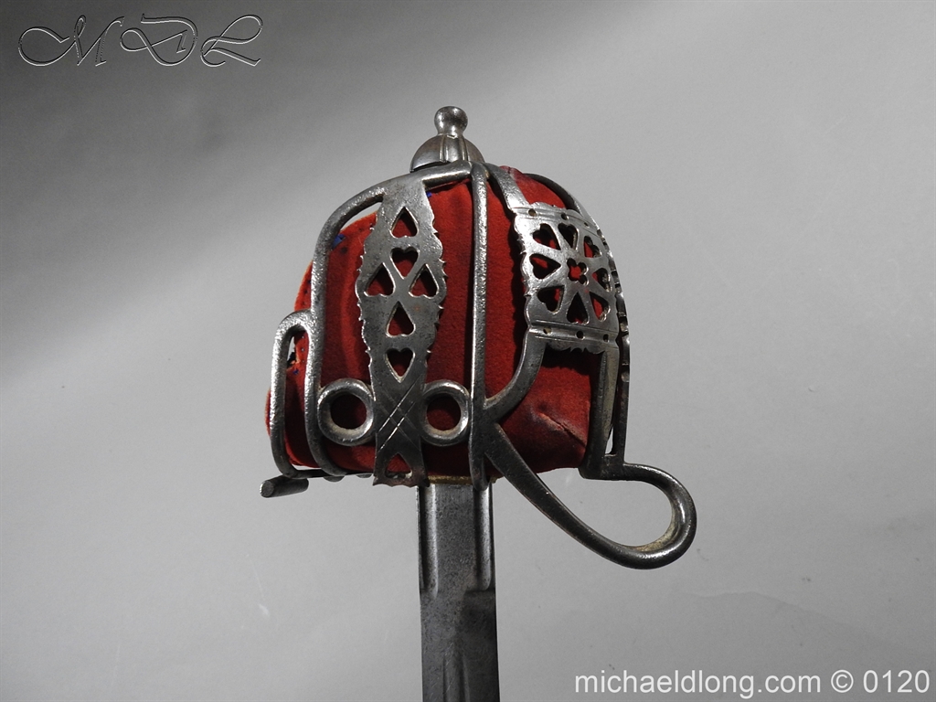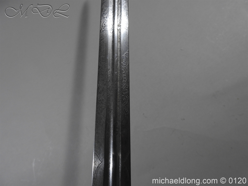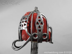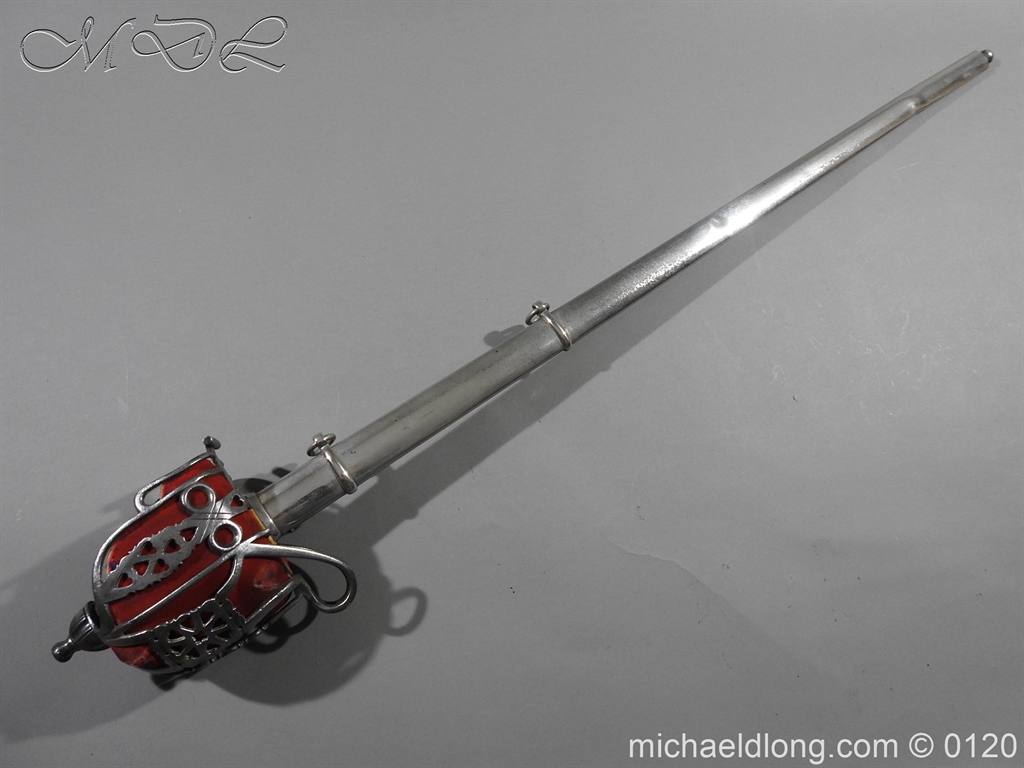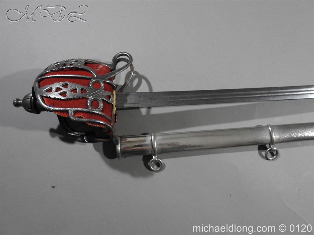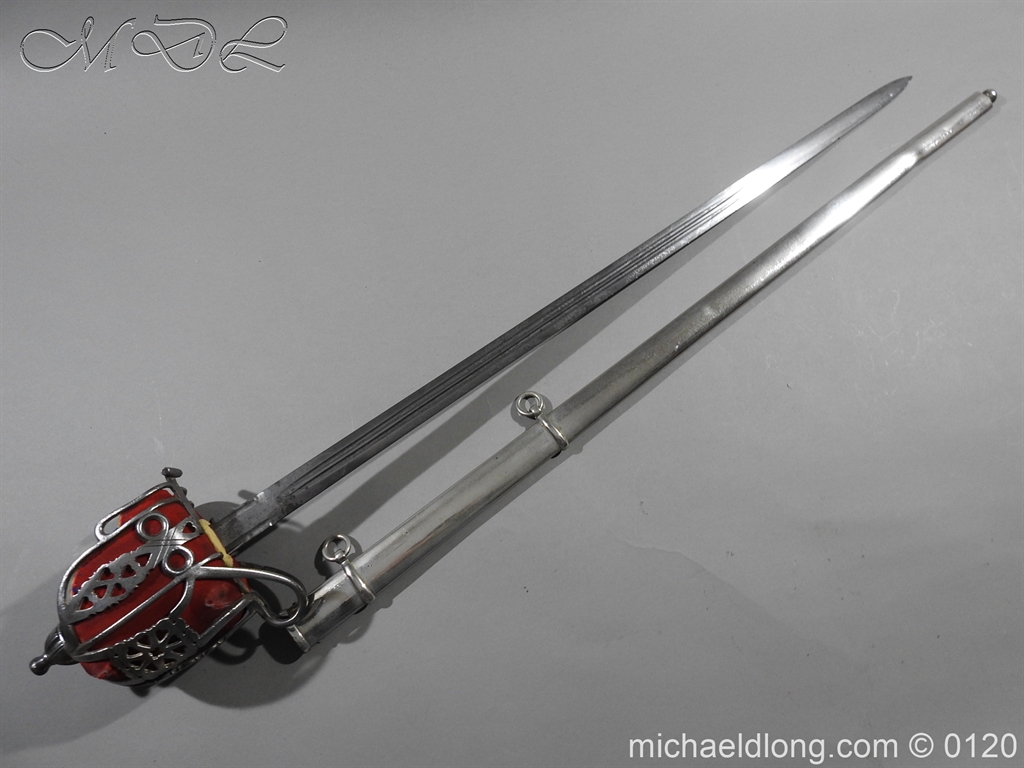 Victorian Scottish Basket Hilt Sword retailed by Fraser Inverness. Regulation steel basket hilt with liner, fish skin grip bound with silver wire and removable pommel to allow cross guard to be fitted. Broad sword blade engraved with VR crown and floral decoration plus two central fullers complete with steel scabbard with two loose rings overall length 99cm blade 82cm