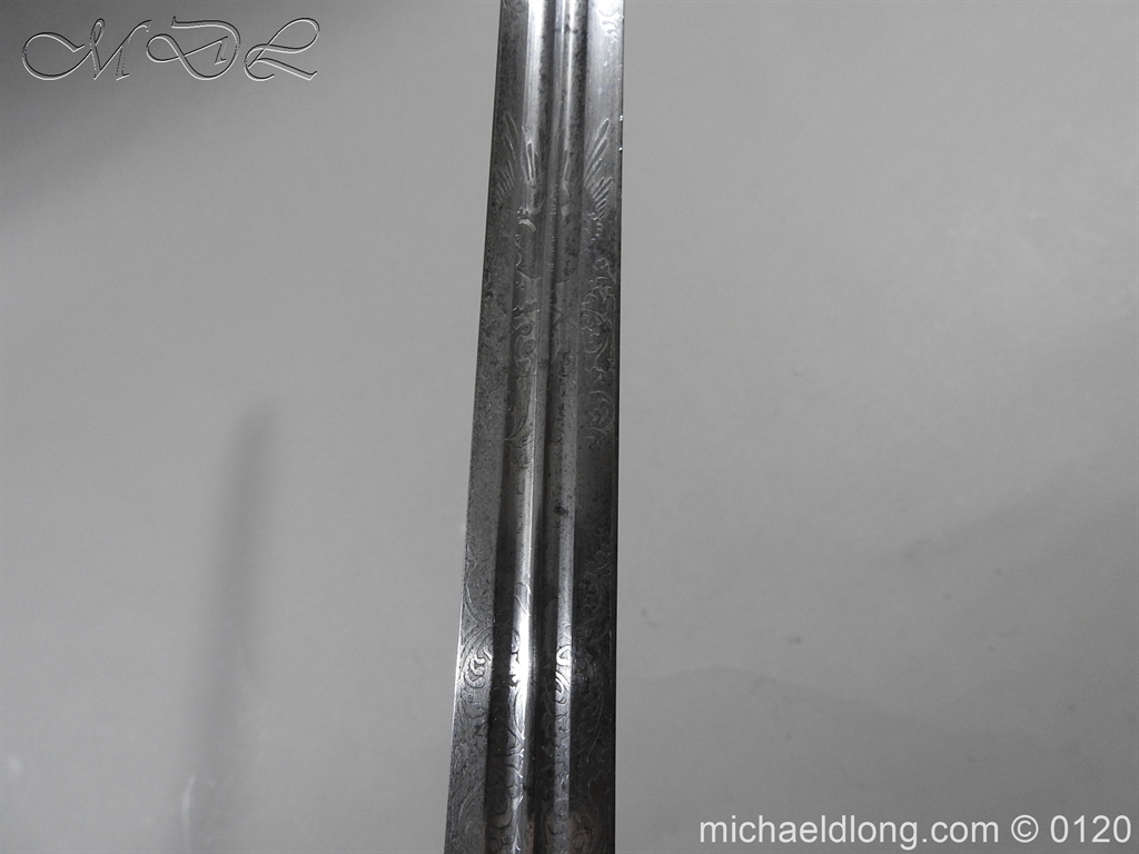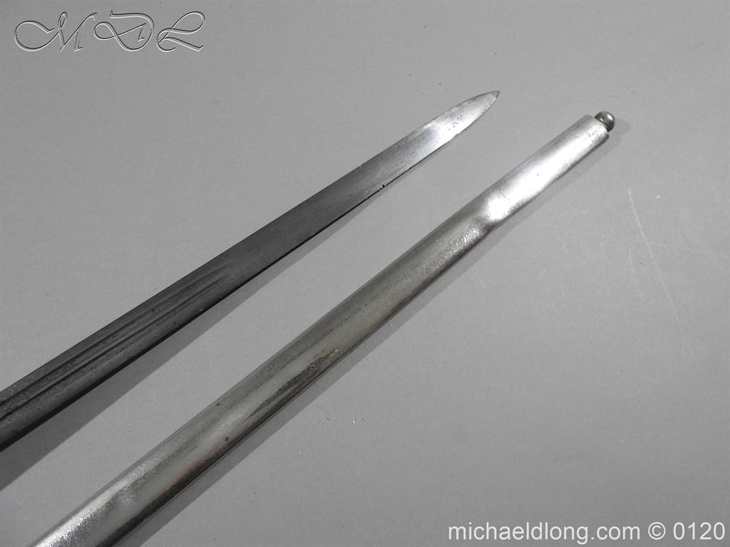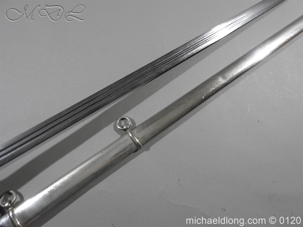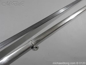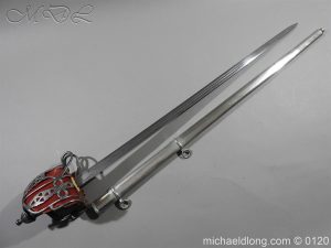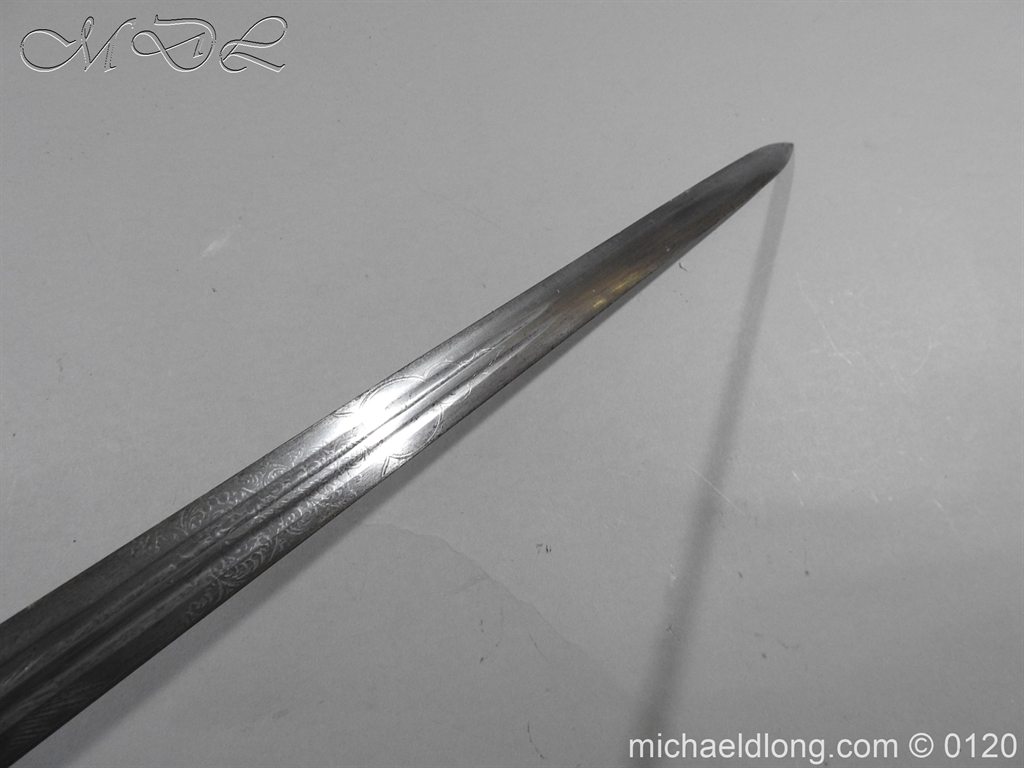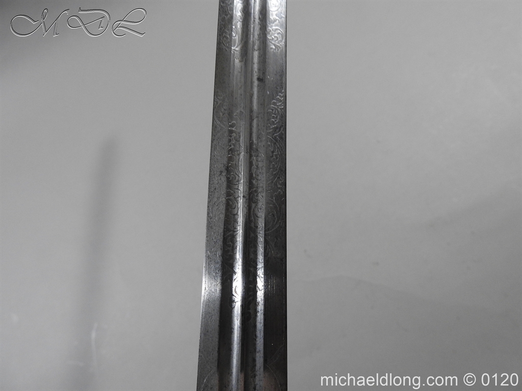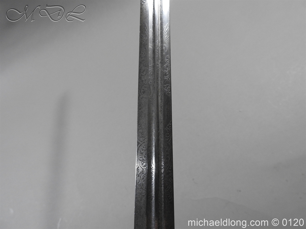 Victorian Scottish Basket Hilt Sword retailed by Fraser Inverness. Regulation steel basket hilt with liner, fish skin grip bound with silver wire and removable pommel to allow cross guard to be fitted. Broad sword blade engraved with VR crown and floral decoration plus two central fullers complete with steel scabbard with two loose rings overall length 99cm blade 82cm