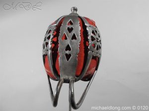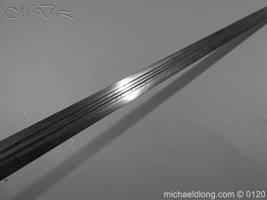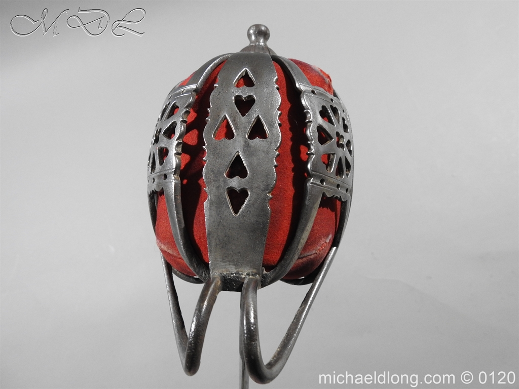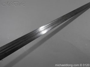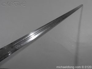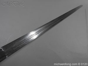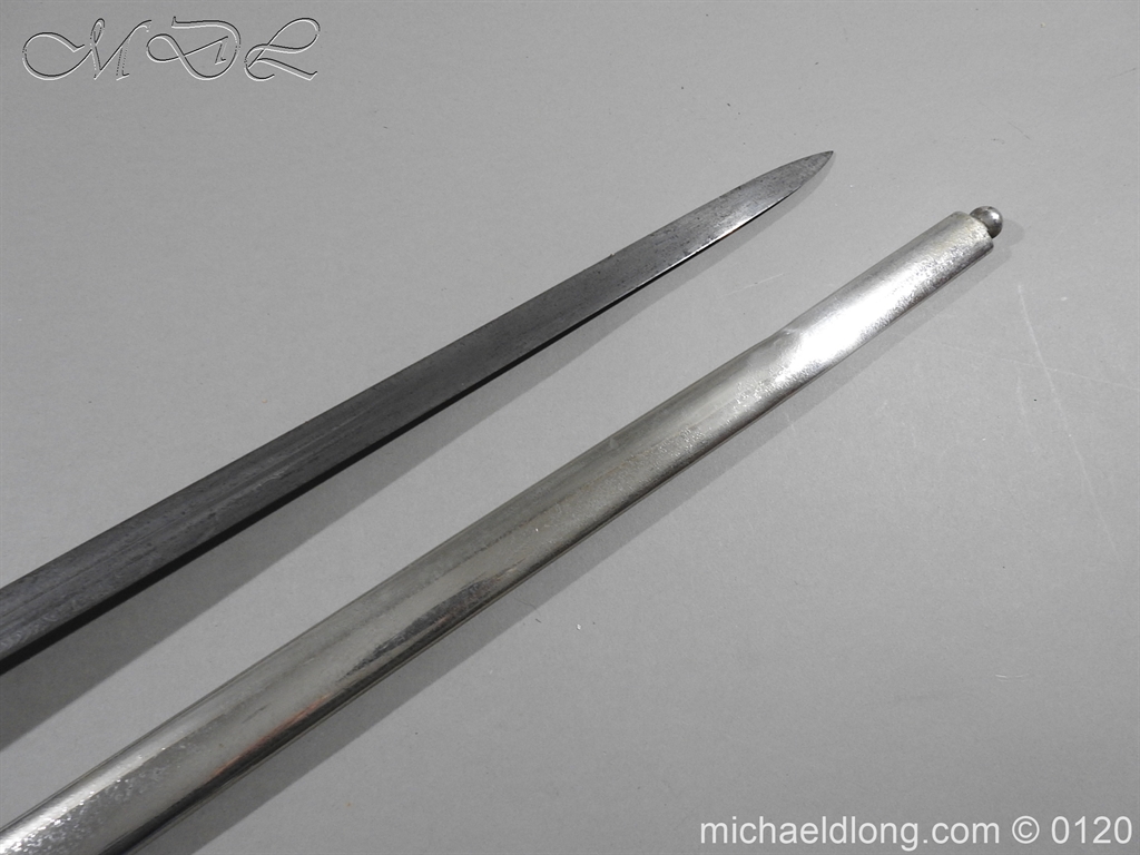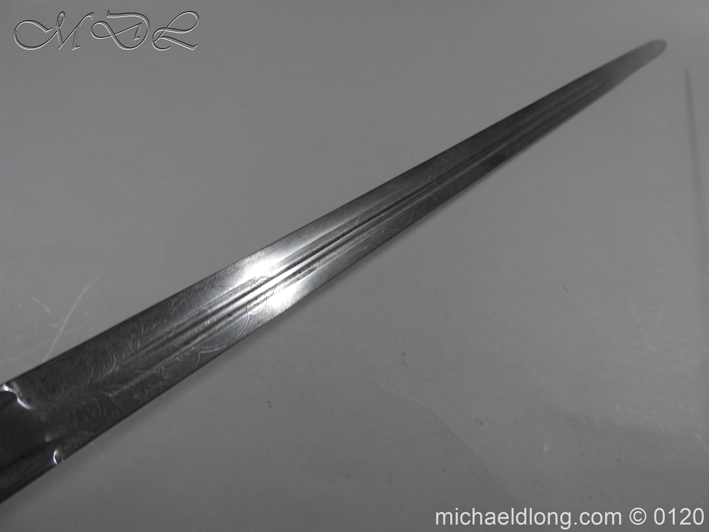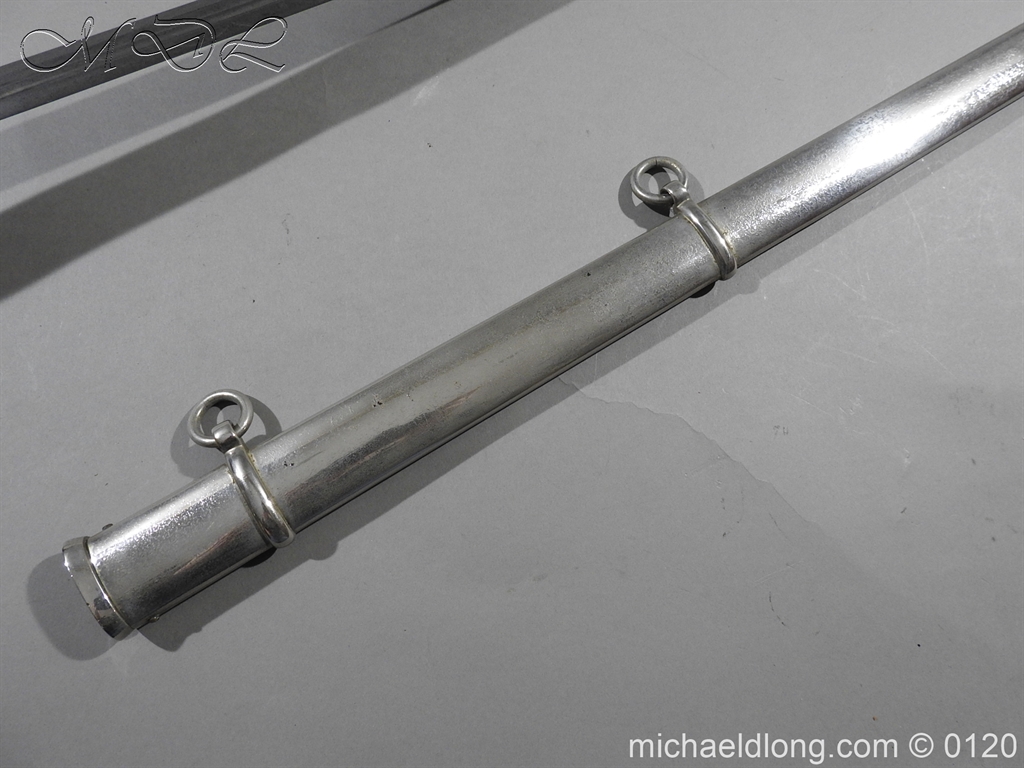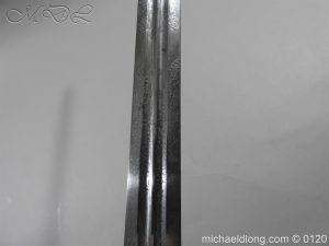 Victorian Scottish Basket Hilt Sword retailed by Fraser Inverness. Regulation steel basket hilt with liner, fish skin grip bound with silver wire and removable pommel to allow cross guard to be fitted. Broad sword blade engraved with VR crown and floral decoration plus two central fullers complete with steel scabbard with two loose rings overall length 99cm blade 82cm