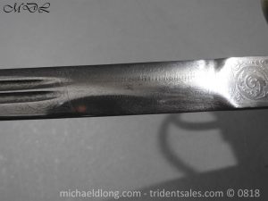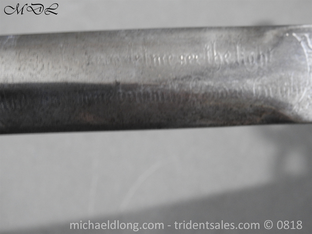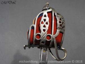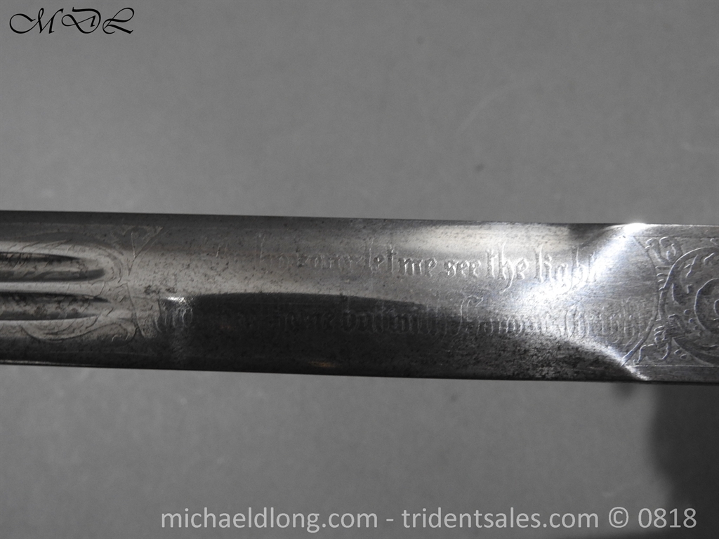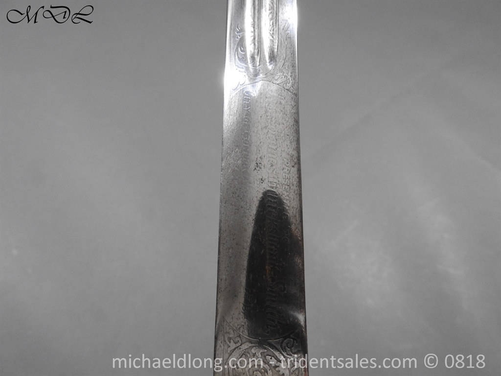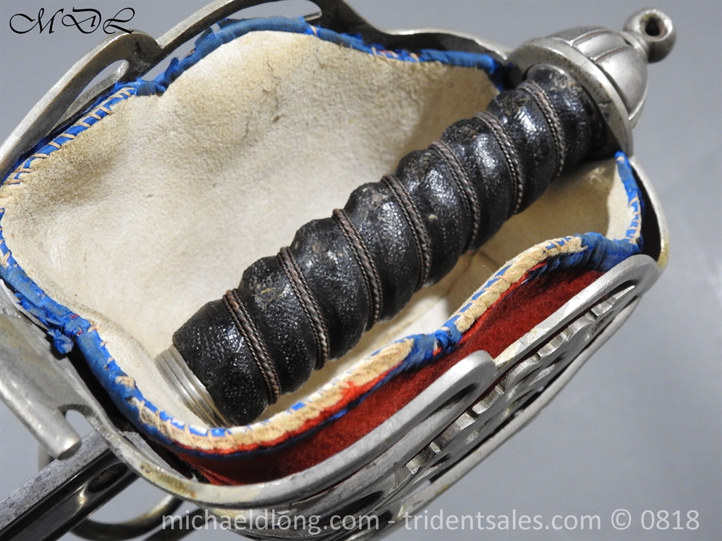 Regulation pattern broadsword steel basket with original liner, wire bound fish skin grip double edged blade in etched with crown GR V thistles and decoration plus proof mark. In addition presentation panal which states, Presented to Lieut James Cruickshank Smith City of London National Guard 1915 the reverse with a further inscription but to faint to read complete with parade scabbard Length 100cm blade length 81cm