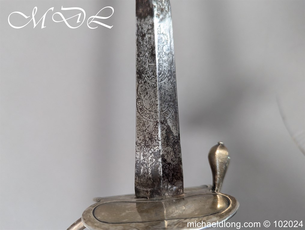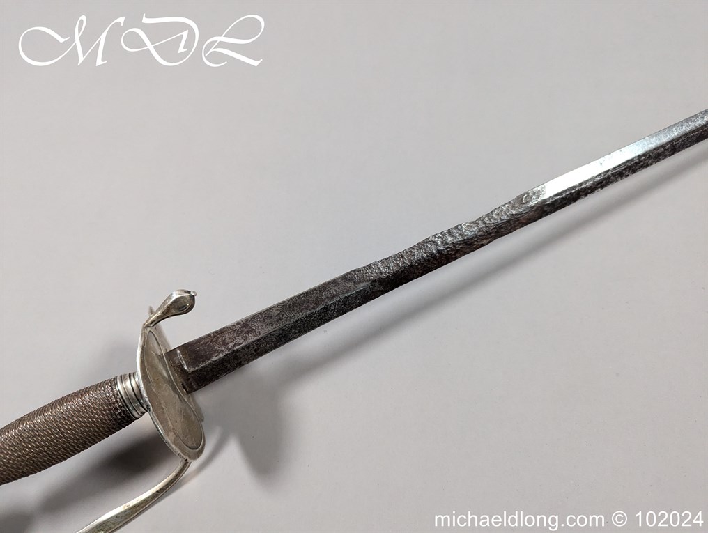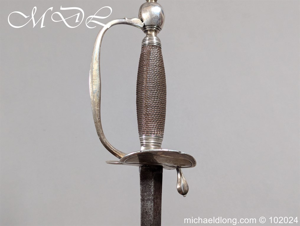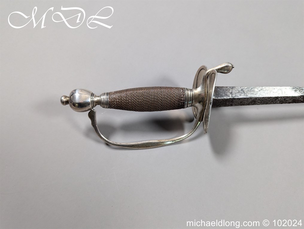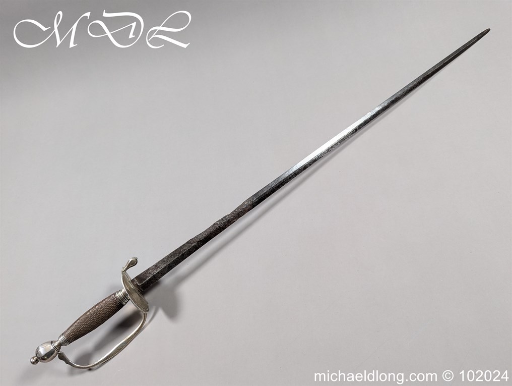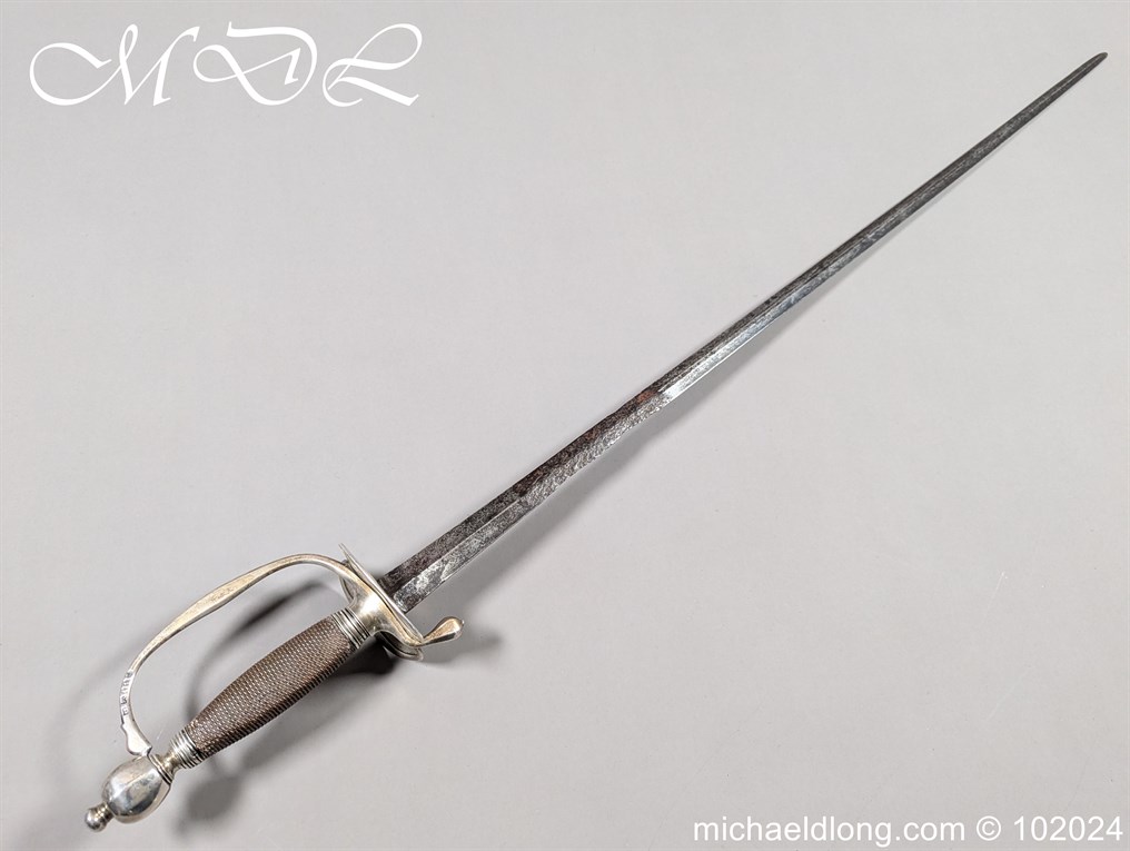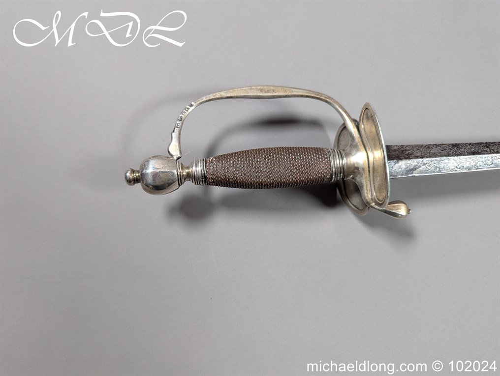 Silver Hilted Infantry Officers Sword Hallmarked London 1794 The hilt well hallmarked and in good condition with wire wrapped grip and maker marked FT. The straight blade double edged with visible engraving and solid but has a area of deep pitting for about 10cm overall length 98cm the blade 81cm
