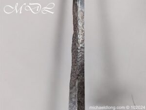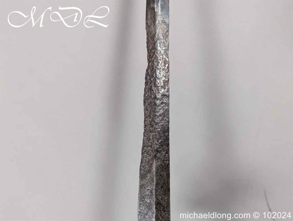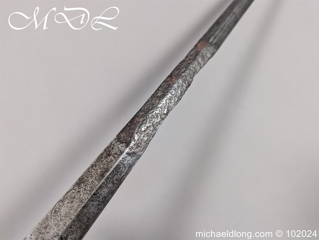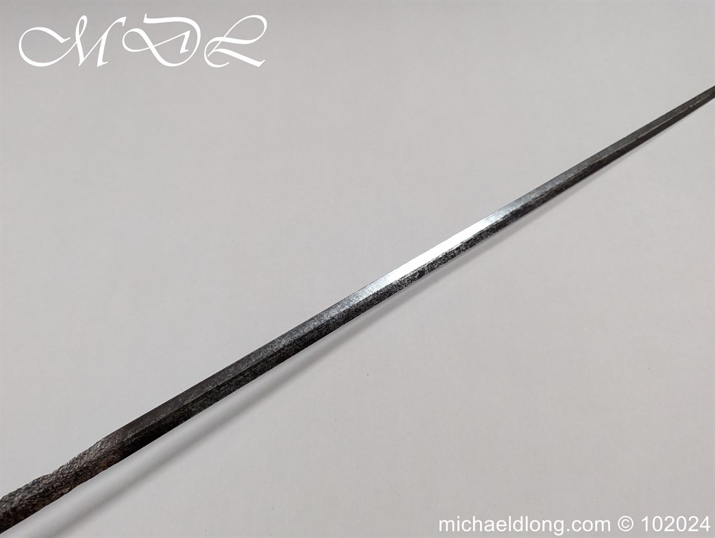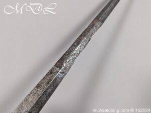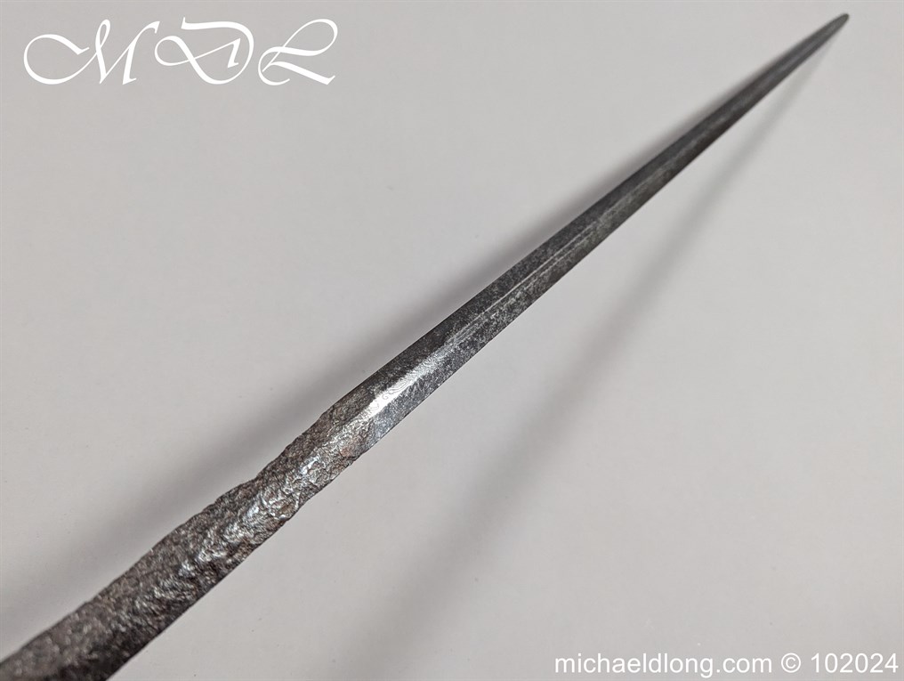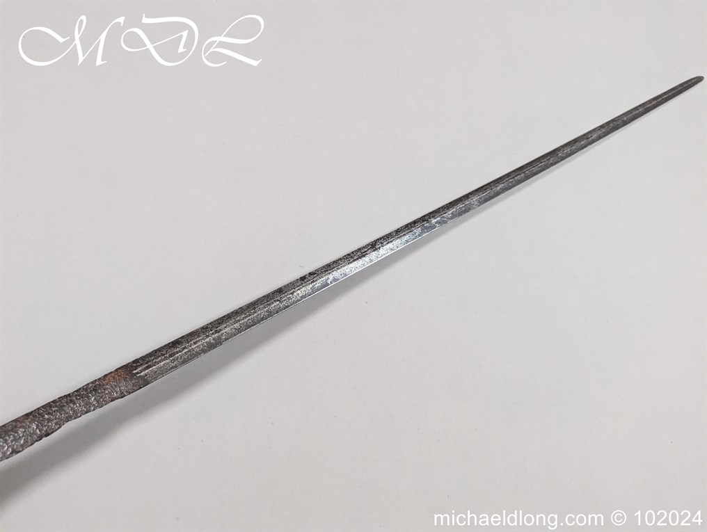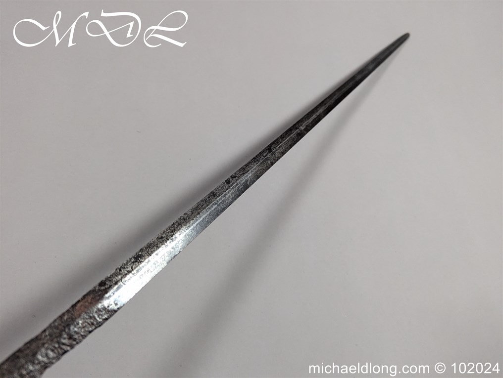 Silver Hilted Infantry Officers Sword Hallmarked London 1794 The hilt well hallmarked and in good condition with wire wrapped grip and maker marked FT. The straight blade double edged with visible engraving and solid but has a area of deep pitting for about 10cm overall length 98cm the blade 81cm