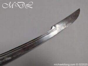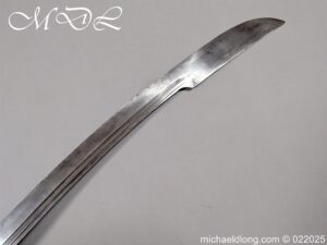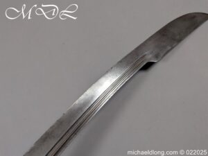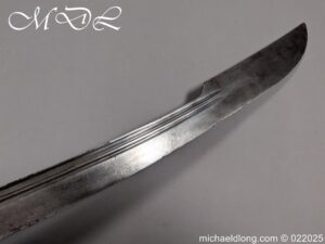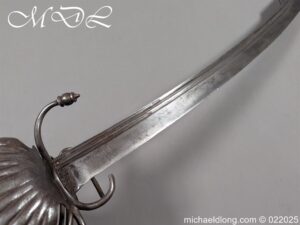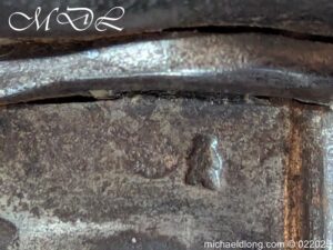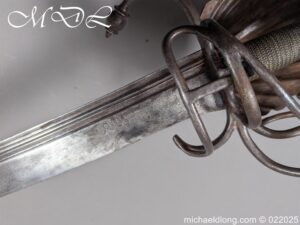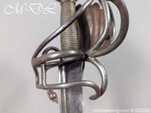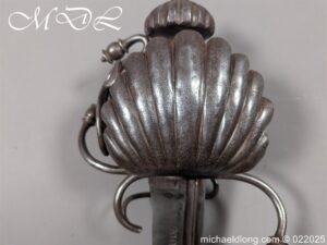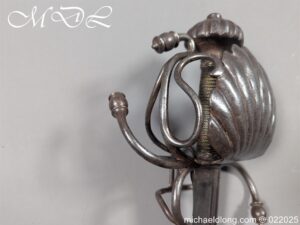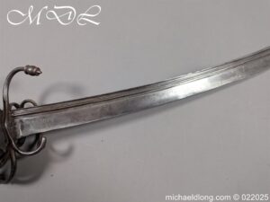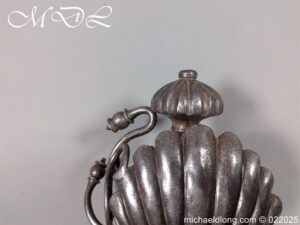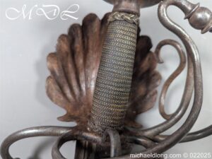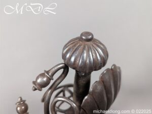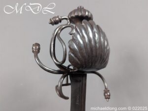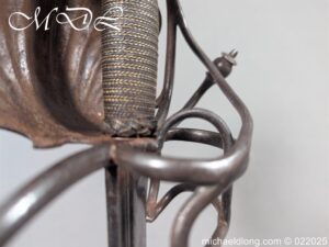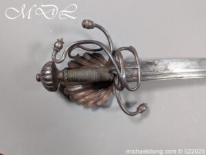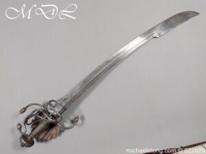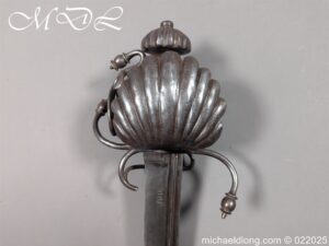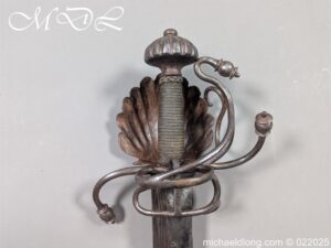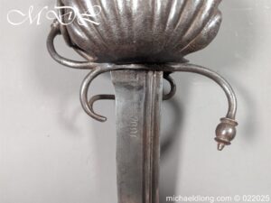 Sinclair 16th Century Saber other names include Dussagge or Sinclairsabel,the hilt made up of intertwining bars forming the guard and thumb ring. The shell guard supported by an S bar with the hilt terminating with a chiselled large dome pommel. The grip wire has been replaced at some point however nicely done and finished with Turks heads. The flat sided wide blade with two top fullers leading to the enlarged double-edged point, struck with maker marked Anton Scheuch of Dresden with a serpent bladesmith’s markfrom the Dresden Rustkammer, Germany please see image, overall length 96cm the blade 79cm please note very slight movement between hilt and blade.