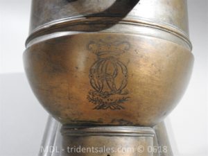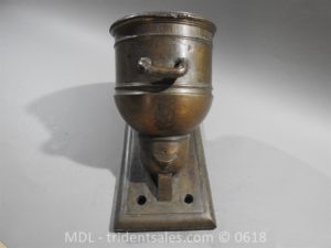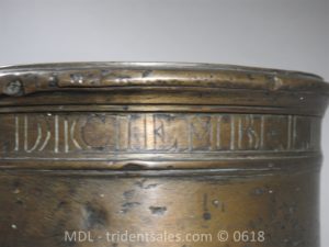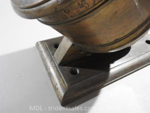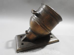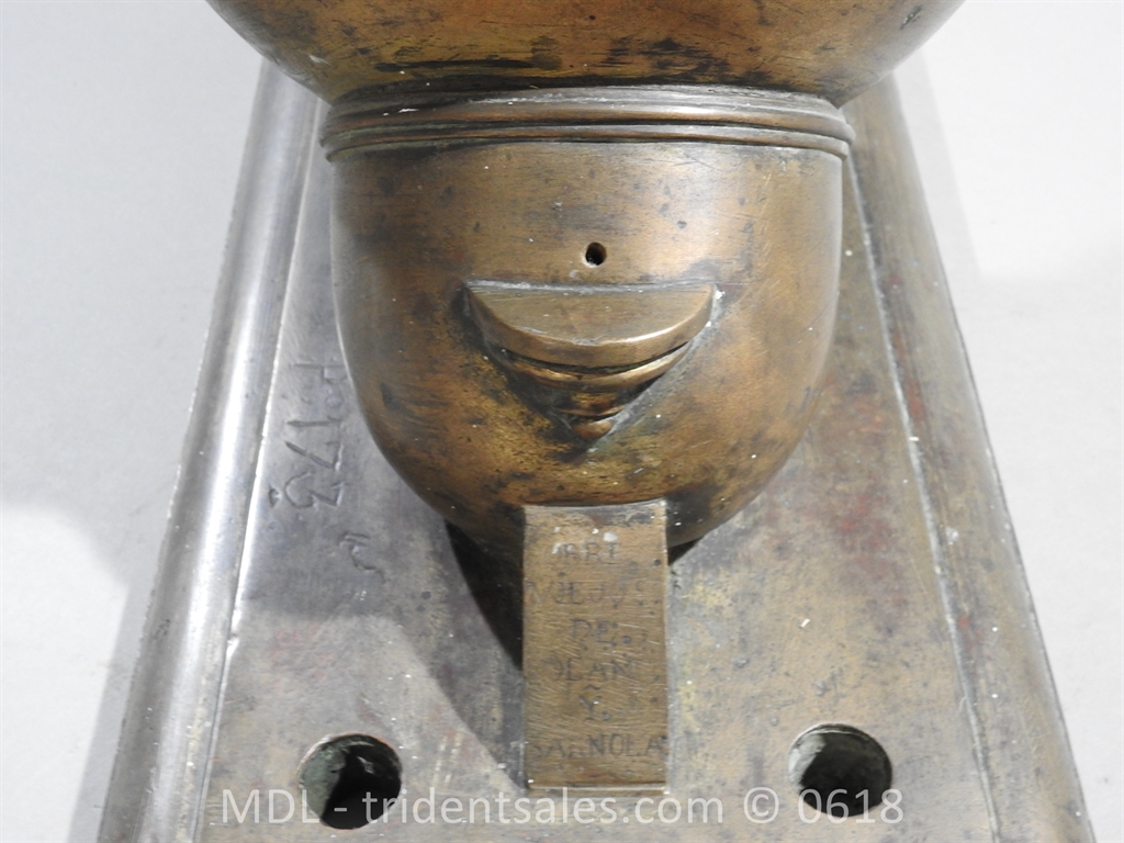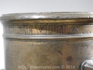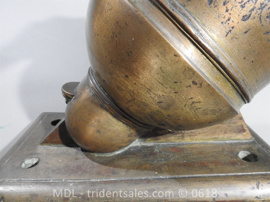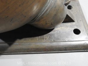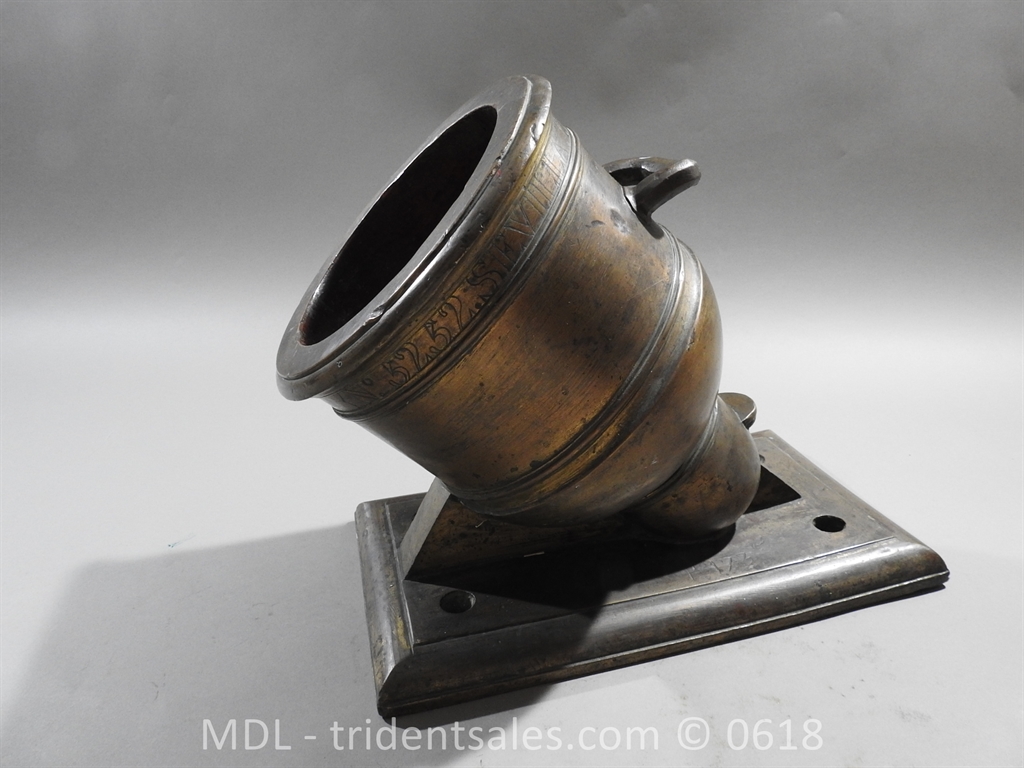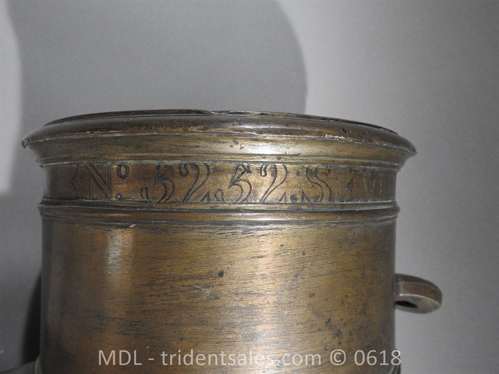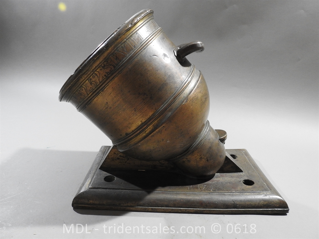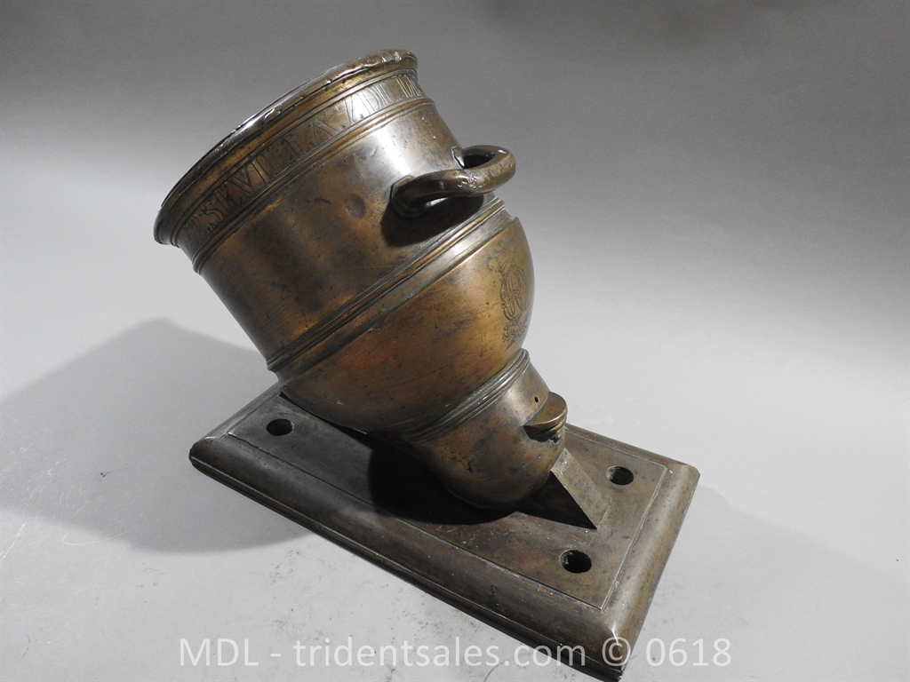 SN 3232. This beautiful bronze mortar has age patina and fine markings as can be seen in photos. Monogram of King Ferdinand VII is engraved over vent and cannon’s name in a banner of unknown translation. Baseplate is engraved around border “No. 3232”, “SEVILLA IDE DICIEMBRE DE 1799” manufactured at Seville, December 1, 1799 . Base is Numbers 173. Eprouvettes historically were used to measure quality of gun powder by shooting a projectile and measuring the distance fired as the Eprouvette has a fixed angle and the projectile is of an exact weight.