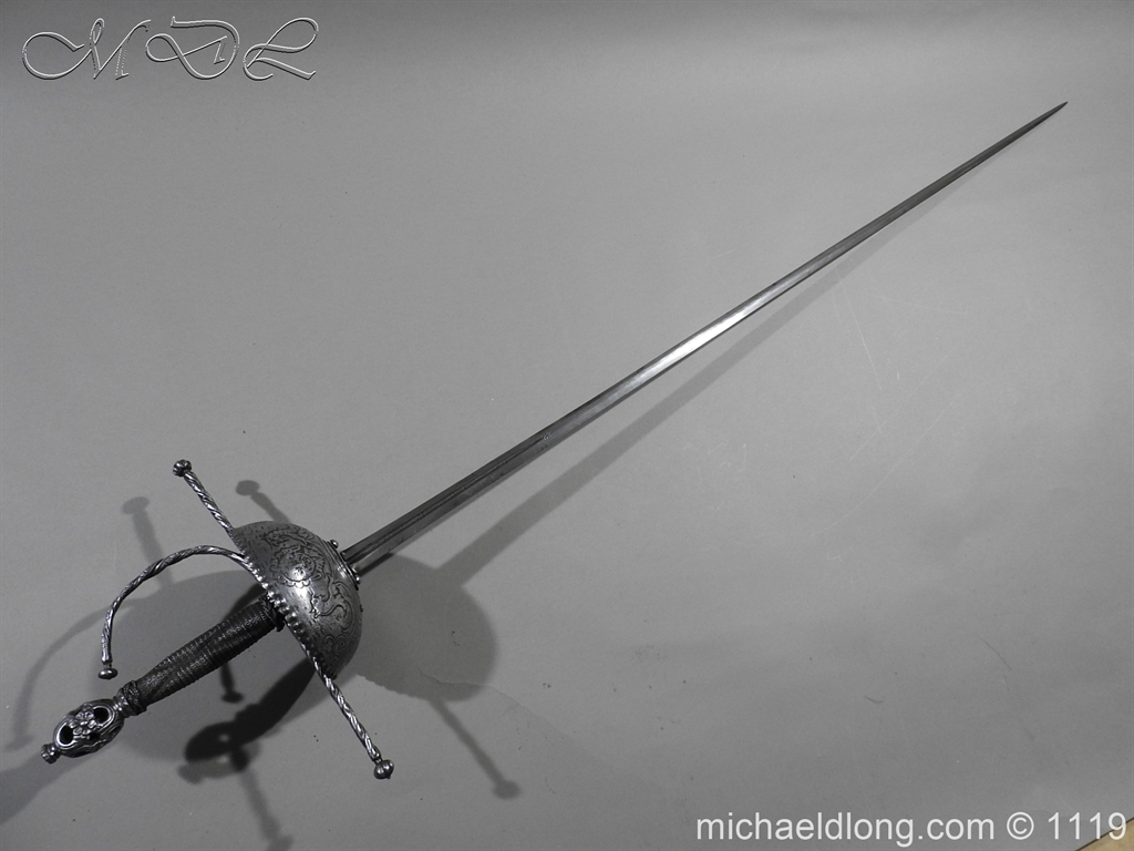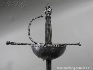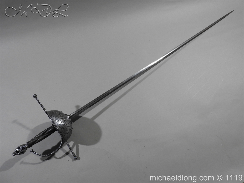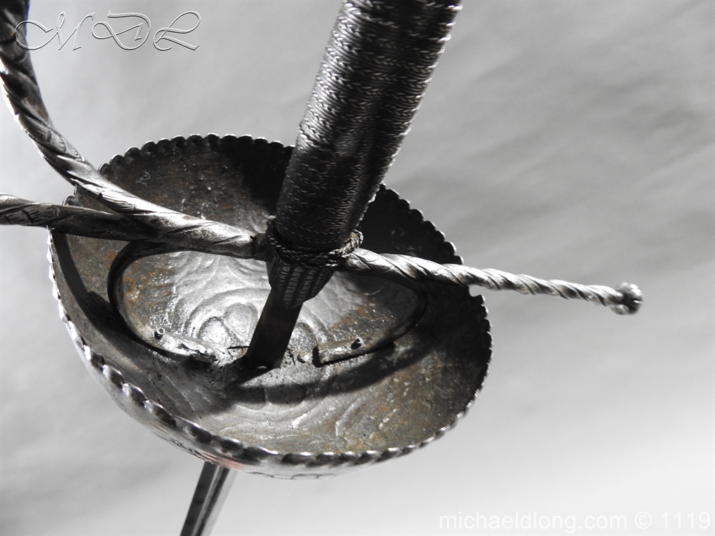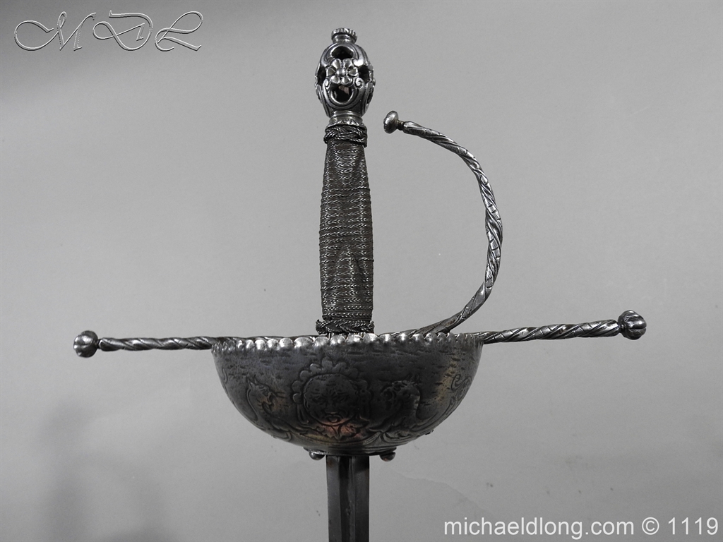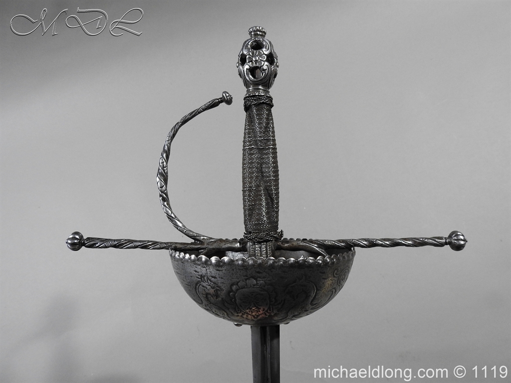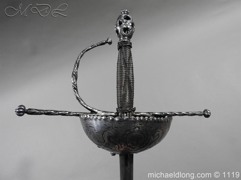 Spanish Cup Hilt Rapier second half of the 17th century embossed with Griffins, masks and floral decoration. Long straight quillons being twisted and engraved with matching rear curved guard. Excellent pierced tang with matching engraving, featured wire bound grip with turks heads to top and bottom. The blade double edged with small central fuller engraved with Toledo and markings to one side the reverse maker marked Ivan Martin and again various other marks.Well balanced in the hand overall length 121cm blade 100cm