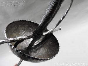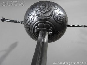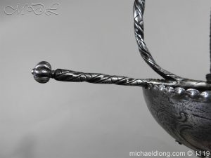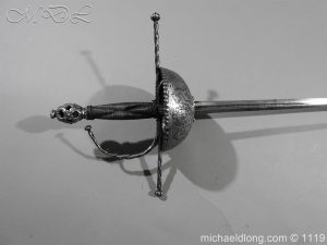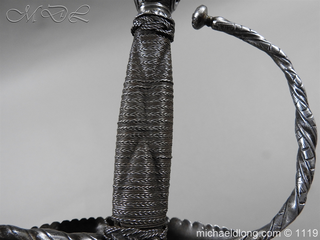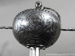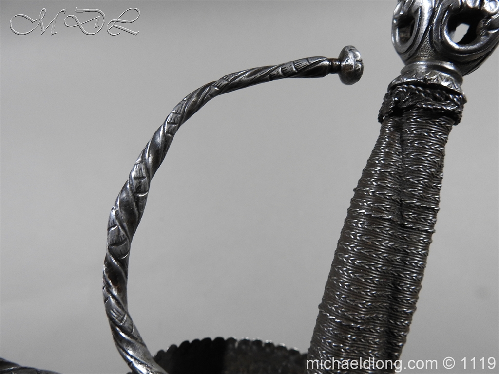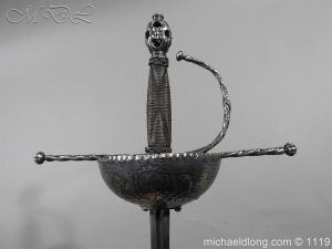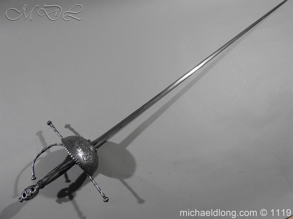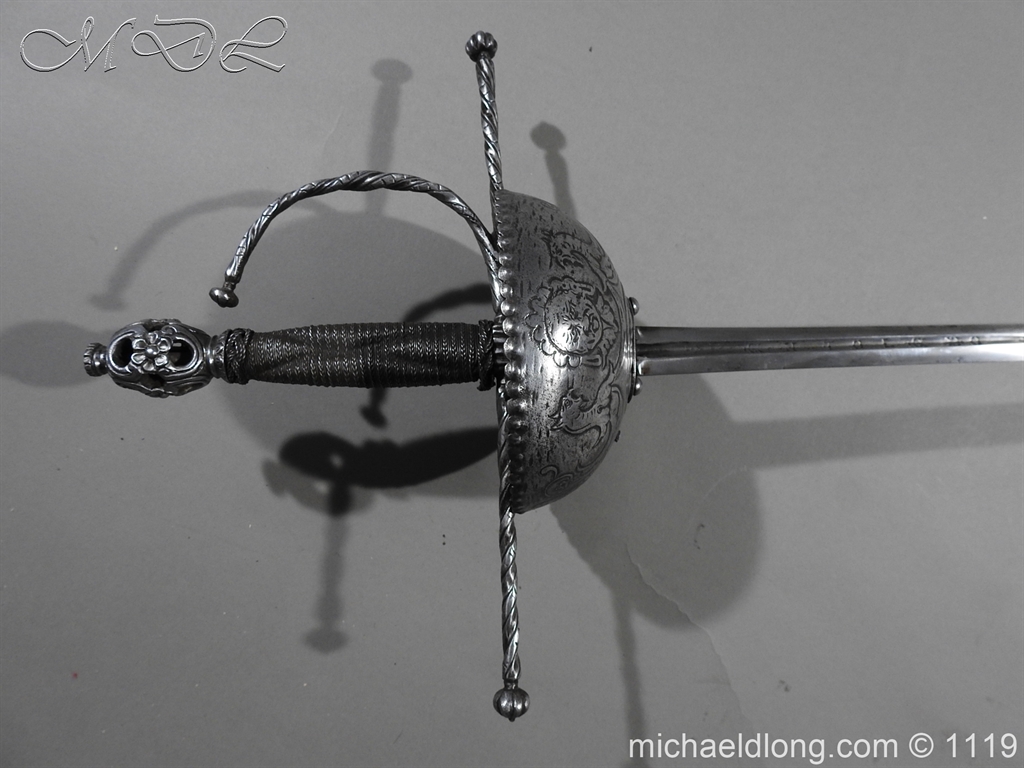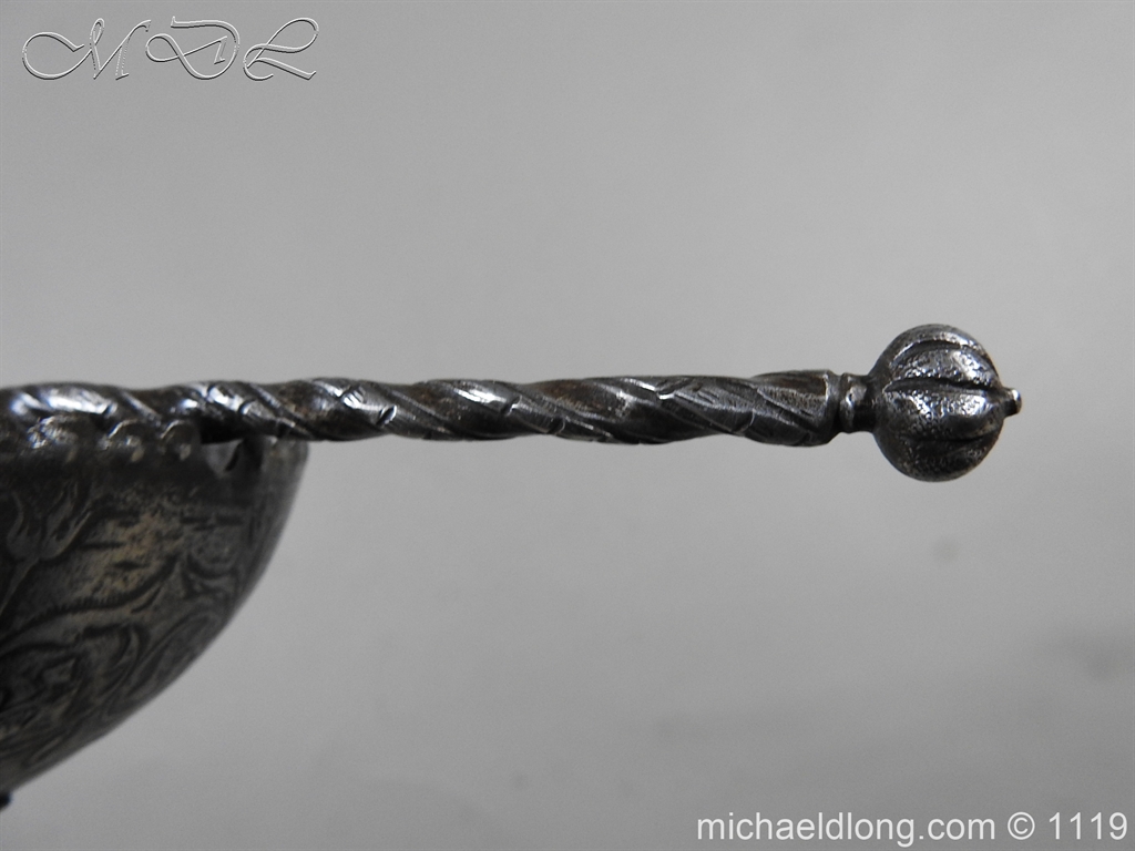 Spanish Cup Hilt Rapier second half of the 17th century embossed with Griffins, masks and floral decoration. Long straight quillons being twisted and engraved with matching rear curved guard. Excellent pierced tang with matching engraving, featured wire bound grip with turks heads to top and bottom. The blade double edged with small central fuller engraved with Toledo and markings to one side the reverse maker marked Ivan Martin and again various other marks.Well balanced in the hand overall length 121cm blade 100cm