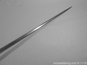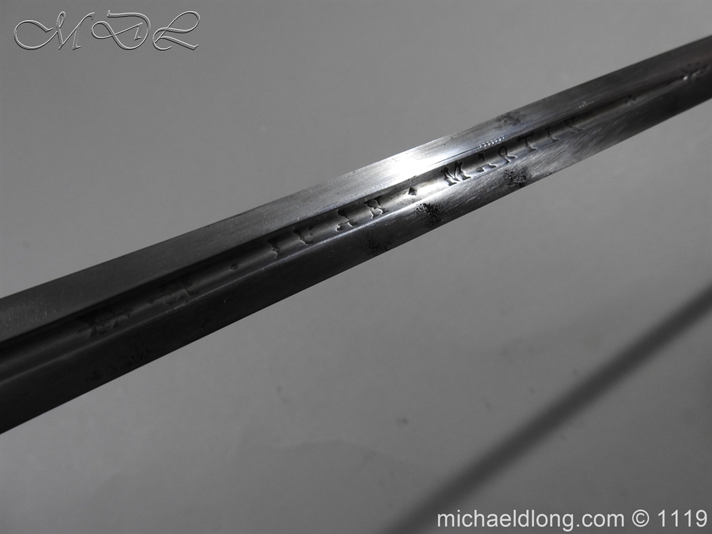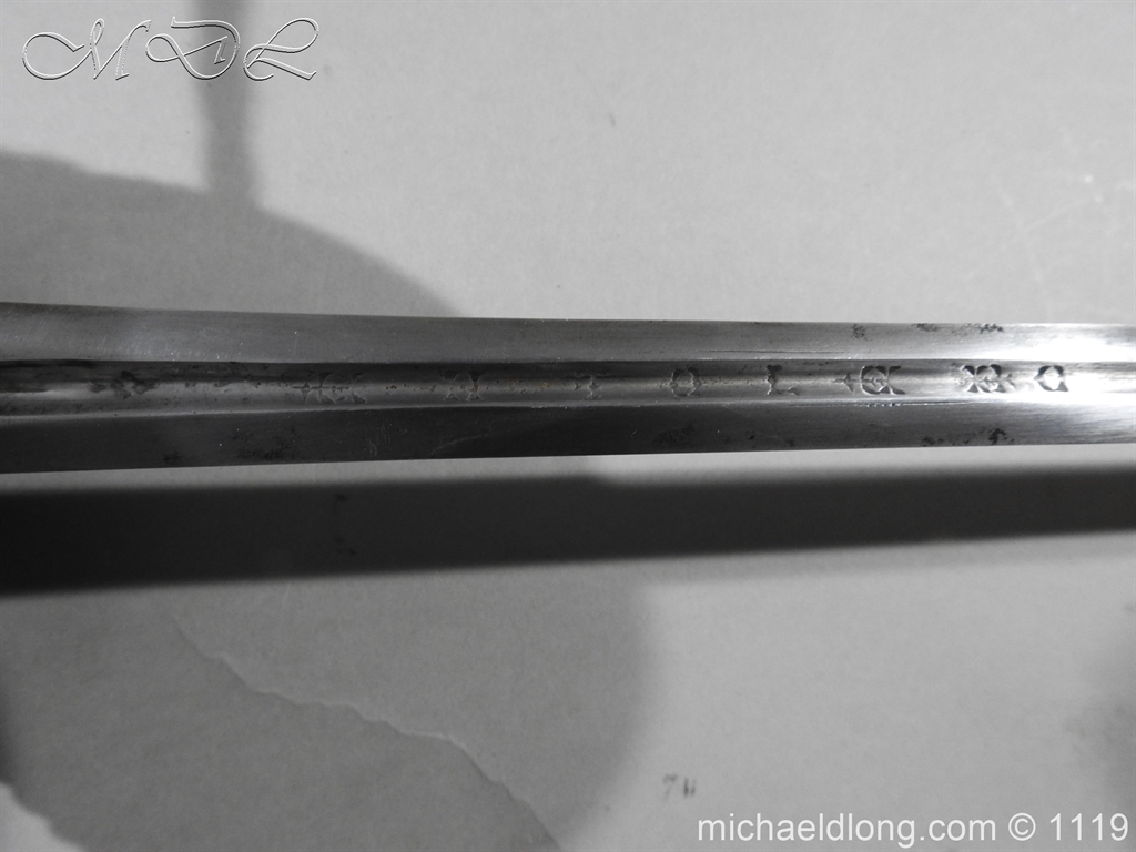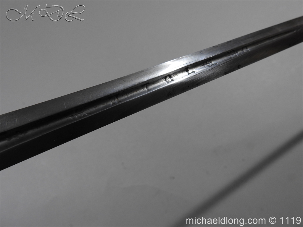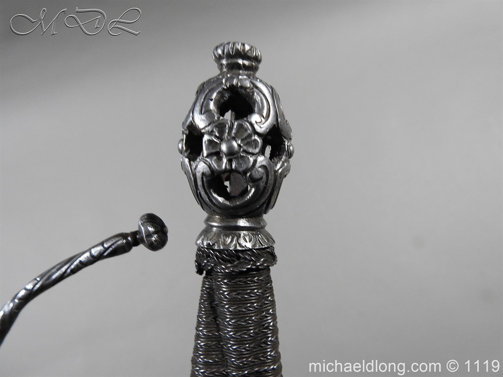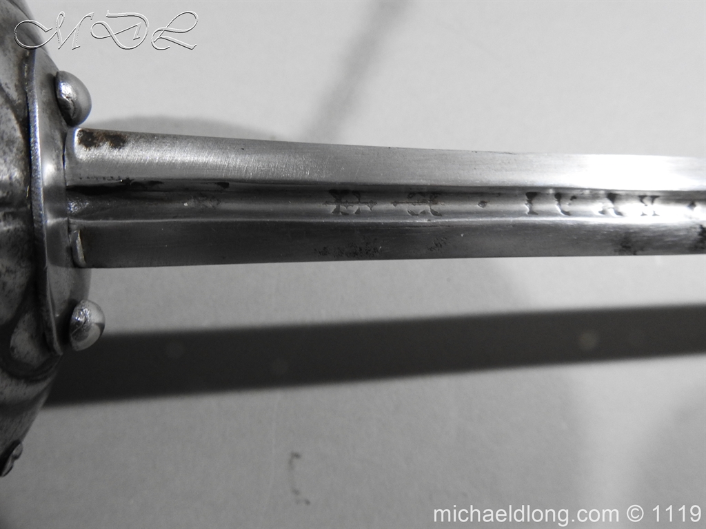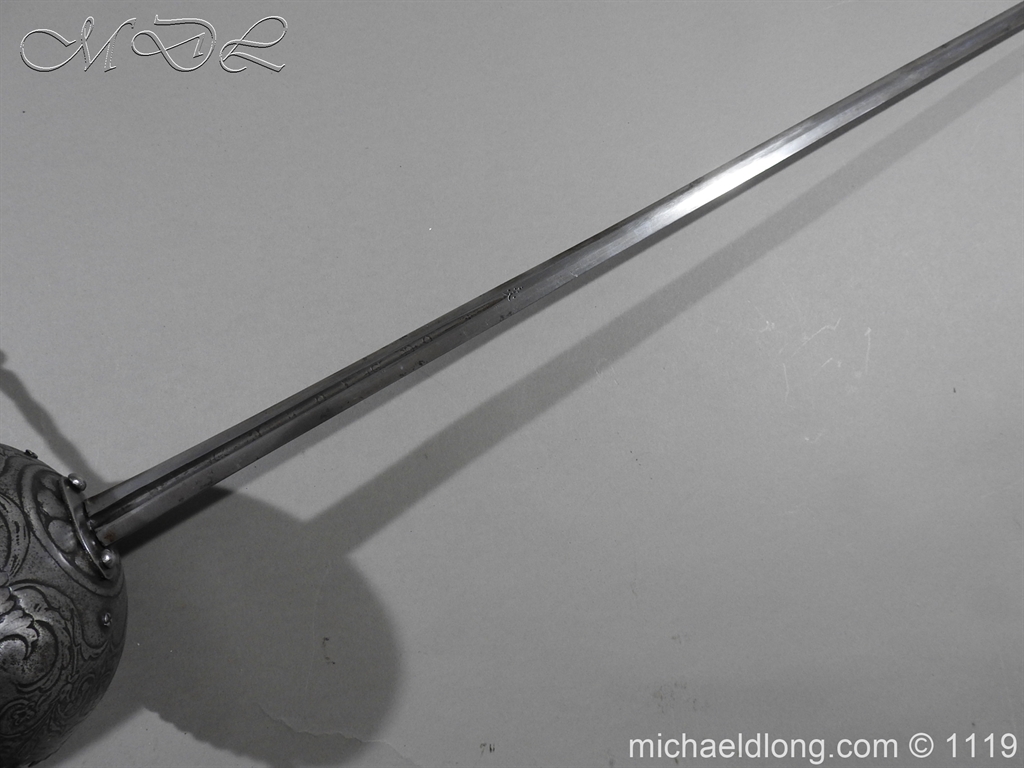 Spanish Cup Hilt Rapier second half of the 17th century embossed with Griffins, masks and floral decoration. Long straight quillons being twisted and engraved with matching rear curved guard. Excellent pierced tang with matching engraving, featured wire bound grip with turks heads to top and bottom. The blade double edged with small central fuller engraved with Toledo and markings to one side the reverse maker marked Ivan Martin and again various other marks.Well balanced in the hand overall length 121cm blade 100cm