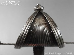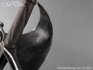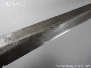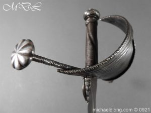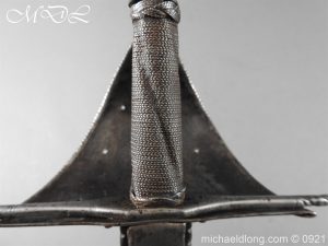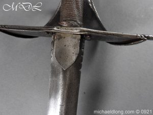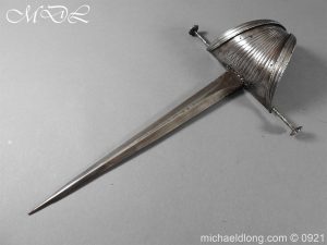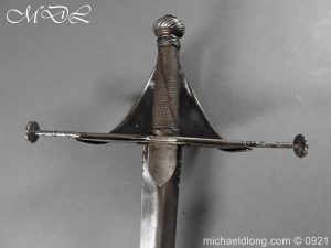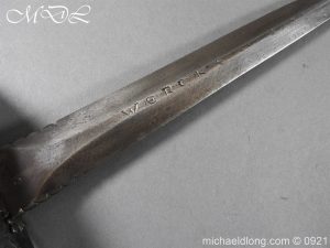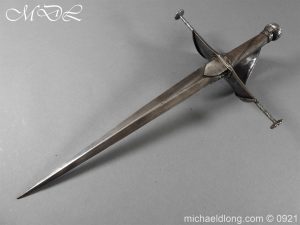 Spanish Left-Hand Dagger or Main Gauche in the transitional form but with heavy armour piecing blade. The steel hilt curved with line engraving and curved over on the edges to increase the strength and small holes which I assume where for securing leather liner. The pommel highly decorative again with line decoration and raised button tang. Straight quillons with flat floral ends match the top of the tang complete with wire bound grip and thumb rest to rear. The blade with raised central fuller to form diamond section is engraved with WERCKE and what looks to be a date but worn the reverse with IACMHV again worn overall length 18.5 inches the blade 13.5 inches and 1.25 inches in width at the widest point