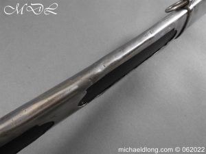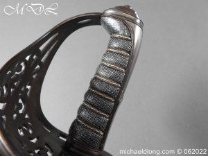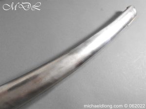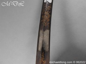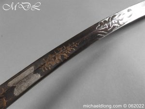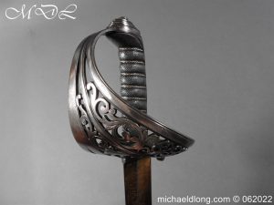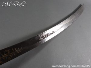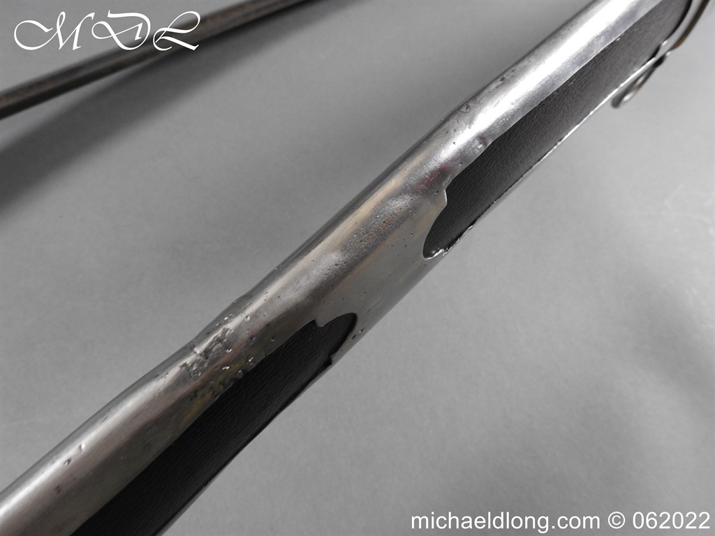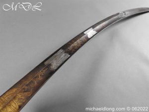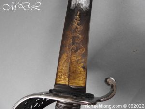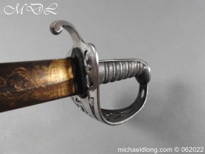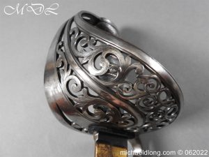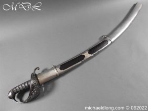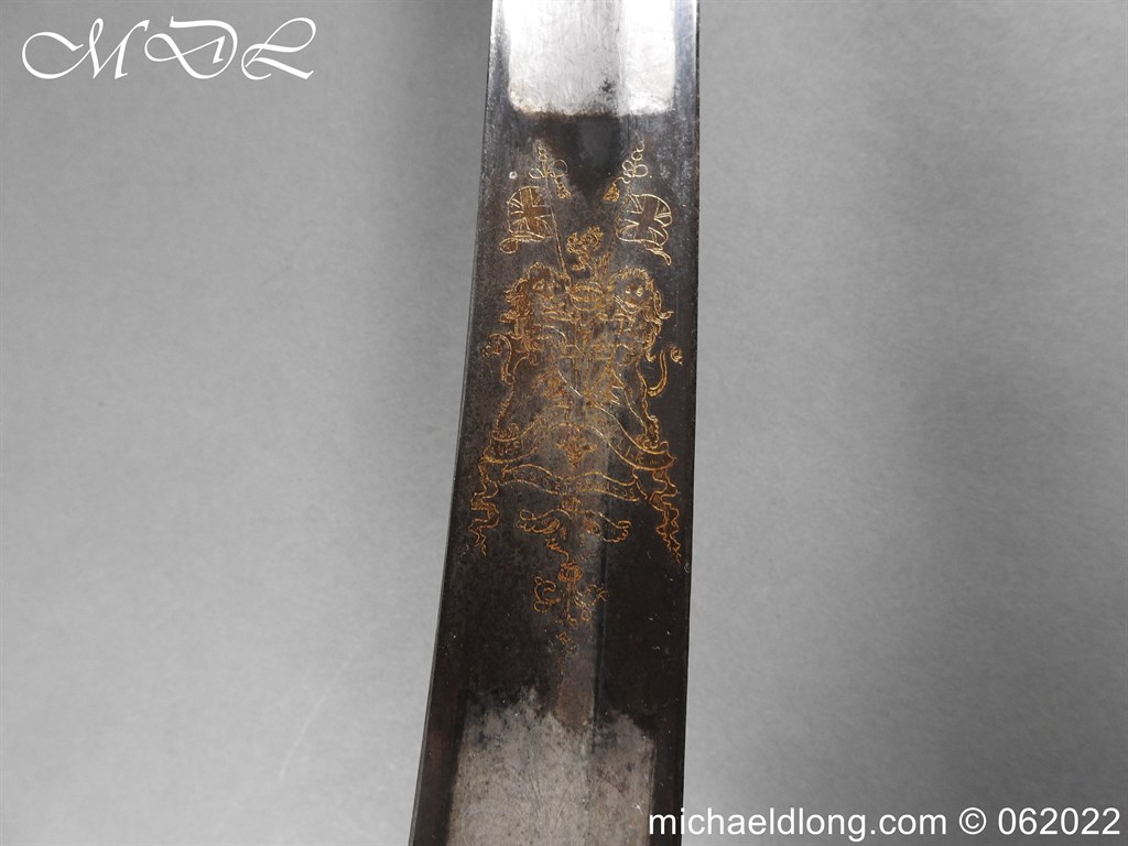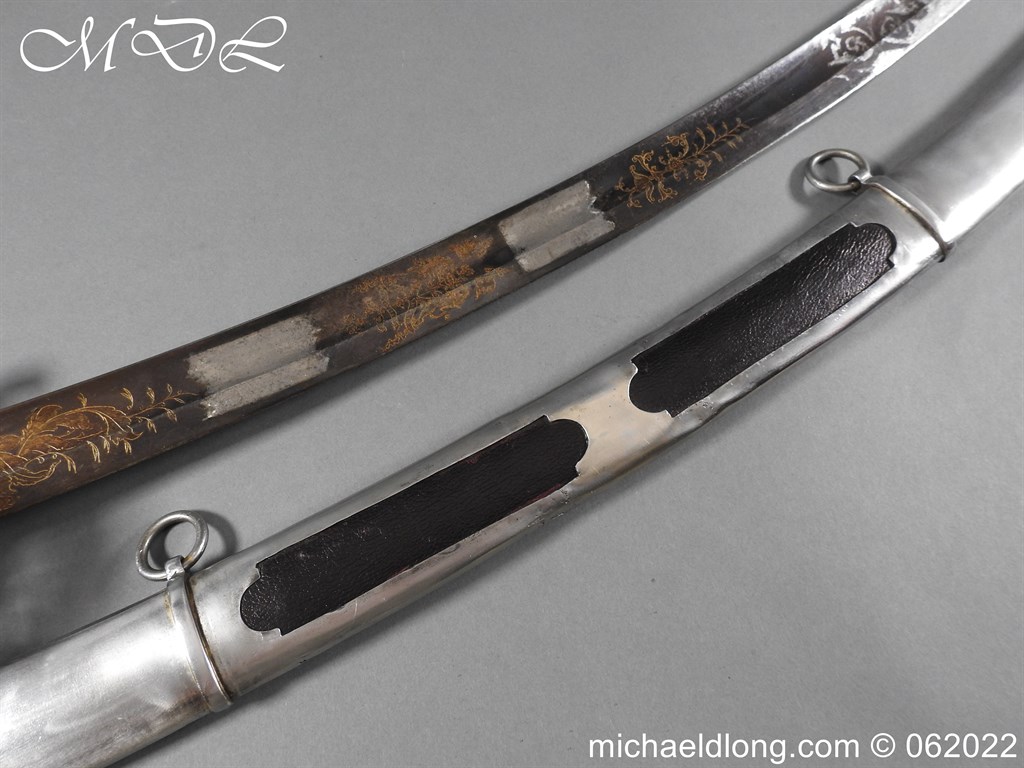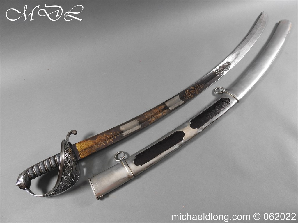 East India Company Cavalry Sword c 1800 with steel half basket hilt pierced with scrolls and owner initials GSS. Turned down quill ion plane backstop and stepped pommel, the fish skin grip bound with silver wire. The curved blue and gilt blade etched with scrolled foliage and coats or arms with rampant lion holding orb plus crossed union flags and the motto Auspicio regis et senatus Anglae. Also there are 2clear panels to each side of the blade an it is complete with refurbished steel scabbard with leather inserts and two loose rings. Overall length 106cm the blade 90cm