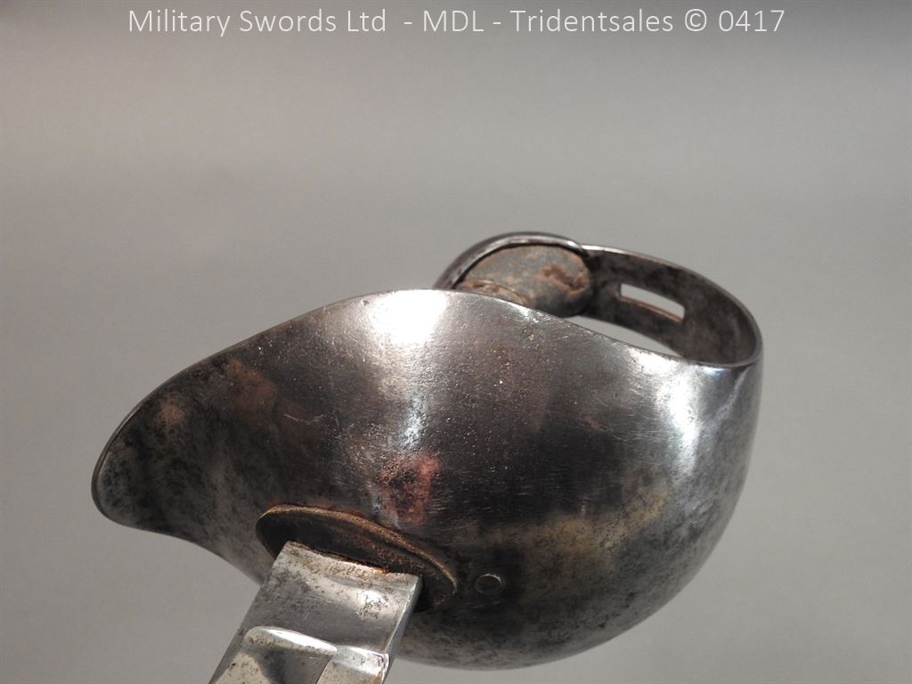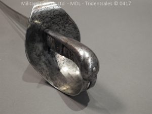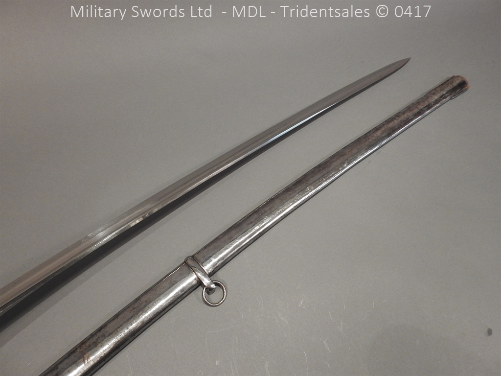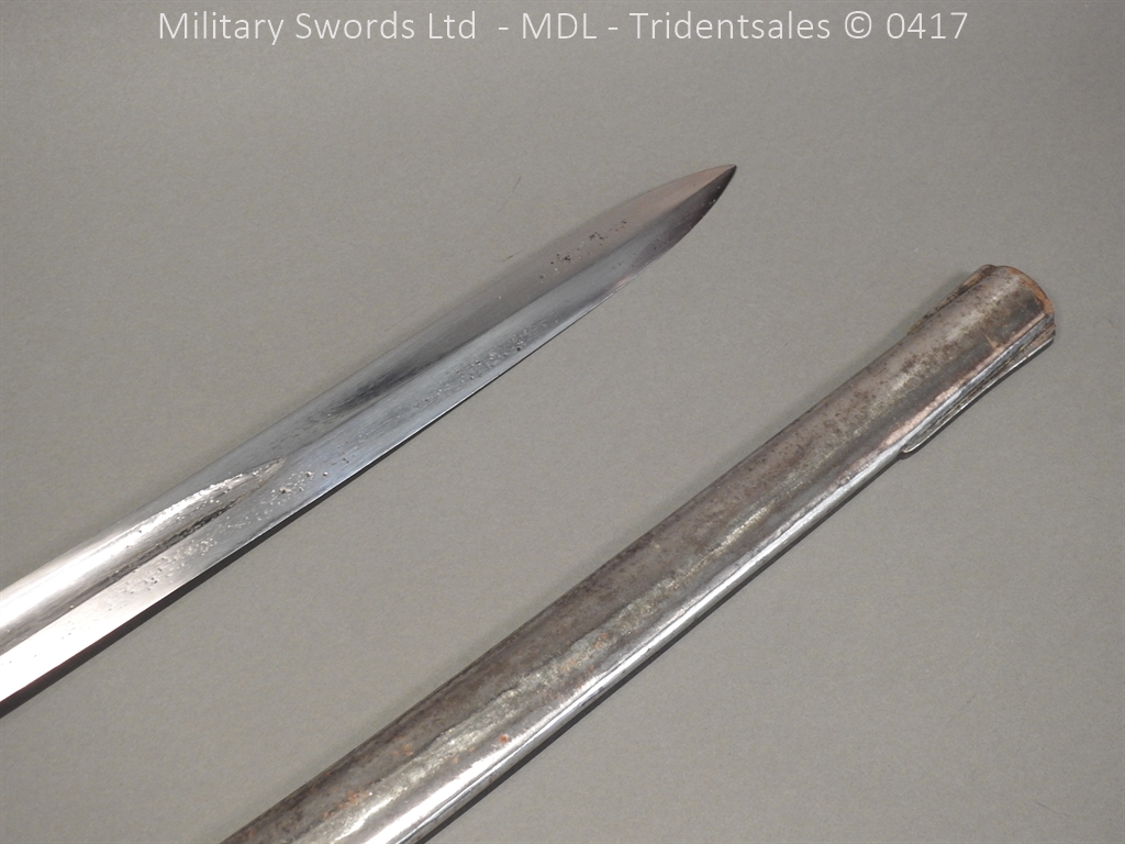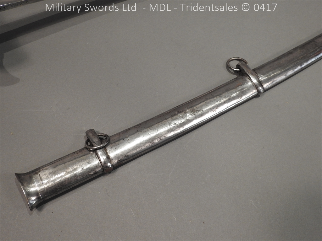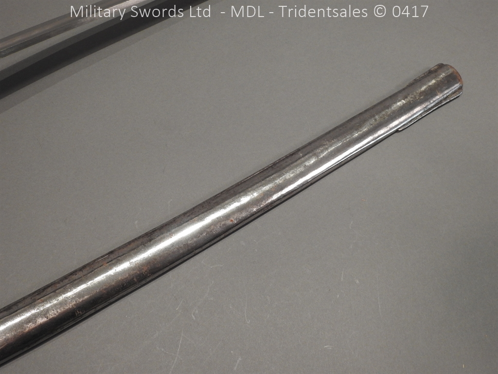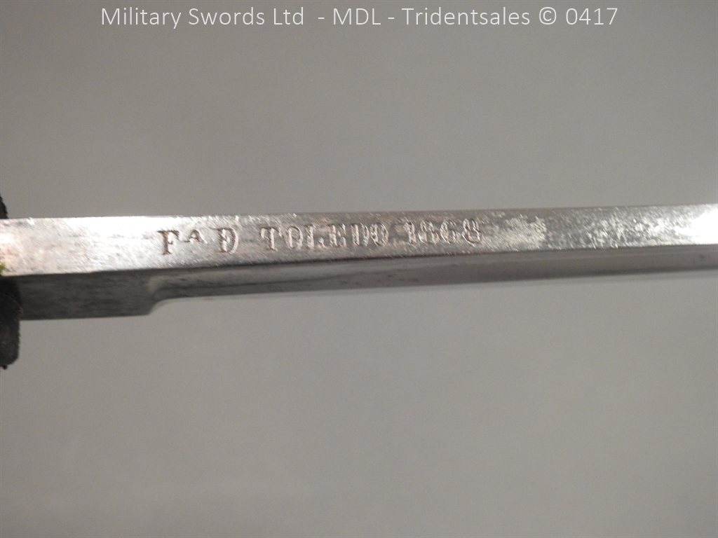 Slightly curved blade in very good condition. Double fuller for three quarters of its length. Blunt edge marked ‘Fba. De Toledo 1868’. Full iron handguard. Metal backstrap with ‘ears’. Fish skin grip with 15 turns of wire. Scabbard with two hangers and marked ‘Toledo’ on front side. Size: Overall 107cm Blade 86cm